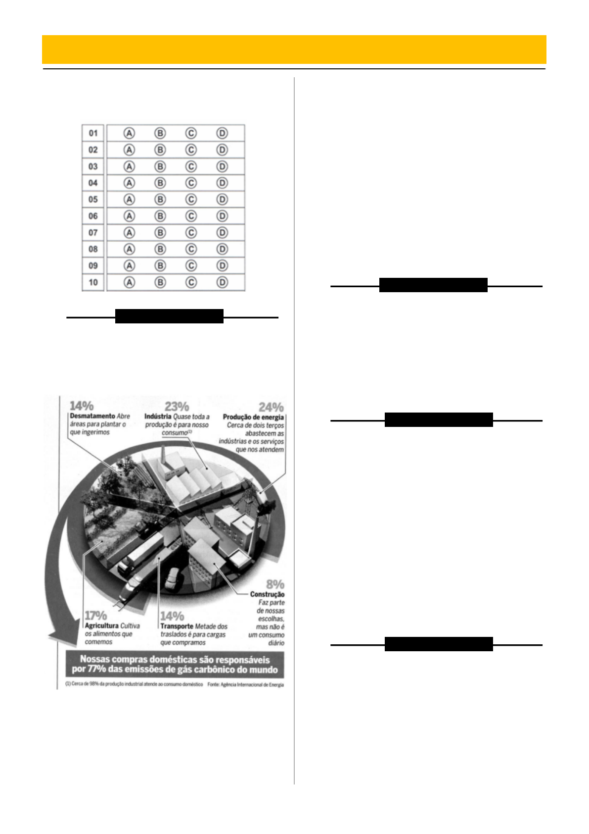 Atividade 9º Ano Ciências da Natureza ESCOLA: ________________________ Prof.:____________________________ Nome: ___________________________ D1 ––––––––– QUESTÃO 01 –––––––––– Nossas compras domésticas (familiares) contribuem efetivamente para as emissões de gás carbônico na atmosfera. O quadro a seguir ilustra as principais fontes de emissões mundiais de gás carbônico. Compre verde: como nossas compras podem ajudar a salvar o planeta. Época, n. 515, 31 março 2008. De acordo com as informações dadas no quadro ilustrativo marque a afirmativa correta: A) A energia gasta na produção em geral não depende dos hábitos consumistas das pessoas. B) Todo e qualquer tipo de emissão de gás carbônico na atmosfera é de responsabilidade e competência do estado. C) Mudanças positivas de hábitos domésticos da sociedade podem impactar positivamente nas emissões de poluentes atmosféricos. D) Não existe relação entre o desmatamento e a produção em geral, pois, quem desmata não é quem produz. D22 ––––––––– QUESTÃO 02 –––––––––– São produtos exclusivamente derivados do petróleo: A) Biomassa e etanol B) Gasolina e etanol C) Etanol e óleo diesel D) Gasolina e querosene D18 –––––––––– QUESTÃO 03 ––––––––– Considere os seguintes materiais: 1 - Madeira 2 - Vidro 3 - Algodão 4 - Corpo humano 5 - Ouro 6 - Alumínio Entre os materiais listados, são bons condutores de energia: A) 1; 2; 3 B) 3; 4; 5 C) 4; 5; 6 D) 2; 3; 4 D10 –––––––––– QUESTÃO 04 ––––––––– O corpo humano apresenta um órgão com as seguintes funções: proteger o corpo contra agentes físicos, químicos e biológicos, além de ajudar a regular a temperatura do corpo e receber estímulos do ambiente. Assinale a alternativa que tenha este órgão. A) Coração B) Olho C) Pele 1 Atividade 9º Ano Ciências da Natureza D) Fígado D1 ––––––––– QUESTÃO 05 –––––––––– O uso de fontes alternativas de energia nos a ajuda a preservar a natureza. Sabendo disso, Rafael tem em sua casa um equipamento levar a água até a caixa d´água e outro para aquecer a água. O primeiro, funciona através da força dos ventos, enquanto que o segundo equipamento utiliza o calor do sol. Assim, estes aparelhos de Rafael utilizam energia A) elétrica e química (óleo diesel). B) eólica e solar. C) eólica e elétrica. D) elétrica e solar. D18 ––––––––– QUESTÃO 06 –––––––––– A potência de uma lâmpada pode determinar o seu consumo de energia. Quanto maior a potência, maior será o consumo energético. Desta forma, a potência de uma lâmpada pode ser medida em: A) Volts B) Ampéres C) Joules D) Watts D17 –––––––––– QUESTÃO 07 –––––––––– Considere o seguinte experimento: Deixe cair de uma mesma altura, duas folhas de papel iguais, sendo uma aberta e outra amassada. Porque a folha amassada chega primeiro ao hão? A) pesa mais que a folha aberta. B) tem maior massa do que a folha aberta. C) oferece menor resistência ao ar. D) oferece maior resistência ao ar. D10 ––––––––– QUESTÃO 08 –––––––––– Os hormônios são os responsáveis pelas mudanças que ocorrem no corpo dos adolescentes durante a puberdade. O sistema responsável pela produção e ação dos hormônios corresponde ao: A) Sistema circulatório B) Sistema nervoso C) Sistema endócrino D) Sistema vascular D16 –––––––––– QUESTÃO 09 ––––––––– Na figura temos a imagem de uma campainha elétrica Na campainha ocorre a transformação de energia elétrica em: A) Energia luminosa B) Energia eólica C) Energia térmica D) Energia sonora D15 –––––––––– QUESTÃO 10 ––––––––– Observe a figura: Nesta figura temos a representação do efeito estufa. Desta forma a fonte de energia que mais contribui para a intensificação do efeito estufa: A) Hidrelétrica B) Nuclear C) Petróleo D) Biomassa 2 Atividade 9º Ano Ciências da Natureza GABARITO 01 C 02 D 03 C 04 C 05 B 06 D 07 C 08 C 09 D 10 C 3