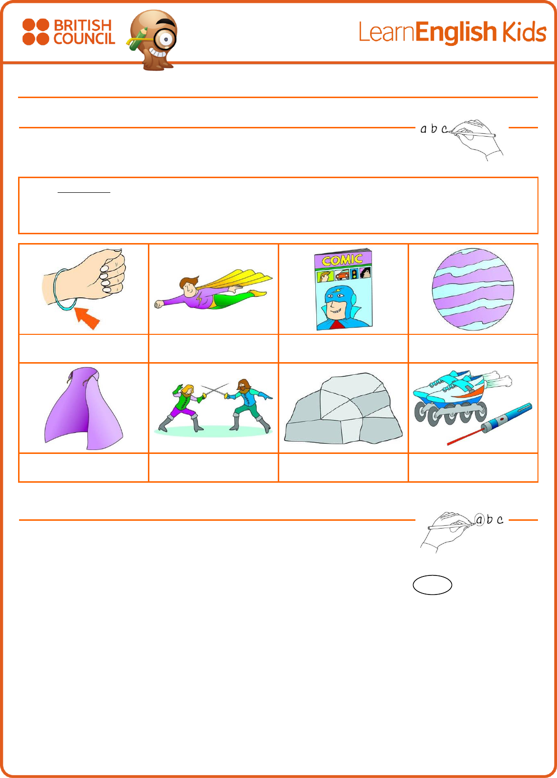 www.britishcouncil.org/learnenglishkids © The British Council, 2016 The United Kingdom’s international organisation for educational opportunities and cultural relations. We are registered in England as a charity. Superheroes 1. What’s the word? Write the word under the pictures. superhero cape gadgets comic planet rock fighting bracelet superhero 2. True or false? Read the fact file on the next page and circle true or false for these sentences. a. Superheroes often have super powers. true false b. Some superheroes wear a mask to hide their face. true false c. Superman first appeared on TV in 1938. true false d. Wonder Woman was created before Superman. true false e. Robin is Batman’s sidekick. true false f. The first Incredible Hulk was green. true false www.britishcouncil.org/learnenglishkids © The British Council, 2016 The United Kingdom’s international organisation for educational opportunities and cultural relations. We are registered in England as a charity. 3. Read Read the fact file and complete exercise 2 on the previous page. 4. What do you think? What was the most interesting fact about superheroes? Do you prefer stories about superheroes in comics or on TV? Who’s your favourite superhero? Why? What super power would you really like to have?