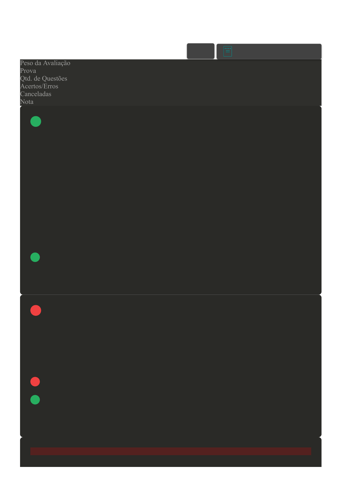 16/04/2022 14:00 Avaliação I - Individual 1/5 Prova Impressa GABARITO | Avaliação I - Individual (Cod.:739114) Peso da Avaliação 1,50 Prova 44278456 Qtd. de Questões 10 Acertos/Erros 7/1 Canceladas 2 Nota 9,00 Com a chegada dos europeus ao Brasil, principalmente a partir das navegações nos séculos XV e XVI, houve um grande choque cultural no encontro com os índios nativos que viviam aqui. Os nativos possuíam um sistema cultural muito diferente dos povos europeus, o que causou grande estranhamento. Sobre os primeiros habitantes do Brasil, classifique V para as sentenças verdadeiras e F para as falsas: ( ) Os indígenas encontrados no litoral pelos portugueses eram principalmente das tribos Tupi. ( ) Os indígenas, antes da chegada dos europeus, viviam em uma sociedade solidária, onde: todos eram donos das terras, os alimentos produzidos e caçados, bem como as tarefas, eram divididas. ( ) Após a chegada dos portugueses, as línguas indígenas foram completamente extintas e não influenciaram a língua portuguesa falada no Brasil. Assinale a alternativa que apresenta a sequência CORRETA: A V - V - V. B F - V - F. C V - V - F. D F - F - V. Os Imigrante Europeus e Asiáticos, que aportaram no Brasil, trouxeram consigo uma bagagem de conhecimento que aos poucos se tornaram parte da paisagem brasileira . Mudanças que foram sentidas nas artes, culinária, arquitetura e no modo de vida. Há uma obra brasileira que mostra a miscigenação e a intenção de todos imigrantes, um trabalho remunerado na Indústria. Sobre o nome da obra e o artista que pintou esta realidade, assinale a alternativa CORRETA: A Retirantes - Cândido Portinari. B Trabalhadores - Tarsila do Amaral. C Operários - Tarsila do Amaral. D Cafezal - Cândido Portinari. Atenção: Esta questão foi cancelada, porém a pontuação foi considerada. VOLTAR A+ Alterar modo de visualização 1 2 16/04/2022 14:00 Avaliação I - Individual 2/5 Cultura refere-se ao que é produzido pelo homem, ser social que aprende pela relação com outros. Para Tylor (1871, p. 1), cultura ou civilização é "este todo complexo que inclui conhecimento, crença, arte, leis, moral, costumes, e quaisquer outras capacidades e hábitos adquiridos pelo homem enquanto membro da sociedade" (TYLOR, 1871 p.1). Sobre cultura, analise as afirmativas a seguir: I- É aquilo que é dado pela natureza, é biológico. II- Os diferentes utensílios utilizados para comer são exemplos de instrumentos próprios de determinadas culturas. III- A palavra é de origem latina e seu significado original está ligado às atividades agrícolas. Vem do verbo latino colere, que quer dizer cultivar. IV- O estudo da cultura contribui no combate a preconceitos, oferecendo uma plataforma firme para o respeito e dignidade nas relações humanas. Assinale a alternativa CORRETA: ONTE: TYLOR, Edward Burnett. Primitive Culture: Researches into the Development of Mythology, Philosophy, Religion, Art, and Custom. London: John Murray, 1871. A Somente a afirmativa II está correta. B As afirmativas II, III e IV estão corretas. C As afirmativas I, III e IV estão corretas. D As afirmativas I, II e III estão corretas. A cultura é classificada em três grandes áreas diferentes. Cada uma destas áreas possui características específicas e que muitas vezes se contrapõem umas às outras. Sobre os tipos de cultura, associe os itens, utilizando o código a seguir: I- Cultura Erudita. II- Cultura de Massa. III- Cultura Popular. ( ) Envolve todas as camadas sociais e é resultado dos meios de comunicação, como o rádio, a televisão, o cinema, entre outros. ( ) Contempla a maior parte do povo e é transmitida principalmente por meio oral e de geração em geração. ( ) Está associada às classes dominantes e é legitimada por instituições acadêmicas, tais como universidades. Assinale a alternativa que apresenta a sequência CORRETA: A I - II - III. B III - I - II. C II - III - I. D II - I - III. 3 4 16/04/2022 14:00 Avaliação I - Individual 3/5 A recuperação da herança cultural africana deve levar em conta o que é próprio do processo cultural: seu movimento, pluralidade e complexidade. Não se trata, portanto, do resgate ingênuo do passado nem do seu cultivo nostálgico, mas de procurar perceber o próprio rosto cultural brasileiro. O que se quer é captar seu movimento para melhor compreendê-lo historicamente. Sobre a contribuição africana no que diz respeito às manifestações culturais, assinale a alternativa CORRETA: Sobre a contribuição africana no que diz respeito às manifestações culturais, assinale a alternativa CORRETA: A Derivam da interação entre valores africanos e a experiência histórica brasileira. B Permanecem como reprodução dos valores e costumes africanos. C Contribuem para o distanciamento cultural entre negros e brancos no Brasil atual. D Demonstram a menor complexidade cultural dos africanos em relação aos europeus. Atenção: Esta questão foi cancelada, porém a pontuação foi considerada. A escravatura teve grande impacto para a formação cultural brasileira. A partir desta prática, negros provenientes de diversos lugares da África foram trazidos para o Brasil para trabalharem em diferentes lugares do país e nas mais variadas funções. Sobre a formação cultural do povo brasileiro, classifique V para as sentenças verdadeiras e F para as falsas: ( ) Grande parte dos primeiros africanos que chegaram ao Brasil para servir de escravos vieram do Sudão, Costa do Marfim, Nigéria, Angola e Moçambique. ( ) O Brasil importava da África não somente os escravos que trabalhavam nos canaviais, mas também técnicos para as minas, donas de casa para os colonos, criadores de gado e comerciantes de panos e sabão. ( ) Os negros, ao desembarcarem no Brasil, eram batizados e recebiam nomes católicos. ( ) Na senzala, aproveitavam-se das sobras de carnes, do aipim indígena e das verduras, além dos temperos africanos. Assinale a a