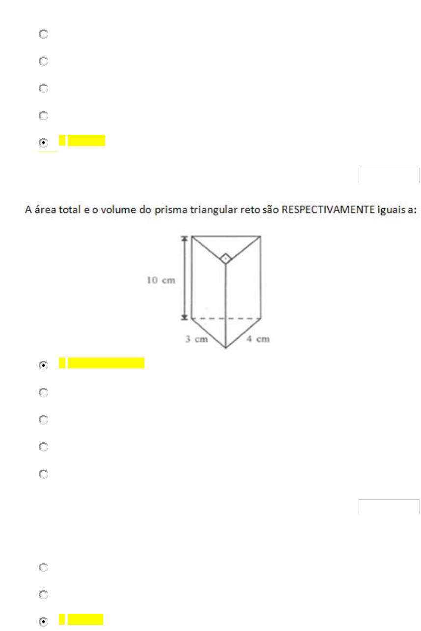 METODOLOGIA DE ENSINO DE MATEMÁTICA: ESPAÇO E FORMA - 40h AS IV PERGUNTA 1 A área da secção meridiana de um cilindro equilátero é 100 cm2. Seu volume é: a. 50π m3 b. 100π m3 c. 150π m3 d. 200π m3 e. 250π m3 0,25 pontos PERGUNTA 2 a. 120 cm2 e 60 cm3 b. 60 cm2 e 120 cm3 c. 180 cm2 e 90 cm3 d. 90 cm2 e 180 cm3 e. 120 cm2 e 90 cm3 0,25 pontos PERGUNTA 3 Qual é a área lateral de uma pirâmide com 12 cm de altura, tendo como base um quadrado de lado 10 cm? a. 280 cm2 b. 270 cm2 c. 260 cm2 d. 250 cm2 e. 240 cm2 0,25 pontos PERGUNTA 4 O volume de um cone circular reto de diâmetro da base igual a 6 cm e de geratriz 5 cm é: a. 6πcm2 b. 8πcm2 c. 10πcm2 d. 12πcm2 e. 14πcm2