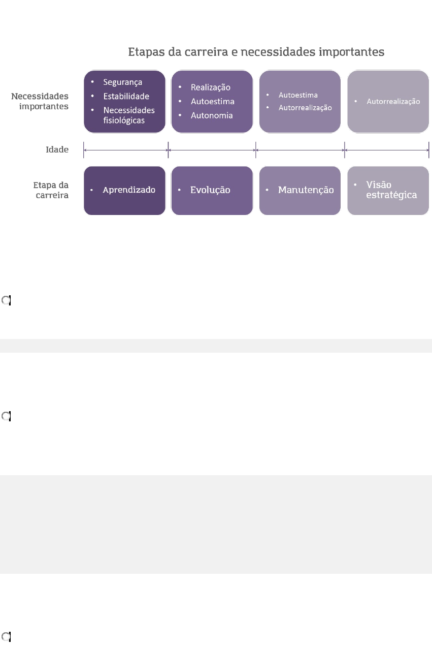 Carreiras 1. Observe a figura a seguir. Clique na imagem para ampliar. De acordo com a figura, as etapas da carreira mencionadas representam: Resposta incorreta. A. Ser realista, artístico, social e convencional. Essas categorias configuram-se como opções de carreira, e não como etapas. Resposta incorreta. B. Avaliação de desempenho, satisfação pessoal, aposentadoria e visão de negócio. Nenhuma dessas características configuram as etapas de carreira, pois a avaliação de desempenho é uma ferramenta de medição de produtividade, a satisfação pessoal é um estado psicológico de cada indivíduo, a aposentadoria é uma fase da carreira e a visão de negócio é uma estratégia de competição comum a todos os empreendedores. Resposta incorreta. C. Início, meio, pré-aposentadoria e aposentadoria. Início, meio, pré-aposentadoria e aposentadoria constituem as fases da carreira, cada uma com suas particularidades, problemas e ações corretivas, e não as etapas. Você acertou! D. As quatro etapas da carreira profissional. A figura representa as quatro etapas da carreira profissional, pois descrevem as mudanças nas expectativas do indivíduo ao longo da carreira. Resposta incorreta. E. A pirâmide de Maslow. A pirâmide de Maslow está sintetizada nas "necessidades importantes", e não nas etapas da carreira. 2. Dada a crescente competitividade do mercado de trabalho, que resulta, dentre outros, em exigência cada vez maior do jovem ingressante, tanto com relação ao nível de formação e especialização, quanto com relação às habilidades sociais e inteligência emocional para lidar com toda a sorte de situações, a fase inicial da carreira de um jovem é marcada por diferentes situações. Dentre muitas, podemos realçar as dificuldades do jovem para demonstrar engajamento e disposição face aos enfrentamentos necessários relacionados às situacionalidades do trabalho. Isso ocorre especialmente a partir do momento em que o jovem se insere em uma realidade complexa e em constante transformação, tal como o dia-a-dia em uma organização, ao iniciar sua carreira. Isso posto, com relação às causas das dificuldades intrínsecas à fase inicial de carreira, conforme Ivancevich (2008), escolha uma alternativa correta, abaixo: Resposta incorreta. A. O hiato existente entre as “aspirações irreais e atribuições iniciais rotineiras, resultam em insatisfação, geralmente em baixa satisfação da necessidade de crescimento e autorrealização” (IVANCEVICH, 2008, p. 453), é caracterizado pelo subaproveitamento do jovem gestor, na análise do autor. Resposta incorreta. B. O hiato existente entre as “aspirações irreais e atribuições iniciais rotineiras, resultam em insatisfação, geralmente em baixa satisfação da necessidade de crescimento e autorrealização” (IVANCEVICH, 2008, p. 453), é caracterizado pelo subaproveitamento do jovem gestor, na análise do autor. Resposta incorreta. C. O autor destaca que muitos gestores não estão suficientemente preparados para dar feedback e acompanhar a avaliação de desempenho dos jovens em fase inicial de carreira, o que implica em mais dificuldades de desenvolvimento para este jovem, especialmente porque ainda não conhece valores, crenças e cultura organizacional a ponto de identificar as expectativas que a organização têm sobre seu trabalho. Resposta incorreta. D. Quando a empresa perde um jovem talento pode, também, perder dinheiro, não somente pela expectativa esvaziada relacionada ao que ele poderia performar, mas também porque terá de refazer processos de captação, seleção, dentre outros (como os custos relacionados à remuneração, desligamento). Dessa forma, investir na retenção destes profissionais, por meio, por exemplo, do desenvolvimento de um planejamento de carreira pode custar menos à empresa do que a perda de funcionários com potencial subutilizado. Você acertou! E. Dentre as diferentes práticas organizacionais que podem atenuar as dificuldades de desenvolvimento do jovem em fase inicial de carreira em uma organização, podemos destacar, com base em Ivancevich (2008), a responsabilidade do recrutador ao apresentar, com transparência, as possibilidades e potências de desenvolvimento dentro do escopo da vaga, evitando frustrações iniciais inerentes ao encontro do jovem com as funções que deve desempenhar. Tal ação facilitaria outros processos de gestão de pessoas no que tange à retenção, por exemplo, se consideramos a importância do desenvolvimento dos talentos até que atinjam diferentes níveis de satisfação e desempenho profissional, conciliando expectativas individuais e organizacionais para as diferentes etapas da carreira profissional. 3. John L. Holland, especialista em orientação profissional, propôs e pesquisou uma teoria de opção de carreira, a qual o especialista considera uma expressão da personalidade, e não um fato aleatório — embora a casualidade possa ser um componente. Acredita, também, que as realizações e os resultados profissionais dependem da congruência entre a personalidade e o ambiente de trabalho. Nesse sentindo, Holland defende que cada indivíduo se assemelha, até certo ponto, a alguns tipos de personalidade. Identifique a alternativa correta. Você acertou! A. Realista: esse trabalhador prefere atividades que envolvam a manipulação de maquinários ou ferramentas. A teoria realista reflete exatamente a personalidade de um indivíduo que trabalha com máquinas ou ferramentas — por exemplo, um torneiro mecânico. Resposta incorreta. B. Social: tem habilidade ou é capaz de desenvolver as habilidades necessárias para realizar o trabalho. Esse indivíduo tem por foco desenvolver as habilidades de trabalhar com pessoas, e não o desenvolvimento de ações para realizar o trabalho. Resposta incorreta. C. Empreendedor: determinado de personalidade forte, maior é a probabilidade dele apresentar os comportamentos de procura