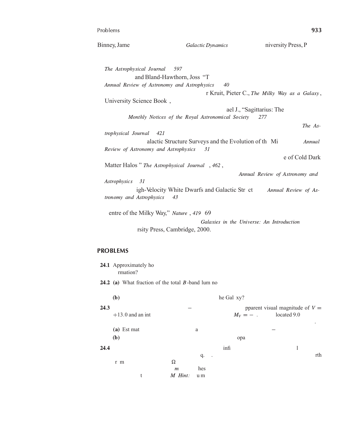Problems 933 Binney, James, andTremaine, Scott, GalacticDynamics , Princeton University Press, Prince- ton, 1987. Eisenhauer, F., et al., “A Geometric Determination of the Distance to the Galactic Center,” The Astrophysical Journal , 597 , L121, 2003. Freeman, Ken, and Bland-Hawthorn, Joss, “The New Galaxy: Signatures of Its Formation,” Annual Review of Astronomy and Astrophysics , 40 , 487, 2002. Gilmore, Gerard, King, Ivan R., and van der Kruit, Pieter C., The Milky Way as a Galaxy , University Science Books, Mill Valley, CA, 1990. Ibata, Rodrigo A., Gilmore, Gerard, and Irwin, Michael J., “Sagittarius: The Nearest Dwarf Galaxy,” Monthly Notices of the Royal Astronomical Society , 277 , 781, 1995. Kuijken, Konrad, and Tremaine, Scott, “On the Ellipticity of the Galactic Disk,” The As- trophysical Journal , 421 , 178, 1994. Majewski, S. R., “Galactic Structure Surveys and the Evolution of the Milky Way,” Annual Review of Astronomy and Astrophysics , 31 , 1993. Navarro, Julio F., Frenk, Carlos F., and White, Simon, D. M., “The Structure of Cold Dark Matter Halos,” The Astrophysical Journal , 462 , 563, 1996. Reid, Mark, “The Distance to the Center of the Galaxy,” Annual Review of Astronomy and Astrophysics , 31 , 345, 1993. Reid, Mark, “High-Velocity White Dwarfs and Galactic Structure,” Annual Review of As- tronomy and Astrophysics , 43 , 247, 2005. Schödel, R., et al., “A Star in a 15.2-year Orbit around the Supermassive Black Hole at the Centre of the Milky Way,” Nature , 419 , 694, 2002. Sparke, Linda S., and Gallagher, John S., Galaxies in the Universe: An Introduction , Cam- bridge University Press, Cambridge, 2000. PROBLEMS 24.1 Approximately how many times has the Sun circled the center of the Galaxy since the star’s formation? 24.2 (a) What fraction of the total B -band luminosity of the Galaxy is produced by each of the stellar components? Refer to Table 24.1. (b) What is the total bolometric magnitude of the Galaxy? 24.3 The globular cluster IAU C0923−545 has an integrated apparent visual magnitude of V = +13.0 and an integrated absolute visual magnitude of MV = −4.15. It is located 9.0 kpc from Earth and is 11.9 kpc from the Galactic center, just 0.5 kpc south of the Galactic midplane. (a) Estimate the amount of interstellar extinction between IAU C0923−545 and Earth. (b) What is the amount of interstellar extinction per kiloparsec? 24.4 Using the differential star count formula for an infinite universe of constant stellar number density and no interstellar extinction (Eq. 24.5), show that the amount of light arriving at Earth from a cone of solid angle± diverges exponentially as the length of the cone increases without bound (or, equivalently, as m approaches infinity). Assume that all stars in the field have the same absolute magnitudeM . Hint: You may find the discussion leading up to Eq. (3.5) helpful. 934 Chapter 24 The Milky Way Galaxy TABLE 24.2 Hypothetical Differential Star Count Data. V log10 AM V log10 AM 4 −2.31 12 2.24 5 −1.71 13 2.59 6 −1.11 14 2.94 7 −0.51 15 3.29 8 0.09 16 3.89 9 0.69 17 4.49 10 1.29 18 5.09 11 1.89 19 5.69 24.5 (a) From Eq. (24.5), derive an expression for log10 AM (m) as a function of m for stars of the same absolute magnitude and M–K spectral classification, assuming a constant stellar number density. (b) If observations are made in apparent magnitude bins separated by one (i.e., δm = 1), calculate ¶ log10 AM (m) ≡ log10 AM (m+ 1)− log10 AM (m). (c) If the results of observations show that ¶ log10 AM (m) is always less than the result found in part (b), what can you conclude about the distribution of stars in the region under investigation? [Recall that Eq. (24.5) applies to the case of an infinite universe of constant stellar number density and no interstellar extinction.] 24.6 (a) Plot log10 AM as a function of V for the hypothetical data given in Table 24.2. Assume that all stars included in the differential star counts are main-sequence A stars of absolute visual magnitude MV = 2. (b) Assuming a constant density of stars out to at least V = 11, how much interstellar extinction is present to that limit (express your answer in magnitudes)? Hint: Consider the slope of the curve. You may also find the results of Problem 24.5 helpful. (c) What is the distance to the stars corresponding to V = 11? (d) If the solid angle over which the data were collected is 0.75 square degrees, or 2.3× 10−4 sr, estimate the number density nM (M, S) of A stars out to V = 11. (e) Give two possible explanations for the change in slope between V = 11 and V = 15. 24.7 (a) Assume that a cloud of gas and dust is encountered along the line of sight for the data given in Table 24.2 and plotted in Problem 24.6. Assume also that the stellar number density found in Problem 24.6 is constant along the entire line of sight. Estimate the amount of extinction (in magnitudes) that is due to the cloud. Hint: How would the graph change if the cloud were not present? The cloud’s presence may be revealed through reddening. (b) If the density of gas and dust in the cloud leads to an extinction rate of 10 mag kpc−1, what is the length of the cloud along the line of sight? Graphs of log10 AM vs. m that demonstrate changes in slope and then resume the original slope at larger values of m are referred to Wolf diagrams, after Maximilian Wolf (1863–1932), who first used them to explore the properties of interstellar clouds. 24.8 (a) Plot the thin disk’s luminosity density (Eq. 24.10) as a function of z for R = 8 kpc. Problems 935 (b) Prove that for z¸ z0, L(R, z) ³ 4L0e−R/hRe−2z/z0 and so z0 = 2zthin is the effective scale height of the luminosity density function. 24.9 (a) From the data given in Table 24.1, and, using a typical value for the temperature of hydrogen in the interstellar medium of 15 K, estimate the average thermal energy density of hydrogen gas in the disk of the Galaxy. For this problem, assu