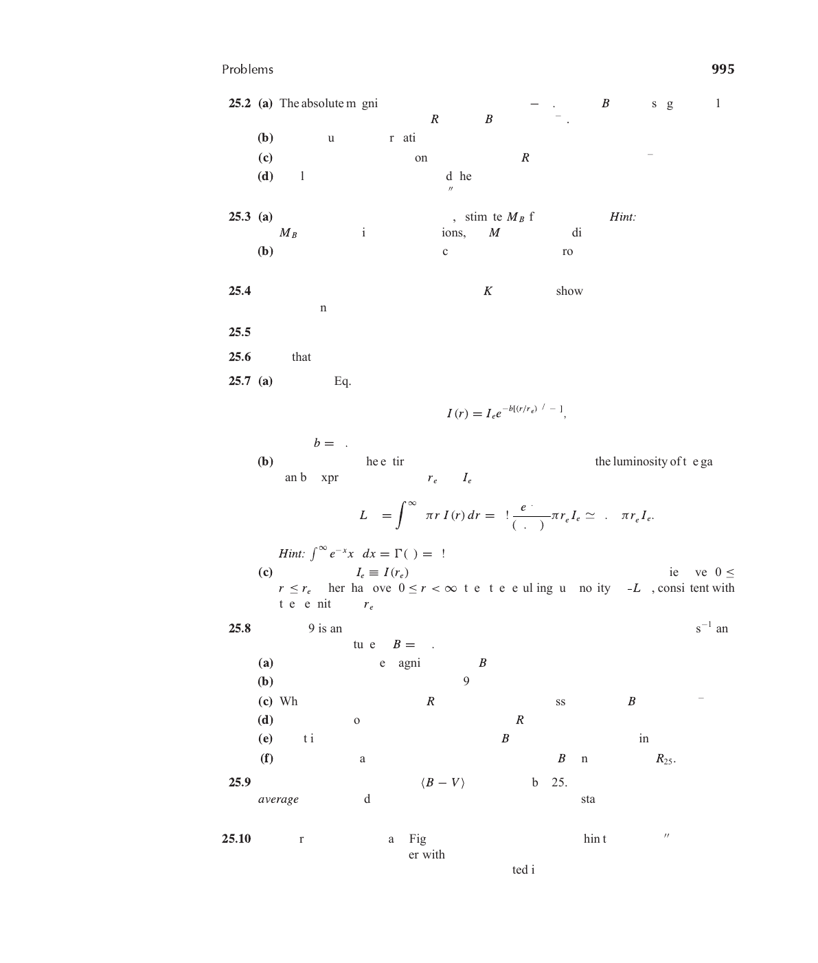 Problems 995 25.2 (a) The absolute magnitude of M101, an Sc galaxy, is −21.51 in theB band. Using Eq. (25.11), estimate its isophotal radius (R25) at 25 B-mag arcsec−2. (b) Use the Tully–Fisher relation (Eq. 25.7) to estimate the rotational velocity of M101. (c) Estimate the angular rotation speed of a star at R25, in units of arcsec yr−1. (d) Could van Maanen have detected the rate of rotation of M101? How long would it take for the galaxy to rotate through 1±±? 25.3 (a) From the data given in Table 24.1, estimate MB for our Galaxy. Hint: Be sure to include MB for the Sun in your calculations, not Mbol ; see Appendix G. (b) Using the Tully–Fisher relation, calculate the maximum rotation speed of the Galactic disk and compare your answer with the observational value given in Section 24.3. 25.4 Neglecting the effects of extinction and the K-correction, show that the surface brightness of a galaxy is independent of its distance from the observer. 25.5 Prove that Eq. (25.2) follows directly from Eq. (24.13). 25.6 Prove that Eq. (25.3) follows directly from Eq. (24.10). 25.7 (a) Show that Eq. (24.13) can be written as I (r) = Iee −b[(r/re) 1/4−1], where b = 7.67. (b) Integrating over the entire surface brightness profile, show that the luminosity of the galaxy can be expressed in terms of re and Ie as Ltot = » ∞ 0 2πr I (r) dr = 8! e 7.67 (7.67)8 πr2e Ie ¶ 7.22πr 2 e Ie. (25.47) Hint: ¼∞ 0 e −xx7 dx = ¸(8) = 7!. (c) Recalling that Ie ≡ I (re), show that if the integration of Eq. (25.47) is carried over 0 ≤ r ≤ re rather than over 0 ≤ r <∞, then the resulting luminosity is 12Ltot , consistent with the definition of re. 25.8 NGC 2639 is an Sa galaxy with a measured maximum rotational velocity of 324 km s−1 and an apparent magnitude of B = 12.22 mag (after making corrections for extinction). (a) Estimate its absolute magnitude in the B band from the Tully–Fisher relation. (b) Determine the distance to NGC 2639 using its distance modulus. (c) What is the galaxy’s radius (R25) at a surface brightness level of 25 B-mag arcsec−2? (d) Find the mass of NGC 2639 that is interior to R25. (e) What is the luminosity of the galaxy in the B band? (Refer to the hint in Problem 25.3.) (f) Calculate the mass-to-light ratio for NGC 2639 in the B band, interior to R25. 25.9 Referring to the color indices (³B − V ´) given in Table 25.1 and Appendix G, estimate the average (or integrated) spectral classification of main-sequence stars in spiral galaxies of types Sa, Sb, and Sc. 25.10 Use the rotation curve data in Fig. 25.14 to estimate the mass within the central 1±± of the center of M32. Compare your answer with the value obtained using the velocity dispersion data in Example 25.2.1 and with the estimated range quoted in that example. 996 Chapter 25 The Nature of Galaxies 25.11 (a) From the data shown in Fig. 25.37 for the stellar rotational velocities near the center of M31, estimate the amount of mass within 1±± of the center of the galaxy. Compare your answer with the value quoted in the text. (b) Estimate the amount of mass within the central 1±± based on the velocity dispersion data. (c) Comment on the source of the asymmetries evident in Fig. 25.37. Recall Fig. 25.13. 25.12 Beginning with the general expression for the position vector in rectangular coordinates r = x î+ yĵ + zk̂, show that the vector can be represented in cylindrical coordinates by Eq. (25.16). 25.13 Show that the acceleration vector is given by Eq. (25.18) in cylindrical coordinates. Hint: Note that the unit vectors êR and êφ are position-dependent and therefore time-dependent. You may find their relationships with rectangular-coordinate unit vectors helpful. 25.14 Using the solar motion data given in Chapter 24, estimate the amplitude of the Sun’s excursion in the radial direction relative to a perfectly circular orbit. Assume that the Sun is currently at the midpoint of its oscillation. Does your result represent a minimum or a maximum estimate of the actual deviation? 25.15 (a) From the information given in the text, derive Eq. (25.37) for the square of the solar epicycle frequency. (b) Show that Eq. (25.38) follows directly from Eq. (25.37). Rotation curve Velocity dispersion –300 –200 –100 0 100 200 300 50 100 150 200 250 300 350 400 0 V (k m s– 1 ) ³ (k m s –1 ) –1.5 –1.0 –0.5 0.0 0.5 1.0 1.5 r (arcsec) FIGURE 25.37 The stellar velocity dispersion and rotational velocities of stars near the center of M31, measured along the major axis of the bulge. Given the distance to Andromeda of 770 kpc, 1±± corresponds to a linear distance from the center of 3.7 pc. (Data from Bender et al., Ap. J., 631, 280, 2005.) Problems 997 25.16 Determine the epicycle axis ratio, χmax/ρmax , for a Keplerian orbit (a point mass orbiting a central, spherically symmetric mass). Hint: Begin with Eq. (25.37). 25.17 Show that if the surface brightness of an elliptical galaxy follows the r 1/4 law given by Eq. (24.13), then the average surface brightness over the area of a circular disk of radius re is given by ³I´ = 3.607Ie. Hint: Begin by rewriting the r1/4 law in the form I (r) = Iee −α[(r/re )1/4−1] and recall the definition of an integral average given in Problem 2.9. You may also find it helpful to write your integral in such a way that the limits of integration extend from zero to infinity. This can be done by considering the definition of re. 25.18 Show that the Holmberg radius of a galaxy obeying the r 1/4 law is related to the galaxy’s effective radius, re, and the corresponding isophotal surface brightness, μe, by rH = re (4.18 − 0.12μe)4 . 25.19 (a) Use the result of Problem 25.17 to show that ³μ´ = μe − 1.393 for an elliptical galaxy that follows the r1/4 law. (b) NGC 3091 has an effective radius of 10.07 kpc in the B band and an average surface brightness within the effective radius of 21.52 B -mag arcsec−2 . From this information, determine 