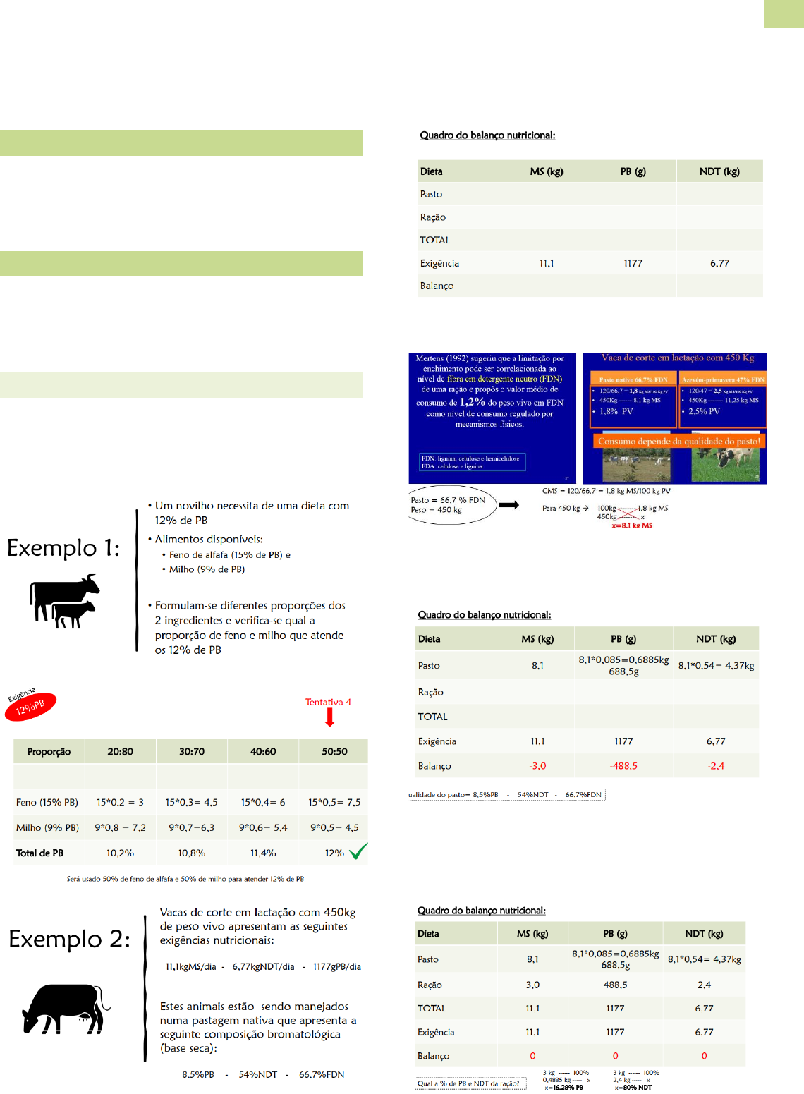 1 Rúbia Rogovski Medicina Veterinária UFRGS I Nutrição Métodos de formulação de ração ETAPAS • Caracterizar o animal • Definir exigências • Seleção dos alimentos MÉTODOS • Método da tentativa e erro • Equações lineares algébricas • Quadrado de Pearson TENTATIVA E ERRO • Consiste em aumentar ou diminuir a quantidade dos alimentos até que as exigências do animal sejam atendidas. 1º passo: descobrir qual é o consumo de pasto 120 = 1,2% divide pelo FDN: vai dar o peso de MS por 100kg de peso vivo. Multiplica o consumo (resultado do calculo anterior) com a PB e com a NDT. Comparar se a exigência está sendo atendida ou não. 2 Rúbia Rogovski Medicina Veterinária UFRGS I Nutrição EQUAÇÕES LINEARES ALGÉBRICAS • No método algébrico, as proporções de ingredientes para se obter uma mistura com certo teor de nutriente podem ser obtidas através do estabelecimento de equações algébricas e resolução de sistema de equações; • As equações algébricas são processos simples de calcular uma mistura de alimentos (Costa & Costa, 2008); • O cálculo é realizado valendo-se de um sistema de duas equações com duas incógnitas. QUADRADO DE PEARSON • O Quadrado de Pearson é um método que serve para determinar as porcentagens em que cada um dos alimentos deve ser misturado, de forma a se obter uma mistura com determinadas características. 3 Rúbia Rogovski Medicina Veterinária UFRGS I Nutrição