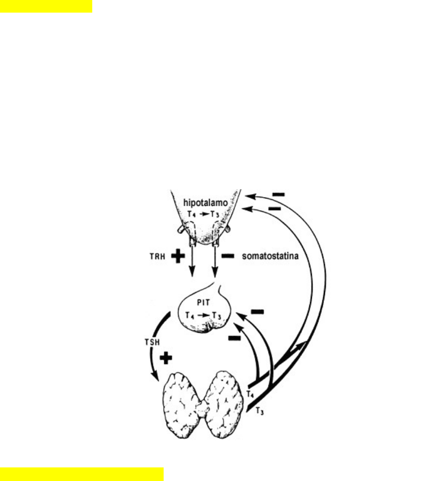 EXPOSICION BIOQUIMICA - EJE HIPOTALÁMICO-HIPOFISARIO-TIROIDEO _________________________________________________________________________ GENERALIDADES El eje hipotálamo HIPÓFISO – TIROIDEO (HHT) es de gran importancia para la regulación de la actividad tiroidea, Los componentes esenciales del sistema regulador de la función tiroidea lo constituyen la hormona hipotalámica liberadora de tirotropina (TRH), la tirotropina u hormona hipofisaria estimulante del tiroides (TSH) y la triyodotironina (T3). La TRH y la TSH ejercen un efecto estimulador, mientras que la T3 ejerce un efecto inhibidor. La tiroxina (T4)procedente de la glándula tiroides pasa al plasma y debe desyodarse a T3, la que interactúa con el receptor nuclear de la célula tirotropa hipofisaria. El eje tiroideo es un ejemplo clásico de un circuito de retroalimentación endócrino. En este eje se distinguen 3 escalones: hipotálamo, hipófisis y tiroides. La TRH hipotalámica estimula la producción hipofisaria de TSH, la cual, a su vez, estimula la síntesis y secreción de hormonas tiroideas. Estas, actúan por retroalimentación negativa inhibiendo la producción de TRH y TSH. SÍNTESIS Y SECRECIÓN TRH La TRH es un tripéptido derivado de la ruptura postraduccional de una molécula proteica de gran tamaño, la preproTRH. La TRH está presente en diversos órganos, como el hipotálamo y otras estructuras cerebrales, las células C de la tiroides, las células beta del páncreas, el miocardio, la próstata, los testículos y la placenta. Sin embargo, son las neuronas del núcleo paraventricular hipotalámico, las células que mayor cantidad de TRH sintetizan. Dichas neuronas proyectan sus axones a la eminencia media, estructura conectada a la adenohipófisis mediante los vasos portales hipotálamo-hipofisarios. Las neuronas hipotalámicas productoras de TRH son las únicas que regulan el eje HHT. La TRH liberada a la adenohipófisis a través de dichos vasos estimula la síntesis y la liberación de TSH, procesos que involucran la entrada de calcio a las celulas tirotropas y la activación de la protein-kinasa C. (enzimas que modifican otras moléculas, sobre todo proteínas, añadiendo grupos fosfato, es decir, las quinasas catalizan reacciones de fosforilación. causando un efecto de activacion que da a lugar a un mecanismo de transducción de señales y regulación a nivel celular) Diversas circunstancias pueden modificar la síntesis, la secreción y las acciones de la TRH. Así, los niveles séricos de las hormonas tiroideas pueden variar el proceso de ruptura de la preproTRH alterando la actividad de las enzimas prohormona convertasas. Ante un descenso de hormonas tiroideas, se produce la estimulación de la síntesis de TRH y de la expresión de las prohormonas convertasas del núcleo paraventricular, así como del número de receptores de TRH. Inversamente, el incremento de los niveles de hormonas tiroideas bloquea la capacidad de la TRH para estimular la liberación de TSH por la célula tirotropa hipofisaria. Los cuerpos de las neuronas productoras de TRH aparecen influenciados por catecolaminas, el neuropéptido Y, la leptina y la somatostatina, entre otros, que potencialmente influyen en la síntesis de la preproTRH. Por lo tanto, además de los niveles de hormonas tiroideas, el estrés, el frío o el estado nutricional pueden afectar a la síntesis de TRH. SÍNTESIS Y SECRECIÓN TSH La TSH es una glicoproteína compuesta por dos subunidades, α y β. Mientras que las hormonas hipofisarias FSH, LH y gonadotrofina coriónica humana (hCG) comparten con la TSH la subunidad α, la subunidad β es la que confiere especificidad funcional, puesto que es la cadena reconocida por el receptor de TSH en la membrana basal del tirocito. Se han identificado los genes que codifican ambas subunidades de la TSH, cuya expresión está regulada de forma negativa por la T3 y de forma positiva por la TRH. Asimismo, las hormonas tiroideas también regulan la expresión de los receptores de las células tirotropas para varios factores reguladores de la regulación de TSH, entre los que se incluyen la dopamina, la somatostatina y la TRH. La TSH constituye el principal factor regulador de la proliferación, diferenciación y función de las células tiroideas. A través de la interacción de TSH y su receptor se produce la activación de la vía adenilciclasa-AMPc- proteína-kinasa A, lo que origina: 1) Estimulación de la secreción de hormonas tiroideas por aumento de la macropinocitosis y micropinocitosis de la Tg. 2) Crecimiento y diferenciación de las células foliculares. 3) Captación de yodo vía transcripción del cotransportador Na/I (NIS o Na/I simporter). La activación de la vía IP/Ca+2 estimula la generación de H2O2, requerida para la organización y el acoplamiento oxidativo de las yodotirosinas en yodotironinas. Igualmente, activa la transferencia apical de iodo desde los tirocitos a la luz folicular. SÍNTESIS, ALMACENAMIENTO Y LIBERACIÓN DE HORMONAS TIROIDEAS Metabolismo del yodo La síntesis de cantidades normales de hormonas tiroideas requiere un aporte adecuado de yodo a la glándula tiroidea. El yodo es aportado por los alimentos y el agua, constituyendo un componente fundamental de la estructura molecular de dichas hormonas. Se requieren cantidades mínimas necesarias de este micronutriente, establecidas en 90-120 µg/día para niños y adolescentes, 150µg/día para adultos y ˃ 200µg/día para mujeres embarazadas o que amamantan. El yodo contenido en los alimentos se encuentra predominantemente en forma de yoduro, que tras su casi total absorción por el aparato digestivo, pasa al líquido extracelular. La tiroides capta y concentra la mayor parte del yoduro del líquido extracelular, donde sólo permanece una pequeña proporción del yodo ingerido. En los humanos, la mayor parte del yodo se encuentra en la glándula tiroidea y el resto se sitúa en el líquido extracelular, en el denominado fondo com