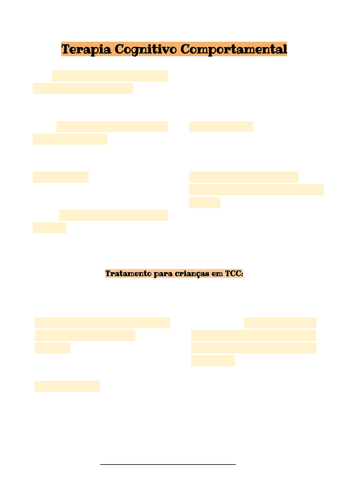Terapia Cognitivo Comportamental ● É uma abordagem da psicologia clínica que utiliza de técnicas comportamentais e cognitivos para tratar disturbios emocionais, psiquiátricos e para autoconhecimento. ● O foco é identificação de padrões comportamentais que trazem prejuízos significativos para o indivíduo. ● Parte do princípio que os pensamentos exercem influenciam as emoções e comportamentos. ● Função compensatória- evitação do indivíduo de entrar em contato com a crença ou emoções o faz sofrer ● Possibilidade de resignificação e reestruturação cognitiva- trazer respostas mais adaptativas para lidar com as coisas ● Atua de forma estruturada e diretiva em diversos contextos psicopatológicos: depressão, Transtorno afetivo bipolar, Transtornos ligados à ansiedade, Transtornos ligados ao controle do impulso, TOC, Transtornos de personalidade, Transtornos alimentares, entre outros. ● Psicoterapia estruturada- planejamento sobre o conteúdo a ser trabalhado- do início, meio e fim (na sessão) ● Orientada no aqui e no agora ● Direcionada à resolução de problemas atuais ● Foco em modificação de comportamentos disfuncionais- Comportamentos indesejados ● Utilização de técnicas cognitivas ● Utilização de técnicas comportamentais ● Utilização de técnicas vivenciais Tratamento para crianças em TCC: ● É diferenciado dos adultos ● A idade e etapa de desenvolvimento deve ser considerada ● Pais devem estar implicados no tratamento e o vínculo com o terapeuta é de extrema importância ● Psicoeducação- deve estar presente em todas as idades- é o mapeamento dos sintomas, dianóstico, tratamento e como lidar. ● Identificação das emoções próprias e dos outros. ● Escolhas de técnicas e intervenções terapêuticas- de acordo com diagnóstico, a queixa, etc ● Brinquedos/ Jogos/ Histórias- estratégias ● Cada caso é um caso: planejamento de metas terapêuticas ● A psicoterapia é um conjunto de métodos, técnicas para tratar distúrbios emocionais, questões relacionadas à saúde mental, qualidade de vida e autoconhecimento. ● Há diversas abordagens, elas pode ser realizada individualmente, em grupo, realizada com todas as idades. Pode ser realizada por todas as pessoas, não necessariamente para aquelas que tenham algum distúrbio emocional MENEZES, P. Curso introdutório de Terapia Cognitivo Comportamental.Refutiriza, 2022 Modelo Cognitivo de Beck ● Parte do princípio que o indivíduo cria crenças sobre si e sobre o mundo- a perscepção ● Segundo esse modelo- A Crença Central gera Pensamentos Automáticos (que muitas das vezes são disfuncionais) que levam à Emoções que desencadeiam ao Comportamento. ● O comportamento tem função de estratégia confirmatória ou estratégia compensatória ● Estratégia confirmatória: todo comportamento que confirma uma crença ● Estratégia compensatória- evitativos- luta e fuga dos estímulos aversivos que trazem sentimentos negativos. ● Ciclo vicioso e padronizado Tríade Cognitiva ● Conjunto de três componentes cognitivos que levam o indivíduo a uma construção única e singulas (idiossingrática) sobre como ele vê a si mesmo, o mundo e o futuro. ● Visão de si- pode ser negativa ou positiva- apercepção- se refere ao eu ● Visão de mundo- tudo aquilo que nos cerca- a forma como v~e as pessoas, as situações ● Visão de futuro- forma como se interpreta como será a vida daqui a um tempo- expectativas, possibilidades. Crenças Centrais ● Ideias mais profundas a cerca do self (eu) ● Se desenvolvem ao longo da vida do indivíduo, a partir da infãncia, sua relação interpessoais, experiências,percepção que o outro tem dele. ● Acionada na fase adulta- diante de gatilhos - situações problemas, que lembram situações vividas anteriormente, principalmente na infãncia adolescência - ativando a crença central- que levam a pensamentos automáticos- emoções e comportamentos. ● O comportamento se torna padrão. ● Objetivo da TCC: Quebra de padrões comportamentais MENEZES, P. Curso introdutório de Terapia Cognitivo Comportamental.Refutiriza, 2022 Categorias das crenças centrais negativas ● São duas: ● A primeira- Desamparo- categorias de crenças centrais negativas sobre si. - O psicólogo identifica- alguns pensamentos como: sou incapaz, inadequado, fraco, descontralado, vítima, sem recursos, fracasso, perdedor, não consigo, etc. Ou seja, o individuo se sente incapaz. ● A segunda- Desamor- não ser querido- Identifica-se: Sou indesejável, indigno,diferente,feio,imperfeito,anadonado,sozinho,não sou bom o suficiente para ser amado, etc. Não se sente merecedor do amor do outro. ● Crenças negativas muitas vezes são encobertas- transtorno de personalidade narcisista. Crenças Subjacentes(intermediárias) ● Ideias mais centrais- que se tornam verdades absolutas.A partir do modo como o individuo interpreta as situações. ● Se confirma por meio de Atitudes- Regras-Suposições ● Confirmação da crença MENEZES, P. Curso introdutório de Terapia Cognitivo Comportamental.Refutiriza, 2022
