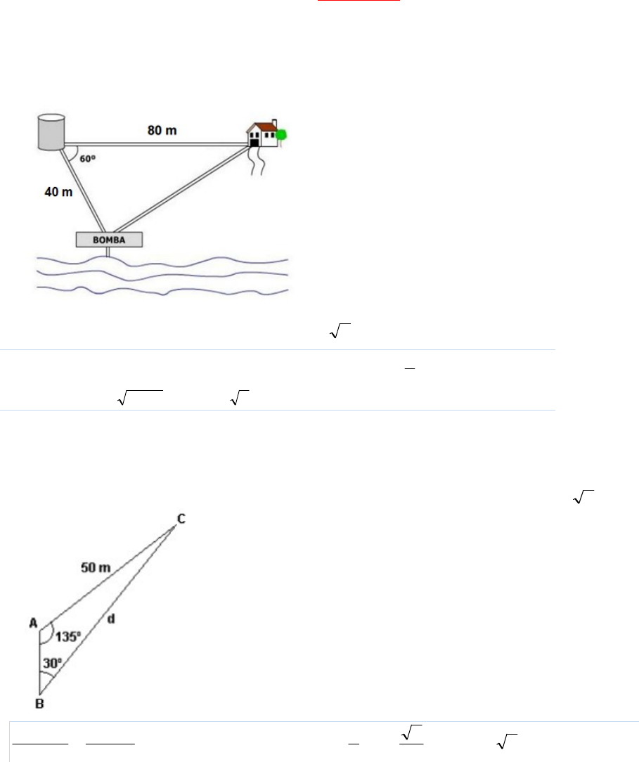 GABARITO 1ª QUESTÃO (valor: 1,0) A água utilizada na casa de um sítio é captada e bombeada do rio para uma caixa- d’água a 40 m de distância. A casa está a 80 m de distância da caixa-d’água e o ângulo formado pelas direções caixa-d’água-bomba e caixa-d’água-casa é de 60º, conforme figura abaixo. Pretende-se bombear água do mesmo ponto de captação até a casa, quantos metros de encanamento são necessários? (considere 7,13 ) m68x7,1.40x340x4800x4800²x 32008000²x 2 1 .640016006400²xº60cos.80.40.2²40²80²x 2ª QUESTÃO (valor: 1,0) Na instalação das lâmpadas de uma praça de alimentação, a equipe necessitou calcular corretamente a distância entre duas delas, colocadas nos vértices B e C do triângulo, conforme a figura. Sabendo que sen135º = sen45º, calcule a distância "d". (considere 4,12 ) mddsensend sensen d 70)4,1.(502.50 2 2 .50 2 1 .º135.50º30. º30 50 º135 3ª QUESTÃO (valor: 1,0) Para determinar a altura de uma montanha,um topógrafo colocou-se com seu teodolito a 300 m da montanha. Posiciona o aparelho que lhe fornece a medida do ângulo de visada de parte do morro, igual a 60º. Sabendo que o teodolito tem altura de 1,60 m, o topógrafo pode determinar a altura da montanha. Determine essa altura. (considere 7,13 ) m6,511H6,1510H m510x7,1.300x3.300x 300 x 3 300 x º60tg 6,1xH 4ª QUESTÃO (valor: 0,5) Na figura abaixo sabe-se que: DB = 16 cm, tg x = 2 e tg y = 3. Calcule o valor de AD. 8AD8a16a24832a2 16a 48 2 16a b tgx 48b 16 b 3 16 b tgy BOA PROVA