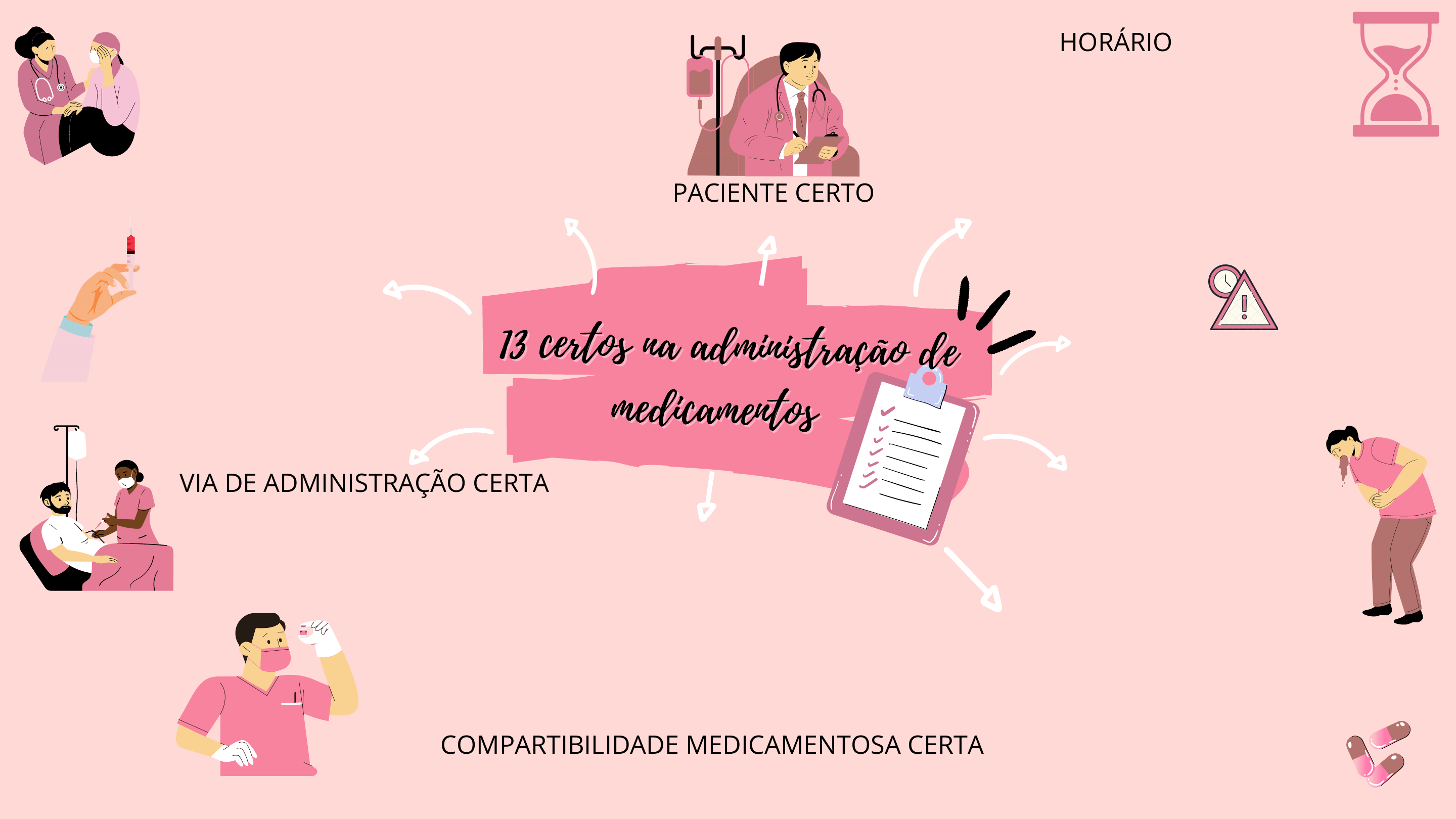DIREITO DE RECUSA DO PACIENTE 13 certos na administração de13 certos na administração de medicamentosmedicamentos VIA DE ADMINISTRAÇÃO CERTA PACIENTE CERTO COMPARTIBILIDADE MEDICAMENTOSA CERTA HORÁRIO CERTO PRAZO DE VALIDADE CERTA DOSE CERTA ASPECTO DA MEDICAÇÃO CERTO MEDICAMENTO CERTO ORIENTAÇÃO AO PACIENTE CERTA REGISTRO CERTO AÇÃO CERTA TEMPO DE ADMINISTRAÇÃO CERTO •Observar com atenção a dosagem prescrita. •Entender a ação do medicamento no organismo do paciente. •Administrar o medicamento na hora certa para que o tratamento seja mais eficaz. •Conferir os dados do paciente. •Conferir se a medicação está vencida. •Orientar o paciente sobre a medicação a ser administrada, bem como os efeitos colaterais. •Conferir se a medicação é compatível com outra que o paciente já recebe, com a alimentação e com o quadro de saúde. •Registrar no prontuário do paciente o medicamento com o horário, a dosagem e a via de administração. •Comunicar ao paciente que se ele desejar, pode se recusar a receber a medicação. •Verificar por quanto tempo a medicação será infundida. •Conferir se o medicamento está em sua forma correta. •Confira o nome e a composição do medicamento. •verificar onde a medicação deverá ser aplicada de acordo com a prescrição.