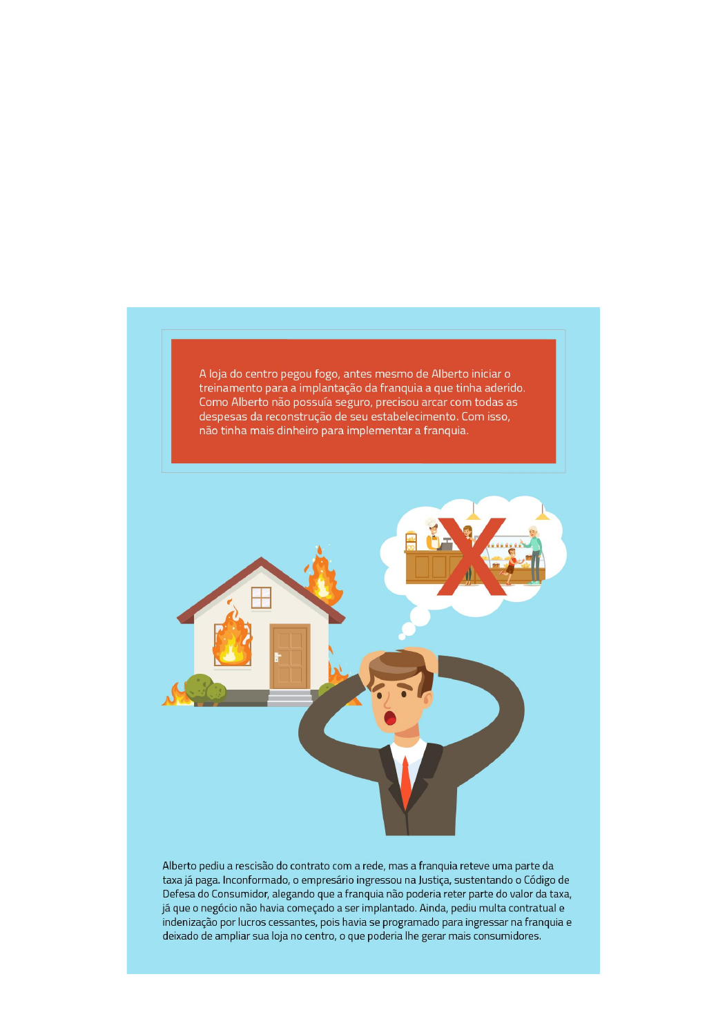 Franquia O contrato de franquia pode ser classificado como consensual, visto que ele se aperfeiçoa com a vontade das partes; bilateral, pois dele se desdobram obrigações para ambas as partes; oneroso, uma vez que a cada parte incumbe um ônus; de trato sucessivo, pois a sua execução ocorre dentro do prazo acertado; e atípico, porque a regência da relação entre as partes se realiza por cláusulas convencionais. Alberto é um empresário do ramo alimentício que já possui uma loja de médio porte no centro do Distrito Federal (DF). Como ele entende bem do assunto e estava interessado em ampliar seus negócios, procurou uma franquia da mesma área para se candidatar a franqueado. Recebeu deles a Circular de Oferta de Franquia (COF) com prazo de 10 dias de antecedência, conforme estipulado pela Lei n.° 8.955/94. Ele analisou as informações prestadas pelo franqueado e decidiu pela filiação. Ao ingressar na rede, Alberto pagou a taxa de franquia, que funciona como uma validação do contrato entre a rede e o franqueado. Contudo, quando estava prestes a implementar a franquia, ele sofreu o seguinte incidente, conforme pode ser observado na imagem a seguir: Frente à situação, você, como juiz da ação, com base em seu conhecimento em contratos de franquias, se decidiria contrário ou a favor de Alberto? Justifique. Padrão de resposta esperado Contrário a Alberto, pois como o franqueado não é destinatário final do produto e serviço oferecidos pela franqueadora, não se encaixa no conceito de consumidor, não sendo possível falar em Código de Defesa do Consumidor. Como a dissolução do contrato decorreu de desistência unilateral por parte do franqueado, não há como condenar a empresa franqueadora ao pagamento de multa contratual nem ao de indenização por lucros cessantes. Além disso, a rescisão do contrato antes da implementação da franquia autoriza a retenção parcial da taxa de franquia na proporção do prejuízo experimentado pela franqueadora, conforme Lei das Franquias (n.° 8.955/94) e Código Civil.