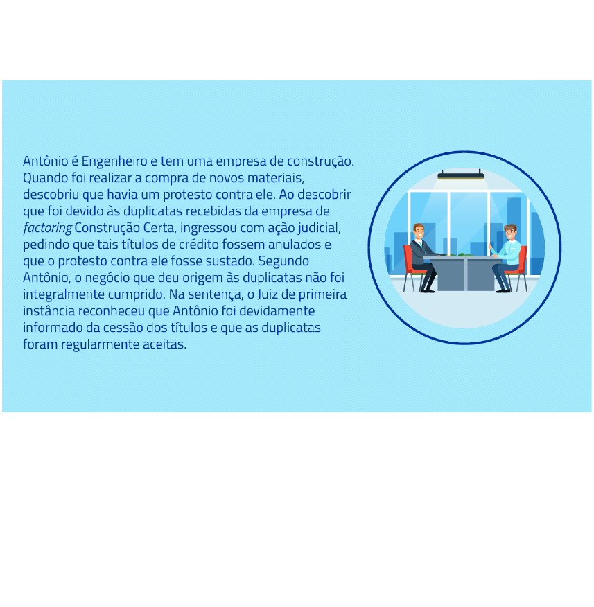 Factoring Um dos meios de pagamento utilizado pelas empresas é a duplicata, que é uma espécie de título de crédito. Mas, para que elas sejam cobradas, é necessário que tenha havido a respectiva prestação de serviços. Acompanhe o caso a seguir. Os pedidos foram julgados improcedentes. Pela sentença, seria impossível opor à empresa questões relativas à constituição do débito. A empresa Construção Certa recorreu ao Superior Tribunal de Justiça, sustentando, entre outros pontos, que a aquisição dos títulos ocorreu por endosso, e não por cessão de crédito, e que tal aceite desvincularia a empresa do negócio original. Você, na condição de Ministro do Superior Tribunal de Justiça, e relator do presente caso, considerando o disposto sobre duplicatas no Código Civil, como se posicionaria sobre a empresa de fomento mercantil? Padrão de resposta esperado A empresa de factoring não pode exigir do devedor o pagamento de duplicatas referentes a serviços que não foram prestados, mesmo que tenha dado seu aceite. No contrato de factoring, a transferência desses créditos não representa um simples endosso, mas uma cessão de crédito, hipótese disciplinada no artigo 294 do Código Civil. Antônio agiu de boa-fé, pois deu seu aceite no momento em que as mercadorias continuavam sendo entregues, só após é que a empresa deixou de fazer as entregas contratadas, quando o sacado já havia pagado a maior parte do valor contratado.