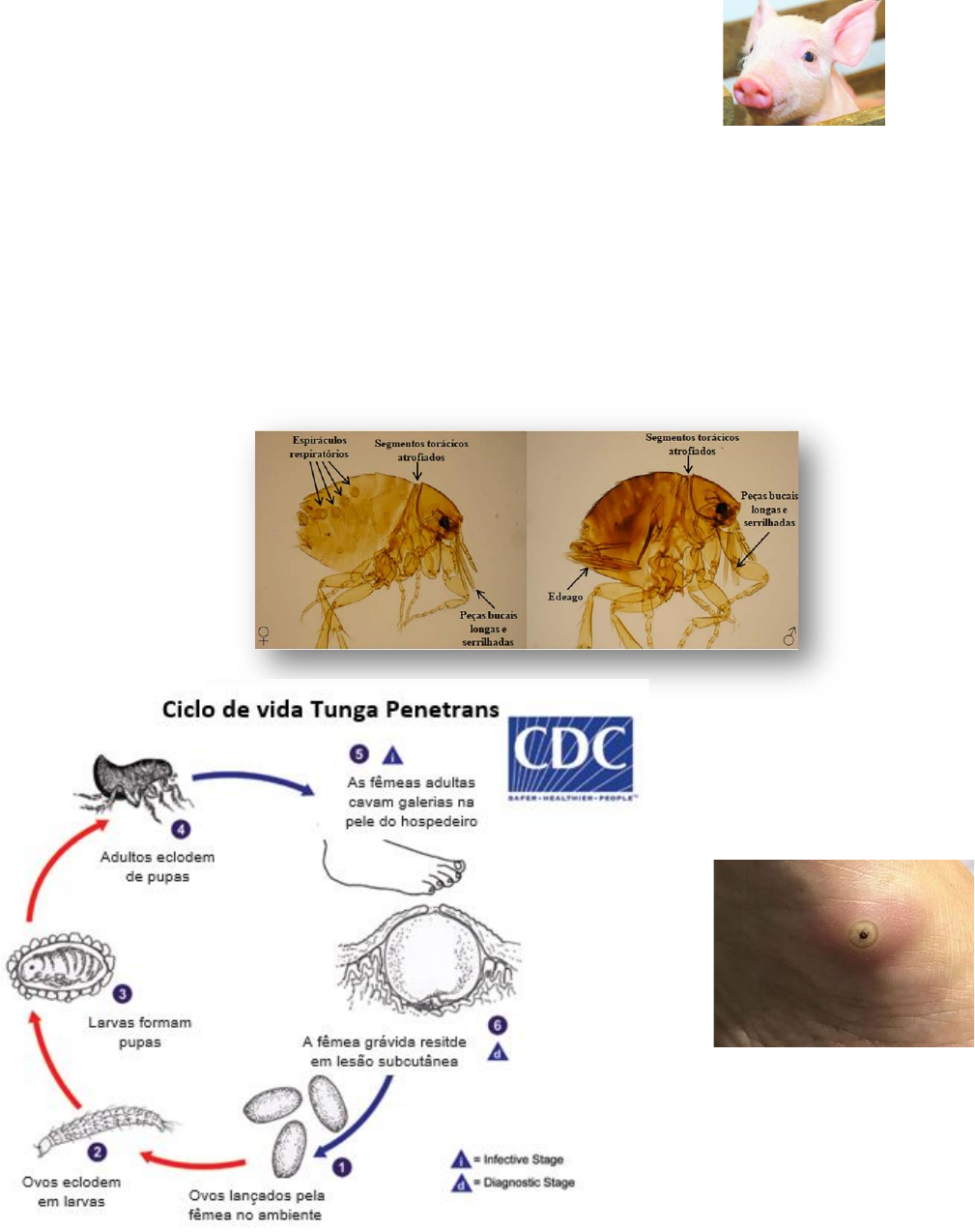 ECTOPARASITA: Tunga Penetrans Sintomas: • Prurido e irritação; • Infecções secundárias; • Eritema; • Pústulas. Tratamento e Profilaxia: • Retirada do parasita por pinça ou curetagem quando necessário • Crioterapia (terapia pelo frio) • Medicamentos antiparasitários tópicos • Limpeza do ferimento • Uso de calçados • Inseticidas ambientais • Circulação restrita de porcos Características principais do ectoparasita: - Tem ausência de asas e corpo achatado látero-lateralmente; - Menor das pulgas, tendo o inseto adulto 1mm de comprimento; -Fronte terminação em ponta aguda, favorecendo sua penetração na pele do hospedeiro; - Fêmeas e machos adultos tem preferência por lugares de solo arenoso, quente e secos como praias, estábulos, chiqueiros e fazendas; - São hematófagos, porém a infestação na epiderme se dá somente pelas fêmeas; - Fêmeas expelem cerca de 100 ovos que caem no solo e seguem seu desenvolvimento. Pulga de nome científico Tunga Penetrans mais conhecida popularmente como BIXO- DO-PÉ ou BIXO-DO-PORCO pertence a classe Siphonaptera, da família dos tungídeos, sua infestação no homem recebe o nome de Tungíase. Hospedeiro: - Representante da pulga penetrans em mamíferos, mas tem como hospedeiros preferenciais homens (infestações na sola e dedos dos pés, seguida pelas pernas e mãos) e suínos (infestações nas patas e escrotos).