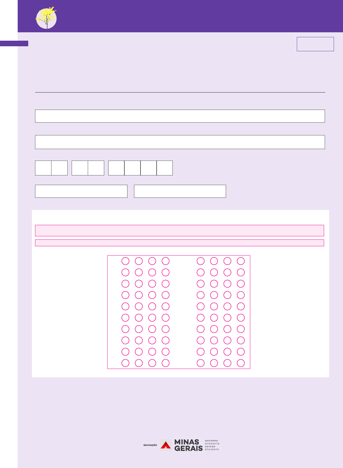 MATEMÁTICA 4º ano do Ensino Fundamental Data de Nascimento do Estudante Nome do Estudante C A D E R N O M0401 A V A L I A Ç Ã O D I A G N Ó S T I C A 2 0 2 1 Secretaria de Estado de Educação de Minas Gerais Turma Turno Nome da Escola CARTÃO DE RESPOSTAS ATENÇÃO! TRANSCREVA AS RESPOSTAS DO TESTE NA ÁREA ABAIXO. DEVOLVA ESTA FOLHA PARA A ESCOLA. 01 A B C D 11 A B C D 02 A B C D 12 A B C D 03 A B C D 13 A B C D 04 A B C D 14 A B C D 05 A B C D 15 A B C D 06 A B C D 16 A B C D 07 A B C D 17 A B C D 08 A B C D 18 A B C D 09 A B C D 19 A B C D 10 A B C D 20 A B C D 2022 BL01M04 Questão 01 M010521E4 Qual dos instrumentos abaixo é utilizado para medir o comprimento? A) B) C) D) M0401 1 BL01M04 Questão 02 M030237E4 A professora Daniele comprou 55 bandeirinhas para enfeitar a sua sala de aula. Desse total, ela utilizou 34 bandeirinhas na decoração. Quantas dessas bandeirinhas sobraram? A) 89 B) 88 C) 34 D) 21 M0401 2 BL01M04 Questão 03 M030609H6 Observe abaixo os desenhos de algumas casas que Larissa encontrou em uma revista para fazer um trabalho da escola. Ela organizou esses desenhos em um referencial de linhas e colunas. 1 2 3 P Q R Qual foi a casa que Larissa colocou na linha R e na coluna 2? A) B) C) D) M0401 3 BL01M04 Questão 04 M010898H6 Observe abaixo a sequência dos números. Ela segue um padrão. __ – 15 – 20 – 25 – 30 Qual é o número que completa essa sequência? A) 5 B) 10 C) 14 D) 16 M0401 4 BL01M04 Questão 05 M040115H6 Leonardo comprou um carro e pagou em 60 meses. Em quantos anos Leonardo pagou esse carro? A) 60 B) 12 C) 6 D) 5 M0401 5 BL01M04 Questão 06 M040103BH Ana comprou alguns chapéus para a festa de aniversário de seu filho, como o representado abaixo. Esse chapéu lembra a forma de um A) cilindro. B) cone. C) cubo. D) pirâmide. M0401 6 BL01M04 Questão 07 M040024H6 Observe o número no quadro abaixo. 402 Nesse número, qual é o valor relativo do algarismo 4? A) 4 B) 40 C) 400 D) 402 M0401 7 BL01M04 Questão 08 M030948H6 Resolva a conta abaixo. 42 ÷ 7 Qual é o resultado dessa conta? A) 6 B) 7 C) 35 D) 49 M0401 8 BL01M04 Questão 09 M030170B1 Ana fez 365 doces para uma festa. Outra forma de representar o número de doces que Ana fez é A) 3 + 6 + 5. B) 30 + 60 + 5. C) 300 + 60 + 5. D) 300 + 6 + 5. M0401 9 BL01M04 Questão 10 M020245E4 A tabela abaixo apresenta o número de fichas vendidas na bilheteria de um parque de diversões no último final de semana. Brinquedos Número de fichas Trem-fantasma 81 Carrinho bate-bate 95 Roda-gigante 67 Tiro ao alvo 29 Carrossel 75 De acordo com os dados dessa tabela, quantas fichas foram vendidas para andar na roda-gigante nesse final de semana? A) 29 B) 67 C) 81 D) 95 M0401 10 BL02M04 Questão 11 M041686E4 Observe abaixo a quantidade de moedas que Danilo tinha em sua carteira. Ele foi a uma loteria e trocou todas essas moedas por uma única cédula. Qual cédula ele recebeu nessa troca? A) B) C) D) M0401 11 BL02M04 Questão 12 M050121G5 Pedro foi a um restaurante e gastou R$ 86,00. Ele pagou a conta com uma nota de R$ 100,00. Quantos reais Pedro recebeu de troco nesse restaurante? A) R$ 14,00 B) R$ 16,00 C) R$ 24,00 D) R$ 26,00 M0401 12 BL02M04 Questão 13 M040152H6 Observe abaixo a reta numérica que está dividida em partes iguais. 403530 55 60 P Nessa reta, o ponto P representa o número A) 41. B) 45. C) 50. D) 53. M0401 13 BL02M04 Questão 14 M030459H6 O tampo da nova mesa da cozinha de Gabriela tem a forma de um triângulo. Qual é a figura que representa a forma dessa mesa? A) B) C) D) M0401 14 BL02M04 Questão 15 M030138E4 A escrita por extenso do número 508 é A) cinquenta e oito. B) oitocentos e cinco. C) quinhentos e oitenta. D) quinhentos e oito. M0401 15 BL02M04 Questão 16 M030163H6 Observe o número abaixo. 20 Qual é o antecessor desse número? A) 10 B) 19 C) 21 D) 30 M0401 16 BL02M04 Questão 17 M040017E4 Observe a conta abaixo. 857 – 238 O resultado dessa conta é A) 619. B) 629. C) 1 085. D) 1 095. M0401 17 BL02M04 Questão 18 M030492H6 Observe no relógio abaixo o horário em que Regina saiu de casa para ir ao dentista. De acordo com esse relógio, qual foi o horário em que Regina saiu de casa para ir ao dentista? A) 4 HORAS E 6 MINUTOS. B) 4 HORAS E 30 MINUTOS. C) 6 HORAS E 4 MINUTOS. D) 6 HORAS E 20 MINUTOS. M0401 18 BL02M04 Questão 19 M030189E4 Amanda distribuiu 3 lembrancinhas para cada um dos 50 convidados de sua festa de aniversário. Quantas lembrancinhas Amanda distribuiu ao todo entre seus convidados? A) 50 B) 53 C) 150 D) 153 M0401 19 BL02M04 Questão 20 M020073E4 Lívia pesquisou, entre suas amigas, a preferência de cor delas e registrou no gráfico abaixo. Cada uma das amigas de Lívia escolheu uma única cor. 0 2 4 6 8 10 12 Branco Azul Lilás Rosa Preto De acordo com esse gráfico, qual foi a cor menos escolhida pelas amigas de Lívia? A) Azul. B) Branco. C) Rosa. D) Preto. M0401 20