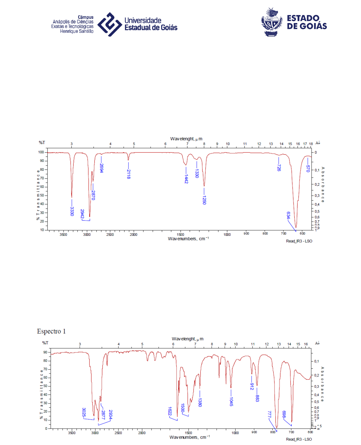 Espectroscopia Aluno (a): ________________________________________________________ Profa: Luciana Machado Ramos Data: 09/09/2020 Curso: Mestrado em Ciências Moleculares/ Doutorado em Química Lista I Questão 01. O espectro mostrado a seguir é de um composto de fórmula C10H14 (a) Calcule o número de insaturações. (b) Pelo número de insaturações você acha que o composto poderia ser um aromático derivado do benzeno? (c) Pelo espectro de infravermelho o que você conclui? É aromático ou não? Questão 02. Os espectros a seguir correspondem aos xilenos (dimetilbenzenos) orto, meta e para. Qual corresponde a qual? Questão 03. Poliestireno é um polímero sintético preparado por polimerização do estireno, como mostrado abaixo. várias moléculas CH CH2 CH CH2 CH CH2 polimerização Estireno Poliestireno Pode apresentar-se em formas diversas, como uma espuma solidificada (conhecida comumente como “isopor”) ou como um filme não muito flexível e transparente. Um filme de poliestireno é comumente usado como referência para calibrar aparelhos de infravermelho. Um espectro de um desses filmes é mostrado a seguir. Verifique se o espectro do poliestireno é compatível com a estrutura mostrada na equação química. Questão 04. Os dois compostos correspondentes aos espectros a seguir são isômeros, ambos com fórmula molecular C8H8O2. Deduza a fórmula estrutural de cada um , considerando que têm estruturas simples e são substâncias comumente encontradas em laboratórios.