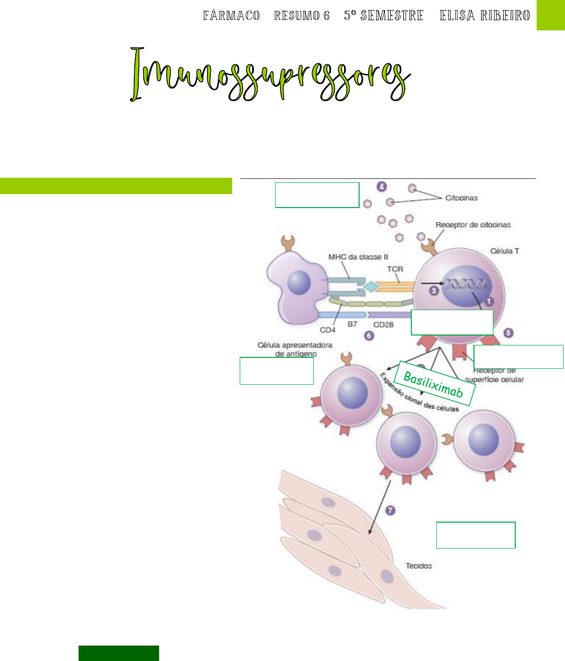 1 – – – Pacientes com doença autoimune e aqueles que receberam transplantes de tecido ou órgãos geralmente necessitam de tratamento com fármacos imunossupressores. Classes e agentes farmacológicos A supressão farmacológica do sistema imune utiliza oito abordagens mecanistas: 1. Inibição da expressão gênica para modular respostas inflamatórias; 2. Depleção das populações de linfócitos em expansão com agentes citotóxicos; 3. Inibição da sinalização dos linfócitos para bloquear a ativação e a expansão dos linfócitos; 4. Neutralização das citocinas essenciais para mediar resposta imune; 5. Depleção de células imunes específicas, habitualmente através de anticorpos específicos contra células; 6. Bloqueio da co-estimulação para induzir anergia; 7. Bloqueio da adesão celular para impedir a migração e o estabelecimento das células inflamatórias; 8. Inibição da imunidade inata, incluindo ativação do complemento. Inibidores da expressão gênica → Glicocorticoides Em resumo, os glicocorticoides são hormônios esteroides que exercem suas ações fisiológicas por meio de ligação ao receptor de glicocorticoides citosólico. O complexo glicocorticoide-receptor de glicocorticoides transloca-se para o núcleo, no qual se liga a elementos de resposta aos glicocorticoides na região promotora de genes específicos, com supra ou infrarregulação da expressão gênica. Os glicocorticoides exercem efeitos metabólicos importantes sobre praticamente todas as células do organismo e, em doses farmacológicas, suprimem a ativação e a função das células imunes inatas e adaptativas. Os glicocorticoides infrarregulam a expressão de numerosos mediadores inflamatórios, incluindo citocinas essenciais, como TNF-α, interleucina-1 (IL-1) e IL-4. Etanercept Abatacept Ciclosporina Natalizumab Eculizumab 2 – – – A administração a longo prazo de glicocorticoides apresenta efeitos adversos importantes. Em pacientes tratados com glicocorticoides, é necessário proceder a rigoroso monitoramento de diabetes, redução da resistência às infecções, osteoporose, cataratas, aumento do apetite levando a ganho ponderal, hipertensão e suas sequelas e mascaramento da inflamação. A interrupção abrupta do tratamento com glicocorticoides pode resultar em insuficiência adrenal aguda, na medida em que o hipotálamo e a hipófise necessitam de várias semanas a meses para o restabelecimento da produção adequada de ACTH. Agentes Citotóxicos → Antimetabólitos (Metotrexato) e Agentes Alquilantes (Ciclofosfamida) Agentes citotóxicos são utilizados para imunossupressão, bem como para quimioterapia antineoplásica. Duas classes de agentes citotóxicos, os antimetabólitos e os agentes alquilantes, são comumente utilizadas como imunossupressores. → Tanto a quimioterapia antineoplásica quanto a imunossupressão têm por objetivo terapêutico a eliminação das células indesejáveis. Os antimetabólitos são análogos estruturais de metabólitos naturais, que inibem vias essenciais envolvendo esses metabólitos. Em geral, os antimetabólitos afetam a imunidade celular e a humoral, tornando os pacientes mais suscetíveis às infecções do que ocorreria se apenas um desses sistemas imunes estivesse envolvido. → Os antimetabólitos mais recentes, como micofenolato de mofetila e leflunomida, produzem menos efeitos adversos. → Ácido micofenólico - é inibidor da inosina monofosfato desidrogenase, enzima que limita a velocidade na formação de guanosina. está sendo cada vez mais utilizado no tratamento de doenças imunologicamente mediadas, por causa de sua alta seletividade e profundo efeito sobre linfócitos. O efeito adverso mais comum de MMF é o desconforto gastrintestinal, de caráter dose dependente e que inclui náuseas, diarreia, fezes de consistência mole, anorexia e vômitos. → Leflunomida - age como inibidor da síntese de pirimidinas. Na atualidade, leflunomida está aprovada para tratamento da artrite reumatoide, mas o fármaco também apresenta eficácia significativa no tratamento de outras doenças imunes, incluindo lúpus eritematoso sistêmico e miastenia gravis. Os efeitos adversos mais significativos da leflunomida consistem em diarreia e alopecia reversível. A leflunomida sofre circulação êntero-hepática significativa, resultando em efeito farmacológico prolongado → Azatioprina - foi o primeiro fármaco utilizado para supressão do sistema imune após transplante e continua sendo a base para essa indicação → Metotrexato - se tornou um fármaco extremamente versátil no tratamento de ampla variedade de doenças imunologicamente mediadas, incluindo artrite reumatoide e psoríase. O MTX pode atuar como agente anti-inflamatório mediante aumento dos níveis de adenosina. Adenosina é um poderoso mediador anti-inflamatório endógeno, que inibe adesão de neutrófilos, fagocitose e produção de superóxido. O MTX também causa apoptose de células T CD4 e CD8 ativadas, mas não de células T em repouso. Os agentes alquilantes interferem na replicação do DNA e na expressão gênica por meio de conjugação de grupos alquila no DNA → Ciclofosfamida - exerce efeito supressor importante sobre a proliferação de células B, mas pode intensificar as respostas de células T, o uso de CF em doenças imunes limitase aos distúrbios da imunidade humoral, particularmente lúpus eritematoso sistêmico. Os efeitos adversos da CF são graves e disseminados, incluindo leucopenia, cardiotoxicidade, alopecia e risco aumentado de 3 – – – câncer, em decorrência de sua mutagenicidade. A possibilidade de incidência de câncer vesical é particularmente notável, uma vez que a CF produz um metabólito carcinogênico, a acroleína, que se concentra na urina Inibidores Específicos da Sinalização dos Linfócitos Ciclosporina, Tacrolimo e Sirolimo → Ciclosporina A– Cs é um inibidor específico da imunidade mediada por 