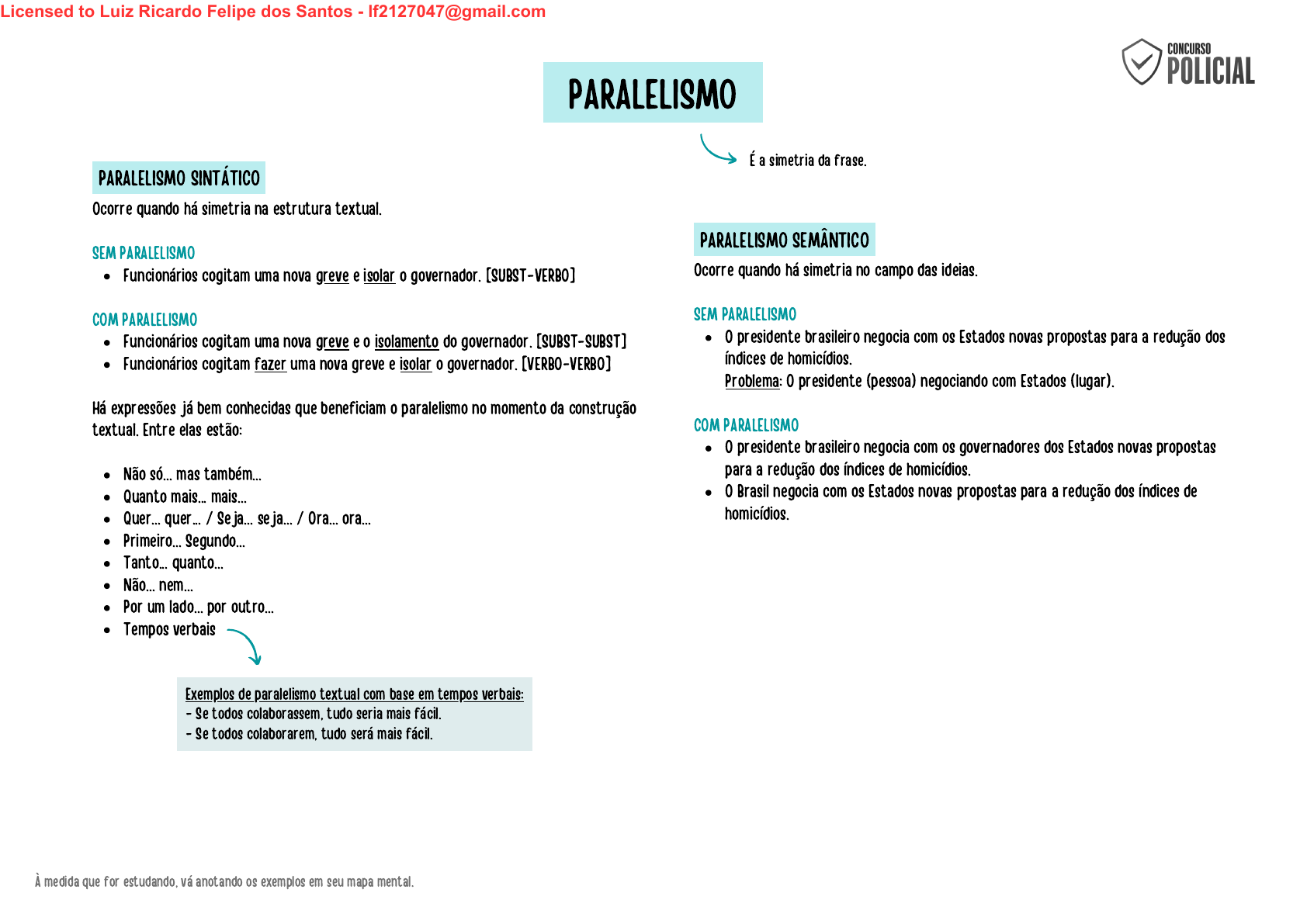 PARALELISMO PARALELISMO SINTÁTICO À medida que for estudando, vá anotando os exemplos em seu mapa mental. Funcionários cogitam uma nova greve e isolar o governador. [SUBST-VERBO] Funcionários cogitam uma nova greve e o isolamento do governador. [SUBST-SUBST] Funcionários cogitam fazer uma nova greve e isolar o governador. [VERBO-VERBO] Não só... mas também... Quanto mais... mais... Quer... quer... / Seja... seja... / Ora... ora... Primeiro... Segundo... Tanto... quanto... Não... nem... Por um lado... por outro... Tempos verbais Ocorre quando há simetria na estrutura textual. SEM PARALELISMO COM PARALELISMO Há expressões já bem conhecidas que beneficiam o paralelismo no momento da construção textual. Entre elas estão: É a simetria da frase. Exemplos de paralelismo textual com base em tempos verbais: - Se todos colaborassem, tudo seria mais fácil. - Se todos colaborarem, tudo será mais fácil. PARALELISMO SEMÂNTICO O presidente brasileiro negocia com os Estados novas propostas para a redução dos índices de homicídios. O presidente brasileiro negocia com os governadores dos Estados novas propostas para a redução dos índices de homicídios. O Brasil negocia com os Estados novas propostas para a redução dos índices de homicídios. Ocorre quando há simetria no campo das ideias. SEM PARALELISMO Problema: O presidente (pessoa) negociando com Estados (lugar). COM PARALELISMO Licensed to Luiz Ricardo Felipe dos Santos - lf2127047@gmail.com