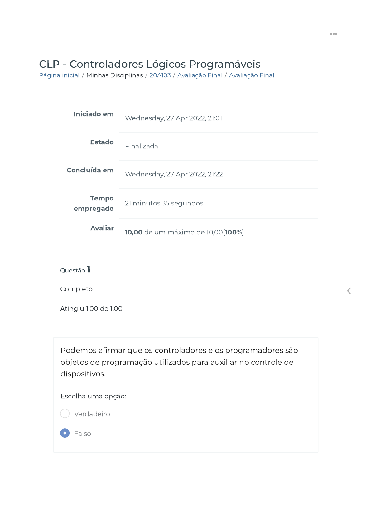 27/04/2022 21:22 Avaliação Final https://ava.politecnicabr.com.br/mod/quiz/review.php?attempt=2939719 1/10 Página inicial / Minhas Disciplinas / 20A103 / Avaliação Final / Avaliação Final CLP - Controladores Lógicos Programáveis Iniciado em Wednesday, 27 Apr 2022, 21:01 Estado Finalizada Concluída em Wednesday, 27 Apr 2022, 21:22 Tempo empregado 21 minutos 35 segundos Avaliar 10,00 de um máximo de 10,00(100%) Questão 1 Completo Atingiu 1,00 de 1,00 Podemos a�rmar que os controladores e os programadores são objetos de programação utilizados para auxiliar no controle de dispositivos. Escolha uma opção: Verdadeiro Falso https://ava.politecnicabr.com.br/ https://ava.politecnicabr.com.br/course/view.php?id=937 https://ava.politecnicabr.com.br/course/view.php?id=937#section-9 https://ava.politecnicabr.com.br/mod/quiz/view.php?id=32563 https://ava.politecnicabr.com.br/ 27/04/2022 21:22 Avaliação Final https://ava.politecnicabr.com.br/mod/quiz/review.php?attempt=2939719 2/10 Questão 2 Completo Atingiu 1,00 de 1,00 Convergência simultânea ou convergência em E: retorno do Grafcet a uma estrutura linear. Uma convergência simultânea é sucedida por uma transição e precedida por sequências terminadas por etapas. O paralelismo só é encerrado quando todas as suas sequências estiverem concluídas. Escolha uma opção: Verdadeiro Falso Atuador Controlador Sensor Processo https://ava.politecnicabr.com.br/ 27/04/2022 21:22 Avaliação Final https://ava.politecnicabr.com.br/mod/quiz/review.php?attempt=2939719 3/10 Questão 3 Completo Atingiu 1,00 de 1,00 - Operação que evolui progressivamente e que se constitui por uma série de ações controladas objetivando um resultado particular; - Mede o desempenho do sistema de automação ou uma propriedade particular de algum de seus componentes. Exemplos: termômetros e velocímetros; - Opera presença de distúrbios e tende a reduzir a diferença entre a saída de um sistema e a entrada de referência; - Compara os valores medidos com valores preestabelecidos e toma a decisão de quando atuar no sistema. Como exemplos, podemos citar os termostatos e os programas de computadores, ou seja, são responsáveis pela realização de trabalho no processo ao qual está se aplicando a automação; Inicialização Veri�car estado das entradas Tranferir os dados para memória https://ava.politecnicabr.com.br/ 27/04/2022 21:22 Avaliação Final https://ava.politecnicabr.com.br/mod/quiz/review.php?attempt=2939719 4/10 Questão 4 Completo Atingiu 1,00 de 1,00 Unidade de processamento: Também chamada de CPU, é responsável pelo funcionamento lógico de todos os circuitos. Nos CLPs modulares a CPU está em uma placa (ou módulo) separada das demais, podendo-se achar combinações de CPU e Fonte de Alimentação. Nos CLPs de menor porte a CPU e os demais circuitos estão todos em único módulo. Escolha uma opção: Questão 5 Completo Atingiu 1,00 de 1,00 Sistema de controle em malha aberta: é aquele em que a saída ou resposta in�uencia a entrada do sistema. Escolha uma opção: Verdadeiro Falso Verdadeiro Falso Comparar com o programa do usuário Atualizar as saídas https://ava.politecnicabr.com.br/ 27/04/2022 21:22 Avaliação Final https://ava.politecnicabr.com.br/mod/quiz/review.php?attempt=2939719 5/10 Questão 6 Completo Atingiu 1,00 de 1,00 O Controlador Programável, como todo sistema microprocessado, tem seu princípio de funcionamento baseado nos seguintes passos: : No momento em que é ligado o CLP executa uma série de operações pré-programadas, gravadas em seu Programa Monitor: - Veri�ca o funcionamento eletrônico da C.P.U. , memórias e circuitos auxiliares; - Veri�ca a con�guração interna e compara com os circuitos instalados; - Veri�ca o estado das chaves principais (RUN/STOP, PROG, etc); - Desativa todas as saídas; - Veri�ca a existência de um programa de usuário; - Emite um aviso de erro caso algum dos itens acima falhe. : O CLP lê o estado de cada uma das entradas, veri�cando se alguma foi acionada. O processo de leitura recebe o nome de Ciclo de Varredura (Scan) e normalmente é de alguns microssegundos (scan time). : Após o Ciclo de Varredura, o CLP armazena os resultados obtidos em uma região de memória chamada de Memória Imagem das 9 Entradas e Saídas. Ela recebe este nome por ser um espelho do estado das entradas e saídas. Esta memória será consultada pelo CLP no decorrer do processamento do programa do usuário. https://ava.politecnicabr.com.br/ 27/04/2022 21:22 Avaliação Final https://ava.politecnicabr.com.br/mod/quiz/review.php?attempt=2939719 6/10 : O CLP ao executar o programa do usuário, após consultar a Memória Imagem das Entradas, atualiza o estado da Memória Imagem das Saídas, de acordo com as instruções de�nidas pelo usuário em seu programa. : O CLP escreve o valor contido na Memória das Saídas, atualizando as interfaces ou módulos de saída. Inicia - se então, um novo ciclo de varredura. https://ava.politecnicabr.com.br/ 27/04/2022 21:22 Avaliação Final https://ava.politecnicabr.com.br/mod/quiz/review.php?attempt=2939719 7/10 Questão 7 Completo Atingiu 1,00 de 1,00 Divergência seletiva ou divergência em OU: uma divergência seletiva é precedida por uma etapa e sucedida por sequências iniciadas por transições. É recomendável que as transições numa divergência seletiva sejam receptivas e possuam condições lógicas mutuamente exclusivas entre si. Escolha uma opção: Questão 8 Completo Atingiu 1,00 de 1,00 Memória do programa supervisor: É a memória que armazena o programa do usuário. Esta memória, reservada ao programa do usuário, contém alguns Kbytes de palavras-livres que serão processadas pela CPU. A cada ciclo, a CPU processa este programa, atualiza a memória de dados internos e as imagens das entradas e saídas. Constituída por memórias do tipo RAM, EEPROM ou FLASH-EPROM. Escolha uma opção: Verdadeiro Falso Verdadeiro Falso
