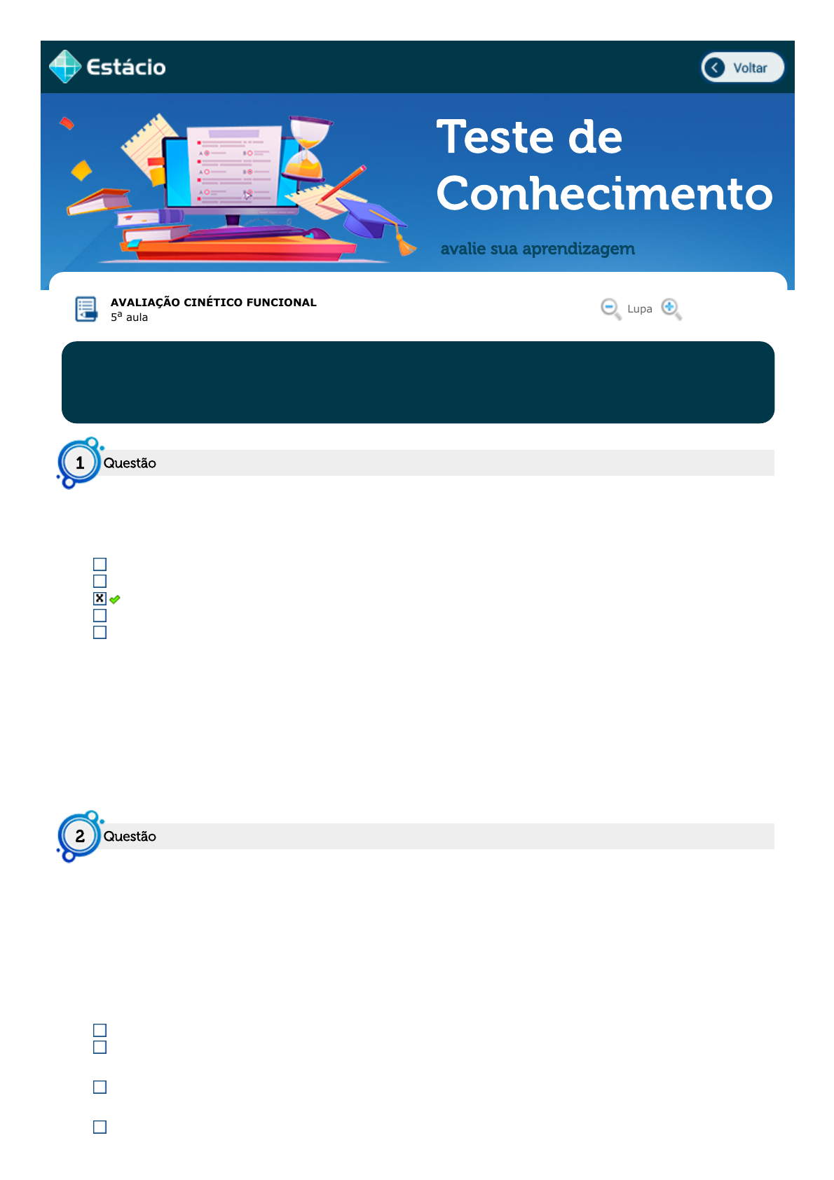 27/04/2022 21:01 EPS https://simulado.estacio.br/bdq_simulados_exercicio_preview.asp?cod_prova=5154499102&cod_hist_prova=278709527&pag_voltar=otacka 1/2 Teste de Conhecimento avalie sua aprendizagem AVALIAÇÃO CINÉTICO FUNCIONAL 5a aula Lupa Exercício: SDE4657_EX_A5_202002471761_V1 24/03/2022 Aluno(a): LIVIA MENDES JOSÉ 2022.1 - F Disciplina: SDE4657 - AVALIAÇÃO CINÉTICO FUNCIONAL 202002471761 A análise da marcha tem fundamental relevância não só no tratamento de algumas patologias que podem comprometer o aparelho locomotor como também no estudo científico. Essa análise da marcha é feita pela observação qualitativa, sendo possível verificar o padrão da marcha de cada indivíduo. Qual a variável que estamos observando considerando ¿a distância entre o toque do calcanhar de uma perna e o toque da perna contralateral¿? Largura do passo Velocidade do andar Comprimento do passo Fase do passo Comprimento da passada Respondido em 24/03/2022 08:36:34 Explicação: Apesar de muito parecidos os termos, existe uma diferença entre cada uma das variáveis apresentadas na resposta. Ao consideramos a distância entre o toque do calcanhar de uma perna e o toque da perna contralateral, estamos nos referindo ao comprimento do passo Paciente JRT sexo masculino, 55 anos, deu entrada no setor de fisioterapia, onde em sua avaliação foi verificado: instabilidade no controle de tronco, perda da sensibilidade principalmente em MMII e deambulando com sua base de apoio aumentada, apoiando só os calcâneos seguido de movimentos rápidos e sem definição. A marcha patológica que mais se enquadra nesse paciente é: marcha Parética marcha de Todd marcha Ceifante marcha de Trendelemburg Questão1 Questão2 https://simulado.estacio.br/alunos/inicio.asp javascript:voltar(); javascript:diminui(); javascript:aumenta(); 27/04/2022 21:01 EPS https://simulado.estacio.br/bdq_simulados_exercicio_preview.asp?cod_prova=5154499102&cod_hist_prova=278709527&pag_voltar=otacka 2/2 marcha Tabética Respondido em 24/03/2022 08:37:02 Explicação: a) opção incorreta pois na marcha ceifante o paciente ao andar o paciente mantém um dos membros superiores fletido em 90° no cotovelo e em adução, e a mão fechada em leve pronação. O membro inferior do mesmo lado é espástico e o joelho não flexiona. b) opção incorreta pois marcha de TODDY é um outro nome para marcha ceifante c) opção correta d) opção incorreta pois na Marcha de Trendelemburg há uma fraqueza de glúteo médio ao ponto de não dar estabilidade a pelve, ou seja, ocorre a queda do quadril em flexão lateral homolateral à fase de apoio. e) opção incorreta pois é uma marcha que surge a partir de lesões de nervos periféricos, polineurites e poliomielites (paralisia infantil). Desenvolve pé caído, ou seja, uma fraqueza para realizar o movimento de dorso flexão do tornozelo, havendo tendência do pé prender ou arrastar no chão. Cada marcha humana possui um ciclo que pode ser compreendido como a movimentação que ocorre entre o período do toque do calcanhar de um dos pés no chão até o toque do mesmo calcanhar mais adiante. Para ser melhor compreendido, o ciclo da marcha humana foi dividido em duas fases. Qual a fase que se caracteriza pelo pé está em contato com o solo, Iniciando com o toque de um calcâneo de um pé e termina quando esse mesmo pé deixa o chão, permitindo que o membro inferior suporte o peso de todo o corpo? Balanço Apoio Pré-balanço Propulsão Aplanamento Respondido em 24/03/2022 08:37:08 Explicação: O ciclo da marcha humana foi dividido em duas fases distintas: Fase de Apoio, com os pés no chão; e Fase de Balanço, em que um dos pés está fora do chão. ciclo da marcha humana foi dividido em duas fases distintas: Fase de Apoio, com os pés no chão; e Fase de Balanço, em que um dos pés está fora do chão. A fase de apoio é que o pé está em contato com o solo. Começa com o toque de um calcâneo de um pé e termina quando esse mesmo pé deixa o chão, o que corresponde a 60% do ciclo da marcha, permitindo que o membro inferior suporte o peso de todo o corpo. Questão3 javascript:abre_colabore('38403','278709527','5154499102');