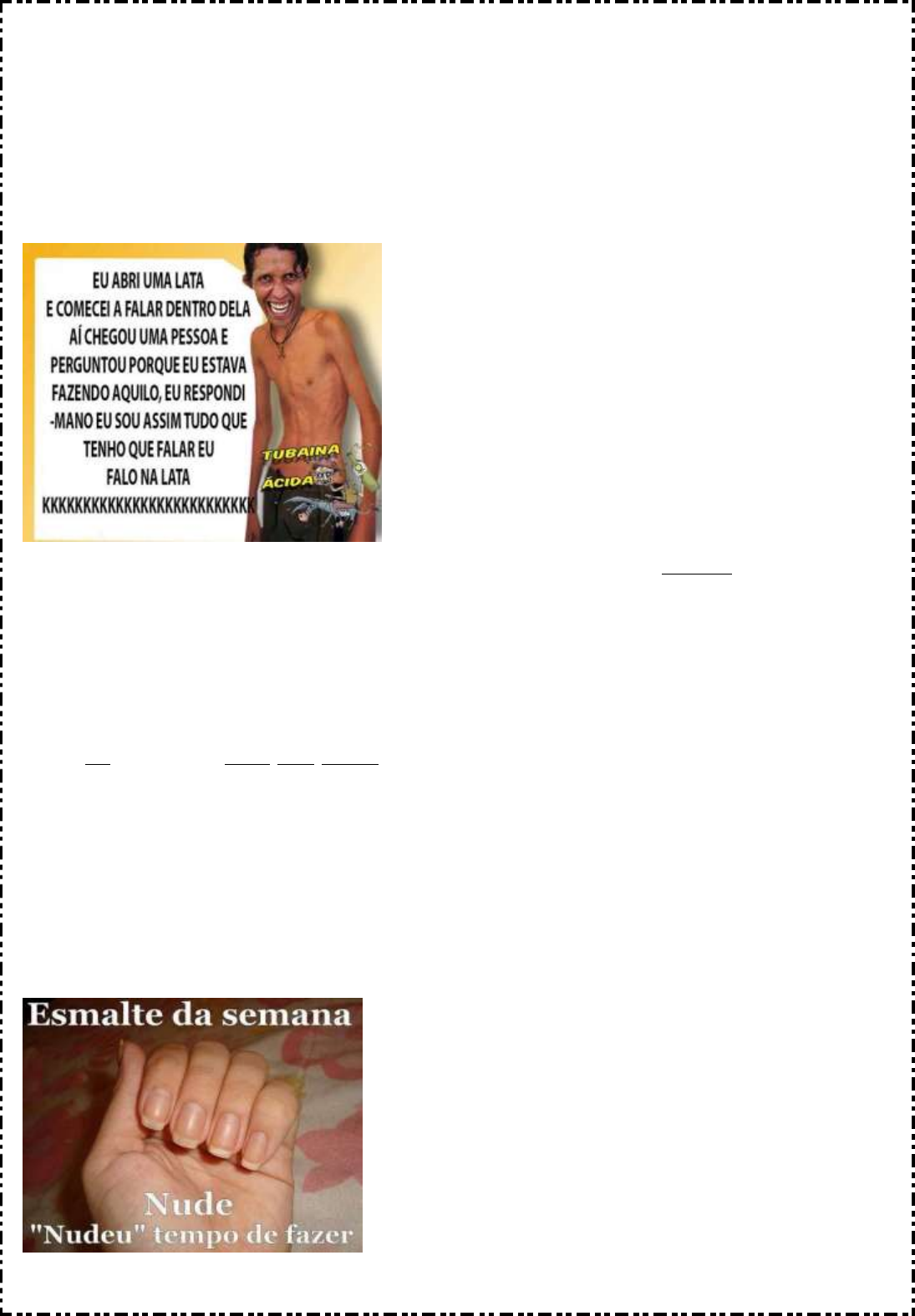 www.acessaber.com.br ESCOLA ________________________________________DATA:_____/_____/_____ PROF:______________________________________________TURMA:___________ NOME:_______________________________________________________________ Avaliação de Língua Portuguesa 1. Leia o texto abaixo: Observe a oração:...”perguntou porque eu estava...” a palavra porque é: a.um verbo. b.uma conjunção. c.um pronome. 2. “... eu sou assim tudo que tenho que falar, eu falo na lata...” na oração as palavras grifadas são respectivamente: a.pronome, advérbios, conjunção e verbo. b.pronome,verbo, advérbios e verbo. c.advérbios, verbo e pronomes. 3.Observe a imagem abaixo: Sabemos que preposição é a palavra que estabelece uma relação entre dois ou mais www.acessaber.com.br termos. Portanto no texto acima temos: a.duas preposições b.apenas uma preposição c.nenhuma preposição 4.Leia a tirinha: Na frase: “Hagar! Os construtores de telhado estão aqui!” temos: a.uma oração com período simples. b.duas orações com período composto. c.uma oração com período composto. 5.Leia: Qual é a linguagem utilizada no texto? a.linguagem coloquial b.linguagem padrão 6. O texto abaixo foi extraído do facebook de um adolescente. Este texto está escrito na linguagem coloquial, mais precisamente na linguagem digital, com abreviações e uso de expressões específicas. Apesar de não ser considerada “errada”, devemos utilizá-la em qualquer situação? Assinale uma alternativa apenas. a.Sim.Essa linguagem pode ser utilizada em uma conversa formal. www.acessaber.com.br b.Não devemos utilizá-la em uma conversa formal, pois a mesma é específica para conversas em redes sociais. c.Não. Devemos utilizá-la apenas em conversas com os pais. d. Não.Essa linguagem é específica para conversas em redes sociais, não devemos utilizá-la em uma conversa informal. 7.Leia os trechos de músicas abaixo: a."Eu nunca mais vou respirar Se você não me notar Eu posso até morrer de Fome Se você não me amar." (Cazuza - Exagerado) b.Não existiria som se não Houvesse o silêncio Não haveria luz se não Fosse a escuridão A vida é mesmo assim Dia e noite, não e sim ... Certas coisas (Lulu Santos) As figuras de linguagem representadas nas palavras destacadas nos dois trechos de músicas são respectivamente: a.hipérbole e antítese b.metáfora e aliteração c.comparação e antítese. 8.Leia o “meme” abaixo: Observe a frase:” não fique chateado...”, “...passar a vida gorda...” as palavras grifadas estão qualificando substantivos, portanto: a.são pronomes b.são verbos c. são adjetivos 9.Observe: www.acessaber.com.br Explique o duplo sentido da oração destacada: “Toda mulher deseja o par perfeito um para o coração e centenas para os pés”. 10.Analise a oração ““Toda mulher deseja o par perfeito” e responda (V) para verdadeiro e (F) para falso: a.( )Essa oração possui um período composto por duas orações, pois apresenta dois verbos. b.( ) Essa oração apresenta um período simples, pois é composta por um verbo apenas. c.( ) Essa oração apresenta um sujeito simples. d.( )O núcleo do sujeito dessa oração é “mulher”. e.( ) O predicado dessa oração é “deseja o par perfeito”.