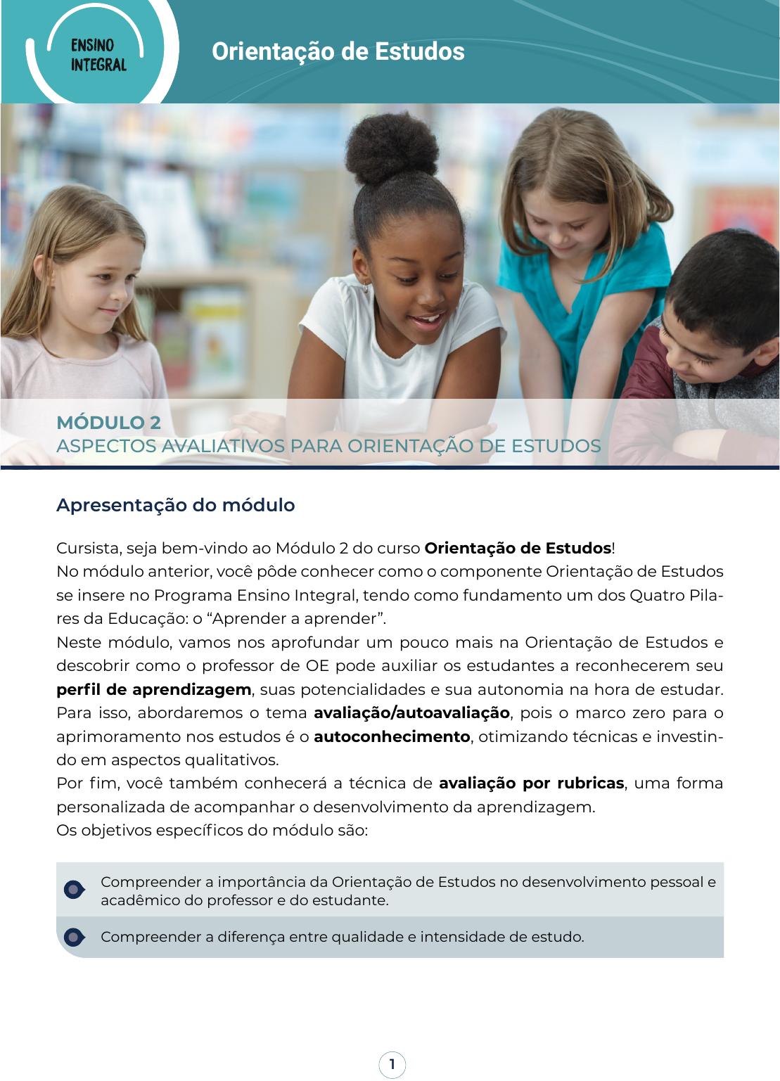 1 Orientação de Estudos MÓDULO 2 ASPECTOS AVALIATIVOS PARA ORIENTAÇÃO DE ESTUDOS Apresentação do módulo Cursista, seja bem-vindo ao Módulo 2 do curso Orientação de Estudos! No módulo anterior, você pôde conhecer como o componente Orientação de Estudos se insere no Programa Ensino Integral, tendo como fundamento um dos Quatro Pila- res da Educação: o “Aprender a aprender”. Neste módulo, vamos nos aprofundar um pouco mais na Orientação de Estudos e descobrir como o professor de OE pode auxiliar os estudantes a reconhecerem seu ȯƵȲ˛Ƕ�ƮƵ�ƊȯȲƵȁƮǞɹƊǐƵǿ, suas potencialidades e sua autonomia na hora de estudar. Para isso, abordaremos o tema ƊɨƊǶǞƊƪƣȌشƊɐɈȌƊɨƊǶǞƊƪƣȌ, pois o marco zero para o aprimoramento nos estudos é o ƊɐɈȌƧȌȁǘƵƧǞǿƵȁɈȌ, otimizando técnicas e investin- do em aspectos qualitativos. §ȌȲ�˛ǿة�ɨȌƧƺ� ɈƊǿƦƶǿ�ƧȌȁǘƵƧƵȲƋ�Ɗ� ɈƶƧȁǞƧƊ�ƮƵ�ƊɨƊǶǞƊƪƣȌ�ȯȌȲ� ȲɐƦȲǞƧƊȺ, uma forma personalizada de acompanhar o desenvolvimento da aprendizagem. �Ⱥ�ȌƦǯƵɈǞɨȌȺ�ƵȺȯƵƧǠ˛ƧȌȺ�ƮȌ�ǿȍƮɐǶȌ�ȺƣȌب Compreender a importância da Orientação de Estudos no desenvolvimento pessoal e acadêmico do professor e do estudante. Compreender a diferença entre qualidade e intensidade de estudo. 2 0�Ȍ�ȺƵɐ�(ǞƋȲǞȌ�ƮƵ�ƦȌȲƮȌد�!ȌǿȌ�ȺƵȲƋ�ȱɐƵ�ƵȺɈƋ�˛ƧƊȁƮȌد !ȌǿȌ�ɨȌƧƺ�ȺƊƦƵة�Ȍ�(ǞƋȲǞȌ�ƮƵ�ƦȌȲƮȌ�ƶ�ɐǿƊ�ȯȲƋɈǞƧƊ�ƮƵ�ƵȺɈɐƮȌة�ȯȌȲ� ǞȺȺȌ�ƵȺȯƵȲƊǿȌȺ�ȱɐƵ� você tenha separado um caderno, um bloco de notas ou até mesmo uma versão digi- tal de registro e tenha anotado as informações que considera importantes ou que lhe ƧǘƊǿƊȲƊǿ�ƊɈƵȁƪƣȌخ�yƵȺȺƵ�ƮȌƧɐǿƵȁɈȌة�ɨȌƧƺ�ɈƊǿƦƶǿ�ȯȌƮƵ�ǞȁƧǶɐǞȲ�ǞƮƵǞƊȺ�Ƶ�ȲƵ˜ƵɮȪƵȺ�ȱɐƵ� tenham lhe inspirado, propondo adaptações às suas aulas, caso esteja atuando como professor de Orientação de Estudos. Diário de bordo 3 Cursista, vamos abordar a autoavaliação como tema central para desenvolver o auto- ƧȌȁǘƵƧǞǿƵȁɈȌ�Ƶ�ƧȌǿȯȲƵƵȁƮƵȲ�ȺɐƊ�Ǟȁ˜ɐƺȁƧǞƊ�ȁƊȺ�ƧȌǿȯƵɈƺȁƧǞƊȺ�ȺȌƧǞȌƵǿȌƧǞȌȁƊǞȺخ��� seguir, conheça o conceito e os�ƦƵȁƵǏǠƧǞȌȺ�da autoavaliação. !ȌȁƧƵǞɈȌ A ƊɐɈȌƊɨƊǶǞƊƪƣȌ é um procedimento recorrente no ƊɐɈȌƧȌȁǘƵƧǞǿƵȁɈȌ. É uma ferramenta que pode transformar seu jeito de pensar e agir e que, se acompanhada de um plano de ação, pode orientar seus passos em direção aos seus objetivos. ƵȁƵǏǠƧǞȌȺ • Desenvolvimento de inteligência emocional que pode apoiar a construção do seu Projeto de Vida e seu plano de estudos. • Compreensão de si e dos seus valores. • Aperfeiçoamento das relações interpessoais. • Desenvolvimento da autorregulação. • Entendimento de seus potenciais, habilidades e competências, acompanhando seus progressos. Unidade 1 Autoavaliação Todos esses benefícios tornam-se mais claros quando olhamos para a autoavaliação como base para uma crítica construtiva e um desenvolvimento pessoal formativo. 4 Sob a perspectiva docente, uma avaliação assume, muitas vezes, a decisão de apre- sentar dados que comprovem a promoção ou a retenção dos estudantes. Como ex- ȯǶǞƧƊ�RȌǏǏǿƊȁȁ� �ةف׀׀ׂـ ǞȁɑǿƵȲȌȺ�ȯȲȌǏƵȺȺȌȲƵȺة�ȯƵǶƊ� ȺɐƊ�ǘǞȺɈȍȲǞƊ�ƮƵ�ɨǞƮƊ�Ƶ�ȯȌȲ�ɨƋȲǞƊȺ� Ǟȁ˜ɐƺȁƧǞƊȺ�ȺȌǏȲǞƮƊȺة�ƵȁɮƵȲǐƊǿ�Ɗ�ƊɨƊǶǞƊƪƣȌ�ƧȌǿȌ�ɐǿƊ�ȌƦȲǞǐƊƪƣȌ�Ɗ�ƧɐǿȯȲǞȲ�ȁƊ�ȺɐƊ�ȯȲȌ- ˛ȺȺƣȌة�ȱɐƵ�ƮƵɨƵ�ȺƵȲ�ƵɮƵȲƧǞƮƊ�ƮƊ�ǏȌȲǿƊ�ǿƊǞȺ�ȺƶȲǞƊ�ȯȌȺȺǠɨƵǶخ Hoffmann (2009) defende que a avaliação deve ser concebida como uma ação media- dora na qual alguns princípios devem ser considerados, como: oportunizar momentos de discussão para aqueles que foram avaliados e para quem os avaliou; ȲƵ˜ƵɈǞȲ�ȺȌƦȲƵ�ȌȺ�ٗȯȌȲȱɐƺȺ٘�ƮƊȺ�ȲƵȺȯȌȺɈƊȺ�ƮƊƮƊȺ�ȁƊ�ƊɨƊǶǞƊƪƣȌس utilizar os registros de avaliação como forma de acompanhar os estudantes e profes- sores diante do processo de aprendizagem e construção do conhecimento. ßƊǶƵ�ƧȌȁȺǞƮƵȲƊȲ�ȱɐƵ�ȲƵ˜ƵɈǞȲ�ƊƧƵȲƧƊ�ƮƊ�˛ȁƊǶǞƮƊƮƵ�ƮƊ�ƊɨƊǶǞƊƪƣȌ�ƶ�ǏɐȁƮƊǿƵȁɈƊǶ�ȯƊȲƊ�Ɗ� tomada de decisões a partir da interpretação de seus resultados. �Ⱥ�ƵɈƊȯƊȺ�ȲƵȯȲƵȺƵȁɈƊƮƊȺ�ȁƊ�˛ǐɐȲƊ�Ɗ�ȺƵǐɐǞȲ�ȯƵȲǿǞɈƵǿ�ƵȁɈƵȁƮƵȲǿȌȺ�ȱɐƵ�Ɗ�ƊɨƊǶǞƊƪƣȌ�ƶ� um caminho que vai além do uso de instrumentos diagnósticos, uma vez que envolve ȲƵ˜ƵɮƣȌة�ƊɐɈȌƧȲǠɈǞƧƊ�Ƶ�ȯȲȌɈƊǐȌȁǞȺǿȌخ Fonte: GENESEE & UPSHUR, 2009. 5 §ƊȲƊ�ȱɐƵ�ȌȺ�ƵȺɈɐƮƊȁɈƵȺ�ȲƵƊǶǞɹƵǿ�ȺɐƊ�ƊɐɈȌƊɨƊǶǞƊƪƣȌة�ƶ�ȁƵƧƵȺȺƋȲǞȌ�ȱɐƵة�ȁɐǿƊ�ƵɈƊȯƊ� ƊȁɈƵȲǞȌȲة� ƵǶƵȺ� ȺƵǯƊǿ�ƊɨƊǶǞƊƮȌȺ�ȯƵǶȌ�ȯȲȌǏƵȺȺȌȲ� Ƶة� ƊȺȺǞǿة� ȯȌȺȺƊǿ� ȲƵ˜ƵɈǞȲ� ȺȌƦȲƵ� ƊȺ� Ƶɮ- pectativas de aprendizagem que ainda não conseguiram atender. Para isso, existem ɨƋȲǞȌȺ� ƊȺȯƵƧɈȌȺ�ȱɐƵ�ȯȲƵƧǞȺƊǿ�ȺƵȲ� ƵȺɈɐƮƊƮȌȺ�Ȍɐ� ȲƵƧȌȁǘƵƧǞƮȌȺخ�ßƊǿȌȺ� ǞȁǞƧǞƊȲ�ȯƵǶƊȺ� XȁɈƵǶǞǐƺȁƧǞƊȺ�ǿɑǶɈǞȯǶƊȺ. §ȲȌȯȍȺǞɈȌ�ƮƊ�ƊɨƊǶǞƊƪƣȌ: Dar oportunidade para o professor rever a metodologia uti- ǶǞɹƊƮƊ�Ƶǿ�ȺɐƊ�ȯȲƋɈǞƧƊ�ȯƵƮƊǐȍǐǞƧƊ�Ƶة�ȯƊȲƊ�Ȍ�ƵȺɈ