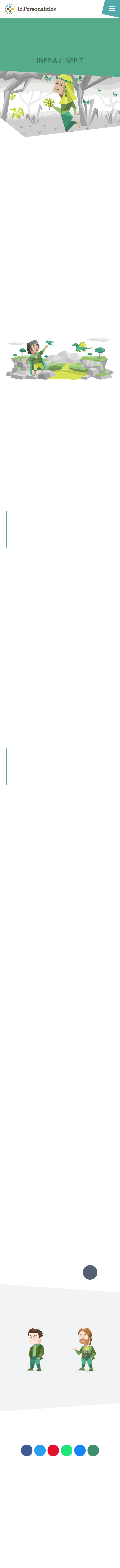 ©2011-2021 NERIS Analytics Limited Contact Terms & Conditions Privacy Policy Disclaimer: All non-English versions of the website contain uno!cial translations contributed by our users. They are not binding in any way, are not guaranteed to be accurate, and have no legal e"ect. The o!cial text is the English version of the website. Please consider reporting inaccuracies to support@16personalities.com or join our translation project! Strengths & Weaknesses ! 34K ! " # $ % " Personalidade “Mediador” Personalidades de Mediador são verdadeiros idealistas procurando o melhor mesmo nas piores pessoas e eventos, procurando um jeito de melhorar as coisas. Enquanto eles podem ser vistos como calmos, reservados, ou mesmo tímidos, Mediadores têm uma chama interior e uma paixão que pode realmente brilhar. Composto por apenas 4% da população, o risco de se sentir incompreendido é infelizmente alto para as pessoas com personalidade de Mediador – mas quando eles encontram pessoas com a mesma opinião para passar seu tempo, a harmonia que sentem será uma fonte de alegria e inspiração. Os Mediadores são guiados pelos seus princípios ao invés da razão, excitação ou praticidade. Ao decidir como avançar, eles vão olhar para a honra, beleza, moralidade e virtude – Mediadores são liderados pela pureza de sua intenção, não recompensas e punições. As pessoas que compartilham a personalidade de Mediador são orgulhosas desta qualidade, e com razão, mas nem todo mundo entende a unidade por trás desses sentimentos, e pode levar ao isolamento. Tudo o que é ouro não brilha; Nem todos que vagueiam estão perdidos; O velho que é forte não murcha; Raízes profundas não são atingidas pela geada. J. R. R. TOLKIEN Sabemos O Que Somos, Mas não Sabemos O Que Seremos Em todo seu esplendor, essas qualidades permitem que as pessoas com a personalidade de Mediador se comuniquem profundamente com os outros, falando facilmente em metáforas e parábolas, e compreendendo e criando símbolos para compartilhar suas ideias. A força deste estilo de comunicação intuitiva é boa para obras criativas, e não é de se surpreender que muitos famosos Mediadores são poetas, escritores e atores. Entender a si mesmos e seu lugar no mundo é importante para as personalidades de Mediador, e eles exploram essas ideias projetando-se em seu trabalho. Os Mediadores têm um talento de auto expressão, revelando sua beleza e seus segredos através de metáforas e personagens de !cção. A habilidade dos Mediadores com a linguagem também não para com a língua materna – eles são considerados dotados quando se trata de aprender uma segunda (ou terceira!) língua. Seu dom para a comunicação também se ajuda o desejo dos Mediadores pela harmonia e ajuda essas personalidades a avançar à medida que encontram sua vocação. Escute Muitas Pessoas, mas Fale Com Poucas Ao contrário das pessoas com uma personalidade mais social, os Mediadores irão concentrar a sua atenção em apenas algumas pessoas, uma única causa digna – excessivamente disseminados, eles vão #car sem energia e #carão desanimados e oprimidos por todos os maus no mundo que eles não podem corrigir. Isto é uma visão triste para os amigos dos Mediadores que dependerão de suas visões otimistas. Se eles não tomarem cuidado, os Mediadores podem perder-se em sua busca pelo bem e negligenciar o cuidado que a vida exige no dia-a-dia. Os Mediadores muitas vezes derivam em pensamento profundo, desfrutando contemplando o hipotético e o #losó#co mais do que qualquer outro tipo de personalidade. Na ausência de controle, as personalidades do Mediador podem começar a perder contato, se retirando e entrando em "modo eremita", o que fazer com que os amigos ou parceiros tenham que usar uma grande dose de energia para trazê-los de volta ao mundo real. Felizmente, como as $ores na primavera, o afeto, a criatividade, o altruísmo e o idealismo do Mediador sempre voltará, grati#cando aqueles que amamos, talvez não com a lógica e a utilidade, mas com uma visão do mundo que inspira compaixão e bondade e beleza aonde quer que vá. Mediadores Que Você Possa Conhecer Personalidade Mediador INFP-A / INFP-T Sybil Branson Downton Abbey Lance Sweets Bones Konstantin Levin Anna Karenina # 16/04/2021 20:58 Página 1 de 1