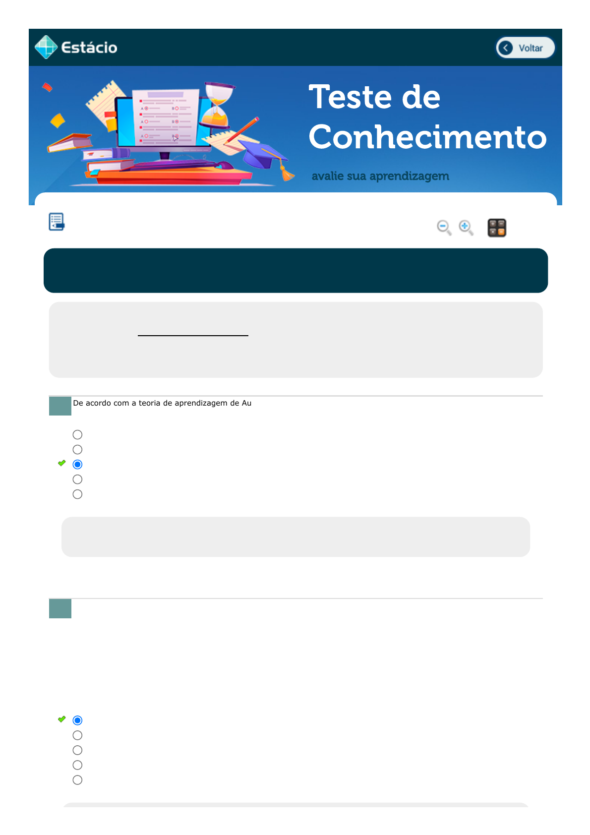 02/05/2022 23:44 Estácio: Alunos https://simulado.estacio.br/alunos/ 1/4 Teste de Conhecimento avalie sua aprendizagem De acordo com a teoria de aprendizagem de Ausubel (1918-2008), quando uma ideia ou informação nova se relaciona com conceitos já assimilados, determina-se a aprendizagem: Sabemos que tanto a realidade aumentada quanto a realidade virtual são consideradas tecnologias imersivas. E embora ambas possam proporcionar uma aprendizagem verdadeiramente significativa, elas não possuem as mesmas características. Sobre essas características, podemos afirmar: I - O ambiente de interação da realidade virtual é sempre virtual; da realidade aumentada é, às vezes real. II - A realidade virtual possui processamento de tempo sempre assíncrono; a realidade aumentada, sempre síncrono. III - Enquanto a realidade virtual necessita de óculos ou telas especiais, a realidade aumentada pode ser utilizada através de um smartphone. Sobre as afirmativas acima: METODOLOGIAS ATIVAS E GAMIFICAÇÃO Lupa Calc. EEL0100_202109528408_TEMAS Aluno: JAQUELINE TEIXEIRA ALVES Matr.: 202109528408 Disc.: MET. ATIV E GAM. 2022.1 EAD (G) / EX Prezado (a) Aluno(a), Você fará agora seu TESTE DE CONHECIMENTO! Lembre-se que este exercício é opcional, mas não valerá ponto para sua avaliação. O mesmo será composto de questões de múltipla escolha. Após responde cada questão, você terá acesso ao gabarito comentado e/ou à explicação da mesma. Aproveite para se familiarizar com este modelo de questões que será usado na sua AV e AVS. 1. Exteriorizada Estruturativa Interiorizada Significativa Mecânica Data Resp.: 02/05/2022 23:30:28 Explicação: A resposta correta é: Interiorizada 2. Somente III é verdadeira. Somente II é verdadeira. Somente I é verdadeira. Somente I e II são verdadeiras. Somente II e III são verdadeiras. Data Resp.: 02/05/2022 23:31:55 javascript:voltar(); javascript:voltar(); javascript:diminui(); javascript:aumenta(); javascript:calculadora_on(); 02/05/2022 23:44 Estácio: Alunos https://simulado.estacio.br/alunos/ 2/4 De acordo com Patricia Behar, o modelo pedagógico pode ser visto como um "recorte multidimensional", que traz no cerne um elemento denominado de "Arquitetura Pedagógica" (AP), composta por aspectos organizacional, de conteúdo, metodológico e tecnológico. Todos esses aspectos de uma AP precisam ser concebidos de forma bem articulada e integrada para que a concepção da proposta educacional seja coesa. (BEHAR, P.A. (Org). Modelos pedagógicos para a educação a distância. Porto Alegre: Artmed, 2009.) Dessa forma, podemos afirmar que o aspecto metodológico compreende: Quando pensamos em adotar as metodologias ativas de aprendizagem em contextos educativos, torna-se fundamental conhecer os fundamentos teóricos e pedagógicos que fundamentam seu uso. Conforme o que estudamos neste tema, assinale a alternativa que apresenta essas teorias. O aplicativo Duolingo utiliza elementos de jogos como pontos, barras de progresso e níveis para motivar os estudantes a aprenderem um novo idioma. Podemos dizer que se trata de um exemplo de: Explicação: A resposta correta é: Somente III é verdadeira. 3. A seleção do que será trabalhado (o tema, os conceitos, as competências a serem desenvolvidas). A forma, ou método, pelo qual será conduzido o currículo, isto significa como os conteúdos programáticos serão organizados e trabalhados para que o aluno aprenda. Os fundamentos teóricos e pedagógicos que embasam o uso das tecnologias em práticas educativas. A seleção de recursos para trabalhar com os conteúdos planejados que precisam estar coerentes com a proposta pedagógica adotada. O planejamento das ações pedagógicas, ou seja, refere-se ao plano de ensino de uma disciplina, aula ou curso. Data Resp.: 02/05/2022 23:35:16 Explicação: A resposta correta é: A forma, ou método, pelo qual será conduzido o currículo, isto significa como os conteúdos programáticos serão organizados e trabalhados para que o aluno aprenda. 4. Aprendizagem significativa; Comportamentalismo; Humanismo. Cognitivismo; Construtivismo; Socioconstrutivismo; Behaviorismo. Comportamentalismo; Cognitivismo; Construtivismo; Socioconstrutivismo. Cognitivismo; Construtivismo; Socioconstrutivismo; Conectivismo. Behaviorismo; Cognitivismo; Construtivismo; Humanismo. Data Resp.: 02/05/2022 23:37:13 Explicação: A resposta correta é: Cognitivismo; Construtivismo; Socioconstrutivismo; Conectivismo. 5. 02/05/2022 23:44 Estácio: Alunos https://simulado.estacio.br/alunos/ 3/4 Um dos primeiros autores a refletir sobre a utilização de jogos em educação, Abt (Serious Gams, 1987) afirma que: "Jogos são dispositivos de ensino e treinamento efetivos para alunos de qualquer idade, e em muitas situações, porque são altamente motivadores e comunicam muito eficientemente conceitos e fatos em muitas áreas. Eles criam representações dramáticas do problema real sendo estudado. Os jogadores assumem papéis realistas, encaram problemas, formulam estratégias, tomam decisões e recebem feedback rápido da consequência de suas ações.". Essa descrição corresponde mais propriamente ao conceito de: Abraham Palatnik foi um dos pioneiros da arte cinética no país, que se aproveita de fenômenos físicos, ilusão de ótica e montagens com o posicionamento de peças. Assinale a alternativa que não corresponde a uma obre de arte cinética: A ABP deve ser caracterizada corretamente como: Jogo imersivo Gamificação estrutural Gamificação de conteúdo Jogo comercial Modelo MDA Data Resp.: 02/05/2022 23:39:07 Explicação: A resposta correta é: Gamificação estrutural 6. Modding Gamificação Fluxo Aprendizagem baseada em recompensas Aprendizagem baseada em jogos Data Resp.: 02/05/2022 23:40:15 Explicação: A resposta correta é: Aprendizagem baseada em jogos 7. Móbile feito de peças penduradas se movimentando livremente. Uma série de pequenas peças de acrílico que se movi