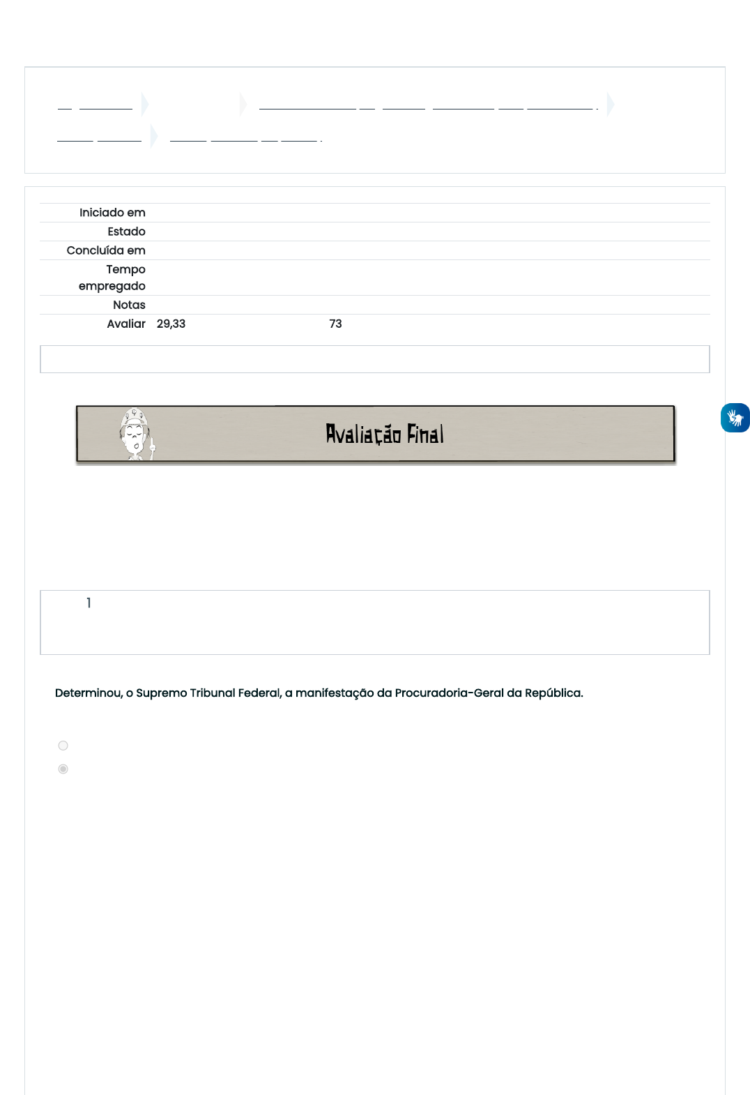 Página inicial Meus cursos STF Educa - O Emprego da Vírgula em 4 Lições (Turma 2022) Avaliação Final Avaliação final (40 pontos) Iniciado em quinta, 5 Mai 2022, 11:24 Estado Finalizada Concluída em quinta, 5 Mai 2022, 11:35 Tempo empregado 10 minutos 49 segundos Notas 11,00/15,00 Avaliar 29,33 de um máximo de 40,00(73%) Informação Questão 1 Correto Atingiu 1,00 de 1,00 Com base no que estudamos sobre a virgulação ao longo deste curso – a saber: ordem direta; intercalação e inversão; nomes próprios; vocativo; dispositivos de lei; oração adjetiva explicativa; oração adjetiva restritiva; oração subordinada adverbial; verbo subentendido –, analise as questões: Determinou, o Supremo Tribunal Federal, a manifestação da Procuradoria-Geral da República. Escolha uma opção: Verdadeiro Falso Ainda que o sujeito da forma verbal “determinou” apareça posposto e intercalado entre o verbo e seu complemento, não usamos vírgulas entre sujeito, verbo e seus complementos. https://ead.stf.jus.br/ https://ead.stf.jus.br/course/view.php?id=235 https://ead.stf.jus.br/course/view.php?id=235§ion=5 https://ead.stf.jus.br/mod/quiz/view.php?id=8874 Questão 2 Correto Atingiu 1,00 de 1,00 Questão 3 Incorreto Atingiu 0,00 de 1,00 Questão 4 Correto Atingiu 1,00 de 1,00 Implica potencial risco a manutenção da decisão atacada. Escolha uma opção: Verdadeiro Falso Ainda que o sujeito da forma verbal “implica” apareça posposto, não usamos vírgula entre sujeito e verbo. Contra sentença de improcedência o referido Sindicato interpôs apelação. Escolha uma opção: Verdadeiro Falso Ainda que o complemento da forma verbal “interpôs” apareça deslocado, não usamos vírgula entre verbo e seus complementos. O Presidente do Senado Federal, Renan Calheiros, recebe carta de intenção de vereadores. Escolha uma opção: Verdadeiro Falso O termo “Renan Calheiros” está entre vírgulas por se tratar de um aposto explicativo. Só há um presidente do Senado Federal. Questão 5 Incorreto Atingiu 0,00 de 1,00 Questão 6 Correto Atingiu 1,00 de 1,00 Questão 7 Incorreto Atingiu 0,00 de 1,00 O Ministro do STF, Teori Zavascki, negou pedido feito pelos advogados. Escolha uma opção: Verdadeiro Falso O termo “Teori Zavascki” é aposto restritivo, por isso não usamos vírgulas. Existem outros ministros do STF, mas estamos nos referindo a Teori Zavascki. Senhor Coordenador, conforme solicitação, envio o arquivo com as imagens do evento. Escolha uma opção: Verdadeiro Falso O termo “Senhor coordenador” é vocativo e, por isso, deve vir isolado por vírgula. Citou o princípio previsto no art. 37, II da Constituição Federal. Escolha uma opção: Verdadeiro Falso É necessário usar vírgulas para marcar a intercalação do inciso. Questão 8 Correto Atingiu 1,00 de 1,00 Questão 9 Correto Atingiu 1,00 de 1,00 Questão 10 Correto Atingiu 1,00 de 1,00 O presente mandado volta-se contra o Decreto 8.616/2015 que regulamenta a LC 148/2015. Escolha uma opção: Verdadeiro Falso Trata-se de uma oração subordinada adjetiva explicativa, que acrescenta uma informação acessória, ampliando ou esclarecendo um detalhe de um conceito que já se encontra definido. O termo antecedente “o Decreto 8.616/2015” está definido. Vencido o Conselheiro Esdras Saliba, que votou no sentido de aplicar a pena de disponibilidade. Escolha uma opção: Verdadeiro Falso Trata-se de uma oração subordinada adjetiva explicativa, que acrescenta uma informação acessória, ampliando ou esclarecendo um detalhe de um conceito que já se encontra definido. O termo antecedente “o Conselheiro Esdras Saliba” está definido. O art. 41, § 1º e § 5º, do Regimento Interno do CNMP, prevê esse tipo de intimação. Escolha uma opção: Verdadeiro Falso Não se usa vírgula entre sujeito (“O art. 41, § 1º e § 5º, do Regimento Interno do CNMP”) e verbo (“prevê”). Questão 11 Correto Atingiu 1,00 de 1,00 Questão 12 Correto Atingiu 1,00 de 1,00 Questão 13 Correto Atingiu 1,00 de 1,00 O impetrante requer a imediata suspensão da decisão; a defesa, a ausência de ofensa à ordem pública. Escolha uma opção: Verdadeiro Falso Usamos o ponto e vírgula para separar as duas orações e a vírgula para marcar a omissão da forma verbal “requer” na segunda oração. Conforme advertido pela PGR esta tem sido a orientação da jurisprudência desta Corte. Escolha uma opção: Verdadeiro Falso Usamos a vírgula para marcar a anteposição da oração adverbial conformativa à oração principal. O servidor público, em face do princípio da publicidade administrativa, não detém a mesma proteção destinada à intimidade e à vida privada de que goza o cidadão comum. Escolha uma opção: Verdadeiro Falso Usamos as vírgulas para marcar a intercalação da expressão “em face do princípio da publicidade administrativa” na oração. Questão 14 Incorreto Atingiu 0,00 de 1,00 Questão 15 Correto Atingiu 1,00 de 1,00 Se um direito adquirido por força de decisão judicial transitada em julgado está em desacordo com os preceitos constitucionais, ele pode ser reduzido. Escolha uma opção: Verdadeiro Falso Usamos a vírgula para marcar a anteposição da oração adverbial condicional à oração principal. Os §§ 1º e 2º do art. 6º da Lei 11.882/2008 estabelecem a nulidade de convênios celebrados entre os órgãos de trânsito estaduais e os titulares das serventias extrajudiciais. Escolha uma opção: Verdadeiro Falso Não usamos vírgulas entre os elementos dos dispositivos legais quando dispostos do menor para o maior. Atividade anterior ◄ Atividade avaliativa - aula 4 (15 pontos) Seguir para... Próxima atividade Avaliação de reação ► https://ead.stf.jus.br/mod/quiz/view.php?id=8872&forceview=1 https://ead.stf.jus.br/mod/questionnaire/view.php?id=8877&forceview=1 Contato ead@stf.jus.br Portal www.stf.jus.br Política de Privacidade mailto:ead@stf.jus.br https://www.
