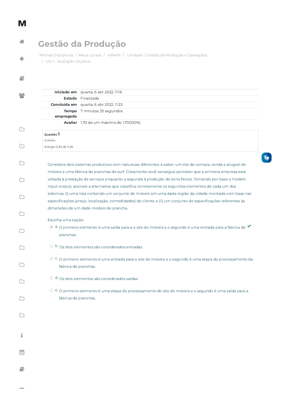 15/04/2022 12:41 UN 1 - Avaliação Objetiva: Revisão da tentativa https://avap.multivix.edu.br/mod/quiz/review.php?attempt=1018767&cmid=1034801 1/5 Minhas Disciplinas / Meus cursos / 418404 / Unidade 1: Gestão da Produção e Operações / UN 1 - Avaliação Objetiva Gestão da Produção Iniciado em quarta, 6 abr 2022, 11:16 Estado Finalizada Concluída em quarta, 6 abr 2022, 11:23 Tempo empregado 7 minutos 33 segundos Avaliar 1,70 de um máximo de 1,70(100%) Questão 1 Correto Atingiu 0,34 de 0,34 Considere dois sistemas produtivos com naturezas diferentes, a saber: um site de compra, venda e aluguel de imóveis e uma fábrica de pranchas de surf. Claramente você consegue perceber que a primeira empresa está voltada à prestação de serviços enquanto a segunda à produção de bens físicos. Tomando por base o modelo input-output, assinale a alternativa que classi�ca corretamente os seguintes elementos de cada um dos sistemas: (i) uma lista contendo um conjunto de imóveis em uma dada região da cidade montada com base nas especi�cações (preço, localização, comodidades) do cliente e (ii) um conjunto de especi�cações referentes às dimensões de um dado modelo de prancha. Escolha uma opção: a. O primeiro elemento é uma saída para a o site de imóveis e o segundo é uma entrada para a fábrica de pranchas. b. Os dois elementos são considerados entradas. c. O primeiro elemento é uma entrada para o site de imóveis e o segundo é uma etapa do processamento da fábrica de pranchas. d. Os dois elementos são considerados saídas. e. O primeiro elemento é uma etapa do processamento do site de imóveis e o segundo é uma saída para a fábrica de pranchas. https://avap.multivix.edu.br/my/ https://avap.multivix.edu.br/course/view.php?id=14143 https://avap.multivix.edu.br/course/view.php?id=14143§ion=2 https://avap.multivix.edu.br/mod/quiz/view.php?id=1034801 https://avap.multivix.edu.br/my/ https://avap.multivix.edu.br/course/view.php?id=14143 https://avap.multivix.edu.br/user/index.php?id=14143 https://avap.multivix.edu.br/course/view.php?id=14143§ion=1 https://avap.multivix.edu.br/course/view.php?id=14143§ion=2 https://avap.multivix.edu.br/course/view.php?id=14143§ion=3 https://avap.multivix.edu.br/course/view.php?id=14143§ion=4 https://avap.multivix.edu.br/course/view.php?id=14143§ion=5 https://avap.multivix.edu.br/course/view.php?id=14143§ion=6 https://avap.multivix.edu.br/course/view.php?id=14143§ion=7 https://avap.multivix.edu.br/course/view.php?id=14143§ion=8 https://avap.multivix.edu.br/course/view.php?id=14143§ion=9 https://avap.multivix.edu.br/course/view.php?id=14143§ion=10 https://avap.multivix.edu.br/course/view.php?id=14143§ion=11 https://avap.multivix.edu.br/course/view.php?id=14143§ion=12 https://avap.multivix.edu.br/mod/page/view.php?id=1252%2F%22%20target%3D%22_blank https://avap.multivix.edu.br/calendar/view.php/ https://avap.multivix.edu.br/local/staticpage/view.php?page=biblioteca https://portalweb.multivix.edu.br/gabaritos/login.aspx https://avap.multivix.edu.br/ 15/04/2022 12:41 UN 1 - Avaliação Objetiva: Revisão da tentativa https://avap.multivix.edu.br/mod/quiz/review.php?attempt=1018767&cmid=1034801 2/5 Questão 2 Correto Atingiu 0,34 de 0,34 Conforme as demandas do mercado consumidor passaram a patamares mais complexos, as empresas se viram na necessidade de adaptar seus sistemas produtivos de modo a contemplar não apenas a produção de bens físicos e tangíveis, mas também serviços com valor agregado ao cliente. A gestão da produção é o campo de conhecimento responsável pela estruturação dos sistemas responsáveis pela transformação de insumos em produtos ou serviços. No que se refere à relação da função produção com o atendimento da demanda de bens físicos e serviços, analise as asserções a seguir e a relação proposta entre elas. I. O termo “produção” está mais próximo às atividades industriais. PORQUE II. As operações referem-se às atividades dos prestadores de serviços em sistemas como bancos, agências de viagens, restaurantes, faculdades, etc. A respeito dessas asserções, assinale a opção correta. Escolha uma opção: a. As asserções I e II são proposições falsas. b. As asserções I e II são proposições verdadeiras, e a II é uma justi�cativa correta da I. c. As asserções I e II são proposições verdadeiras, mas a II não é uma justi�cativa da I. d. A asserção I é uma proposição verdadeira, e a II é uma proposição falsa. e. A asserção I é uma proposição falsa, e a II é uma proposição verdadeira. https://avap.multivix.edu.br/my/ https://avap.multivix.edu.br/course/view.php?id=14143 https://avap.multivix.edu.br/user/index.php?id=14143 https://avap.multivix.edu.br/course/view.php?id=14143§ion=1 https://avap.multivix.edu.br/course/view.php?id=14143§ion=2 https://avap.multivix.edu.br/course/view.php?id=14143§ion=3 https://avap.multivix.edu.br/course/view.php?id=14143§ion=4 https://avap.multivix.edu.br/course/view.php?id=14143§ion=5 https://avap.multivix.edu.br/course/view.php?id=14143§ion=6 https://avap.multivix.edu.br/course/view.php?id=14143§ion=7 https://avap.multivix.edu.br/course/view.php?id=14143§ion=8 https://avap.multivix.edu.br/course/view.php?id=14143§ion=9 https://avap.multivix.edu.br/course/view.php?id=14143§ion=10 https://avap.multivix.edu.br/course/view.php?id=14143§ion=11 https://avap.multivix.edu.br/course/view.php?id=14143§ion=12 https://avap.multivix.edu.br/mod/page/view.php?id=1252%2F%22%20target%3D%22_blank https://avap.multivix.edu.br/calendar/view.php/ https://avap.multivix.edu.br/local/staticpage/view.php?page=biblioteca https://portalweb.multivix.edu.br/gabaritos/login.aspx https://avap.multivix.edu.br/ 15/04/2022 12:41 UN 1 - Avaliação Objetiva: Revisão da tentativa https://avap.multivix.edu.br/mod/quiz/review.php?attempt=1018767&cmid=1034801 3/5 Questão 3 Correto Atingiu 0,34 de 0,34 Apesar do termo produ