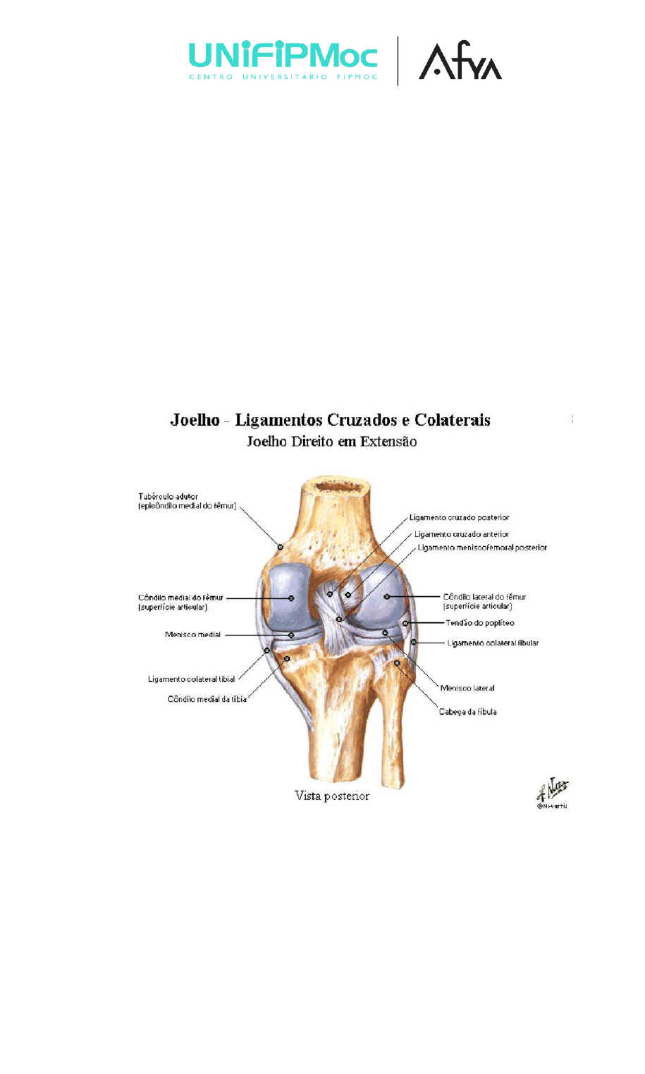 TICS 08 - LIGAMENTO DO JOELHO Acadêmica: Amanda Gabriela Oliveira Aquino Turma: 2º Período – Medicina Data: 26/ 04 / 2022 1- Quais são os ligamentos do joelho? A cápsula articular é fortalecida por cinco ligamentos extracapsulares ou capsulares (intrínsecos), sendo eles: • Ligamento da patela • Ligamento colateral fibular • Ligamento colateral tibial • Ligamento poplíteo obliquo • Ligamento poplíteo arqueado • Ligamentos intracapsulares: ligamento cruzado anterior e cruzado posterior. O ligamento da patela é o ligamento anterior da articulação do joelho os retículos formam a cápsula articular do joelho de cada lado da patela; eles possuem importante papel na manutenção e alinhamento da patela em relação à face articular patelar do fêmur. Durante a flexão os ligamentos se tornam mais frouxos, permitindo e limitando a rotação do joelho. 2- O que ocorre (do ponto de vista clínico - biodinâmico) com o paciente com lesão total de cada um destes ligamentos (joelho)? Lesão do ligamento colateral tibial (medial) É a lesão ligamentar mais comum do joelho. Quando o paciente é acometido de maneira isolada por uma lesão nesse ligamento, tende a apresentar dor e inchaço localizado, hemartrose (derrame de sangue dentro da articulação). Lesão do ligamento colateral fibular (lateral) Menos comuns, se comparadas ao do colateral medial. Geralmente mais graves e raramente acontecem de maneira isolada. Lesão do ligamento cruzado anterior Suas lesões ligamentares são mais recorrentes em esportes nos quais os pés estão fixados ao solo e a perna sofre rotação juntamente com o corpo. Por exemplo: futebol, basquete e esqui. Com a rotação no joelho o paciente pode ouvir um estalo no momento da lesão e não conseguira mais prosseguir a atividade normalmente. A incidência desse tipo de lesão é maior em pessoas acima de 30 anos. Lesão do ligamento cruzado posterior Sua lesão é mais comum do que a lesão do ligamento cruzado anterior. A lesão é isolada e é resultado de queda sobre o tubérculo tibial. REFERÊNCIAS: MOORE, Keith L.; DALLEY, Arthur F. Anatomia orientada para a clínica. 6 ed. Rio De Janeiro: Editora Guanabara Koogan S.A., 2011 TORTORA, G.J.; DERRICKSON, Bryan. Corpo humano: fundamentos de anatomia e fisiologia. Porto Alegre: Artmed, 2012. TICS 08 - LIGAMENTO DO JOELHO 1- Quais são os ligamentos do joelho? A cápsula articular é fortalecida por cinco ligamentos extracapsulares ou capsulares (intrínsecos), sendo eles: • Ligamento da patela • Ligamento colateral fibular • Ligamento colateral tibial • Ligamento poplíteo obliquo • Ligamento poplíteo arqueado • Ligamentos intracapsulares: ligamento cruzado anterior e cruzado posterior. O ligamento da patela é o ligamento anterior da articulação do joelho os retículos formam a cápsula articular do joelho de cada lado da patela; eles possuem importante papel na manutenção e alinhamento da patela em relação à face articular patelar d... 2- O que ocorre (do ponto de vista clínico - biodinâmico) com o paciente com lesão total de cada um destes ligamentos (joelho)?