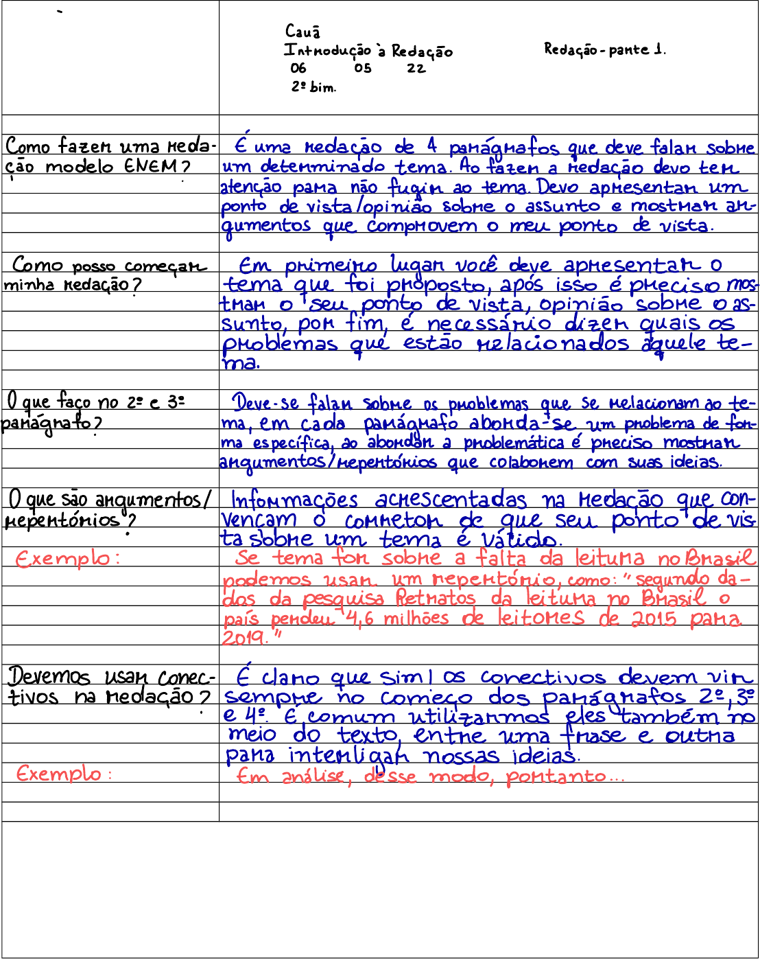 FOLHA DE ANOTAÇÕES CORNELL Nome: ________________________________________ Aula: ______________________ Tópico: ________________________ Data: _______/ _____/ ________ Período ______ PERGUNTAS ANOTAÇÕES RESUMO: Escreva 4 ou mais sentenças descrevendo o que você aprendeu destas anotações. __________________________________________________________________________________________ __________________________________________________________________________________________ __________________________________________________________________________________________ __________________________________________________________________________________________ __________________________________________________________________________________________ - Cauã Introdução à Redação Redação - parte 1 . 06 05 22 2º bim. Como fazem uma Meda - É uma redação de 1- parágrafos que deve falar sobre ção modelo ENEM ? um determinado tema . Ao fazer a redação devo ter atenção para não fugir ao tema. Devo apresentar um ponto de vista /opinião sobre o assunto e mostramargumentosque comprovem o meu ponto de vista . Como posso começar Em primeiro lugar você deve apresentar o minha redação ? tema que foi proposto , após isso é precisomostraro seu ponto de vista, opinião sobre oassunto , por fim, é necessário dizer quais os problemas que estão relacionados aqueletema . O que faço no 2º e 3º Deve - se falam sobre os problemas que se relacionam ao te- parágrafo ? ma , em cada parágrafo aborda- se um problema deformaespecífica, ao abordar a problemática é preciso mostrar argumentos/repertórios que colaborem com suas ideias. O que são argumentos/ Informações acrescentadas na redação que con- repertórios ? Vençam o corretor de que seu ponto devistasobre um tema é válido . Exemplo : Se tema for sobre a falta da leitura noBrasil podemos usar um repertório , como : " segundodadosda pesquisa Retratos da leitura no Brasil o país perdeu 4,6 milhões de leitores de 2015 para 2019 . " Devemos usar conec- É claro que sim ! Os conectivos devem vir tivos na redação ? Sempre no começo dos parágrafos 2º , 3º ' e 4º. É comum utilizaremos eles também no meio do texto , entre uma frase e outra para interligar nossas ideias .Exemplo : Em análise , desse modo , portanto . . . FOLHA DE ANOTAÇÕES CORNELL Nome: ________________________________________ Aula: ______________________ Tópico: ________________________ Data: _______/ _____/ ________ Período ______ PERGUNTAS ANOTAÇÕES RESUMO: Escreva 4 ou mais sentenças descrevendo o que você aprendeu destas anotações. __________________________________________________________________________________________ __________________________________________________________________________________________ __________________________________________________________________________________________ __________________________________________________________________________________________ __________________________________________________________________________________________ Cauã Redação - parteI Redação - parte I 07 05 2022 2º bim . O que colocam no ÚHI - No último parágrafo devemos solucionar os problemas no parágrafo ? que estão ligados ao tema , apresentando uma ou duas soluções possíveis que respeitem osdireitoshumanos . É preciso detalhar bem essa solução, respondendo as seguintes perguntas : quem irásolucionar/ amenizam o problema ? ; o que será feito ? ; como será feito? e para quê ? Quantas linhas devo introdução : 4- 6 linhas fazem em cada pará segundo : G - 9 linhas gmafo? terceiro : 6-9 linhas quanto : 6- 8 linhas BÔNUS : antes de iniciar uma redação pesquise sobre o = tema com o objetivo de obterconhecimentosobre o assunto e selecionar argumentos para utilizar no texto; faça um recorte do tema C-✗ : a falta de leitores no Brasil e suas consequências . ↳ tema ↳ lugar ↳ abordagem a proposta pede para falarmos sobre a falta de leitores de um local em específico : Brasil. pede ainda para mostrar as consequências desse tema . O que são os são os agentes responsáveis por solucionar GOMIFES ? Os problemas. G : governo E : escola 0 : ONGs S : sociedade M : mídia I : Igreja F : família Análise de redação : +_oAEEtAEoA-oooTm opinião / tese problema repertório /argumento histórico agente ◦ que será feito para quê ? A Tabela de conectivos : �"&)%"�"���"&)%"�"��