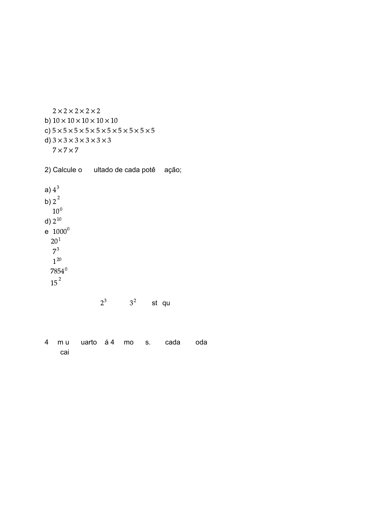 Exercícios de Potenciação Prof. Juan Carlos Lamônica 1) Represente cada multiplicação por meio de uma potência: a) 2 × 2 × 2 × 2 × 2 b) 10 × 10 × 10 × 10 × 10 c) 5 × 5 × 5 × 5 × 5 × 5 × 5 × 5 × 5 × 5 d) 3 × 3 × 3 × 3 × 3 × 3 e) 7 × 7 × 7 2) Calcule o resultado de cada potênciação; a) 43 b) 2 2 c) 100 d) 210 e) 10000 f) 201 g) 73 h) 120 i) 78540 j) 15 2 3) É verdade que é igual ? Justifique.23 32 4) Em um quarto, há 4 cômodoas. Em cada cômoda há quatro gavetas. Em cada gaveta, há 4 caixas. Em cada caixa, há 4 lenços. Quantos lenços há ao todo nesse quarto?