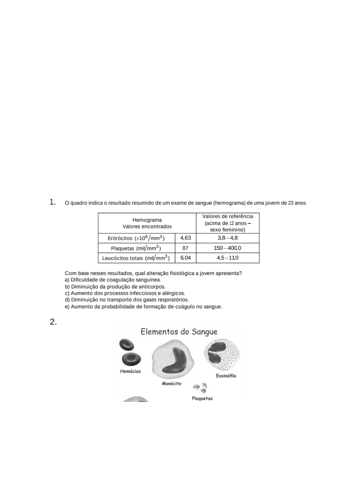 TECIDO SANGUINEO (PUC-PR) Em relação aos elementos figurados do sangue, associe a coluna 2 de acordo com a coluna 1: Coluna 1 - Leucócitos I. Neutrófilos II. Eosinófilos III. Linfócitos IV. Basófilos Coluna 2 - Característica ou Função a. Constituem de 2 a 4% dos leucócitos e atuam defendendo o corpo, agindo nas alergias. b. Leucócitos com núcleo volumoso e formato irregular, encontrados em menor frequência no sangue (0 a 1%). c. Leucócitos são encontrados com maior frequência no sangue (cerca de 60 a 70% do total dos leucócitos). São mais ativos na fagocitose e seus grãos ricos em enzimas digestivas. Correspondem de 20 a 30% dos leucócitos, sendo as principais células responsáveis pelo sistema imunitário. Assinale a opção que apresenta a associação correta: a) I-c; II-a; III-d; IV-b b) I-a; II-c; III-d; IV-b c) I-a; II-b; III-d; IV-c d) I-b; II-a; III-c; IV-d e) I-d; II-c; III-a; IV-b 2. O tecido hematopoiético (do grego hematos, sangue, e poese, formação, origem) é um tipo de tecido conjuntivo responsável pela produção de células sanguíneas e da linfa, e se localiza no interior de alguns tipos de ossos. O sangue circula pelo sistema vascular em animais com sistemas circulatórios fechados. É formado por uma porção celular de natureza diversificada chamada “elementos figurados” do sangue, que circula em suspensão em meio fluido, o plasma. Em relação ao tecido hematopoiético e sua constituição, assinale a alternativa CORRETA. a) Os linfócitos apresentam-se com núcleo bilobado e citoplasma preenchido por muitos grânulos róseos. Móveis e fagocitários atuam nos organismos envolvidos por reações alérgicas. b) Os leucócitos, também chamados de glóbulos brancos, fazem parte da linha de coagulação sanguínea e são acionados em casos de infecções, para que cheguem aos tecidos na tentativa de destruírem os agressores, como vírus e bactérias. c) As hemácias são conhecidas como glóbulos vermelhos devido ao seu alto teor de hemoglobina, uma proteína avermelhada que contém ferro em sua composição. A hemoglobina capacita as hemácias a transportar o oxigênio a todas as células do organismo. d) As plaquetas, por serem fragmentos de células, fazem parte do plasma sanguíneo. e) O sangue é composto aproximadamente por 66% de elementos figurados (células: hemácias, leucócitos e plaquetas) e 34% de plasma (matriz extracelular). Ou seja, a maior parte do sangue é composta por células. 5. Estão corretas, apenas: a) I, II e III b) II, III e IV c) I, III e IV d) I, IV e V e) I, II e V 7. Pesquisadores criaram um tipo de plaqueta artificial, feita com um polímero gelatinoso coberto de anticorpos, que promete agilizar o processo de coagulação quando injetada no corpo. Se houver sangramento, esses anticorpos fazem com que a plaqueta mude sua forma e se transforme em uma espécie de rede que gruda nas lesões dos vasos sanguíneos e da pele. MOUTINHO, S. Coagulação acelerada. Disponível em: http://cienciahoje.uol.com.br. Acesso em: 19 fev. 2013 (adaptado). Qual a doença cujos pacientes teriam melhora de seu estado de saúde com o uso desse material? a) Filariose. b) Hemofilia. c) Aterosclerose. d) Doença de Chagas. e) Síndrome da imunodeficiência adquirida. 8.3. (UNIFOR)Maria Vitória de 4 anos, pelo menos uma vez por mês, pede à sua mãe para tomar “sanguinho”. Ela apresenta talassemia maior,Grupo crises de fraqueza e falta de fôlego. O procedimento é necessário para regularizar suas taxas de hemoglobina. Sua Esperança de cura é o transplante de medula óssea que ocorrerá logo depois do nascimento de sua irmã “Maria Clara”, um fim de Thatcomo células-tronco extraídas do seu cordão umbilical recomponham a produção de hemoglobina de Maria Vitória. A compatibilidade das duas irmãs foi esclarecida devido à tecnologia genética que permite selecionar um embrião saudável, analisando um pedaço de DNA, o cromossomo 6, em que estão assumindo os principais genes associados à compatibilidade e à rejeição. Um organismo é compatível ao outro mesmo quando a semelhança entre os dois é menor que 100%, diz o geneticista Ciro Martinhago, diretor da RDO Diagnósticos Médicos, em São Paulo. Relacionando o texto acima com alguns aspectos genéticos das estruturas celulares, constata-se que: A) uma talassemia apresenta esses sintomas de fraqueza e falta defôlego devido à deficiência no cromossomo 6 que impede a produção normal de hemoglobina. B) As células-tronco retiradas do embrião de sua irmã vão salvar a vida de Vitória, portanto, irão permitir a nova produção de hemoglobina na sua medula. C) devido à compatibilidade entre as irmãs, o glicocálice que reveste externamente suas células possui glicídios diferentes. D) No braço curto do cromossomo 6 existem informações genéticas para codificar uma série de presentes no plasma que são totalmente semelhantes nas irmãs. E) as transfusões sanguíneas obtem por Maria Vitória regularizam as taxas e a ação da proteína hemoglobina devido ao transporte de O2 que ajuda na maior produção de energia. 4. (UNIFOR) Sobre o tecido sanguíneo dos mamíferos, é correto afirmar que: A) as hemácias são responsáveis por todo o transporte de gases respiratórios. B) Numa infecção, o número de neutrófilos não se altera, uma vez que essas células não têm capacidade de fagocitose. C) a alteração periódica de hemácias deve-se a células indiferenciadas presentes na medula óssea. D) na preparação do cariótipo humano, usa-se indiferentemente glóbulos brancos ou glóbulos vermelhos. E) a hemoglobina presente na hemácia é sintetizada constantemente, durante toda a vida da célula. 6. (UNIFOR) Os linfócitos T estão diretamente relacionados com a AIDS porque: A) têm sua quantidade muito aumentada nos desejamos portadores de HIV. B) combater eficazmente o vírus, englobando-o e destruindo-o. C) tratamento de drogas contra a a