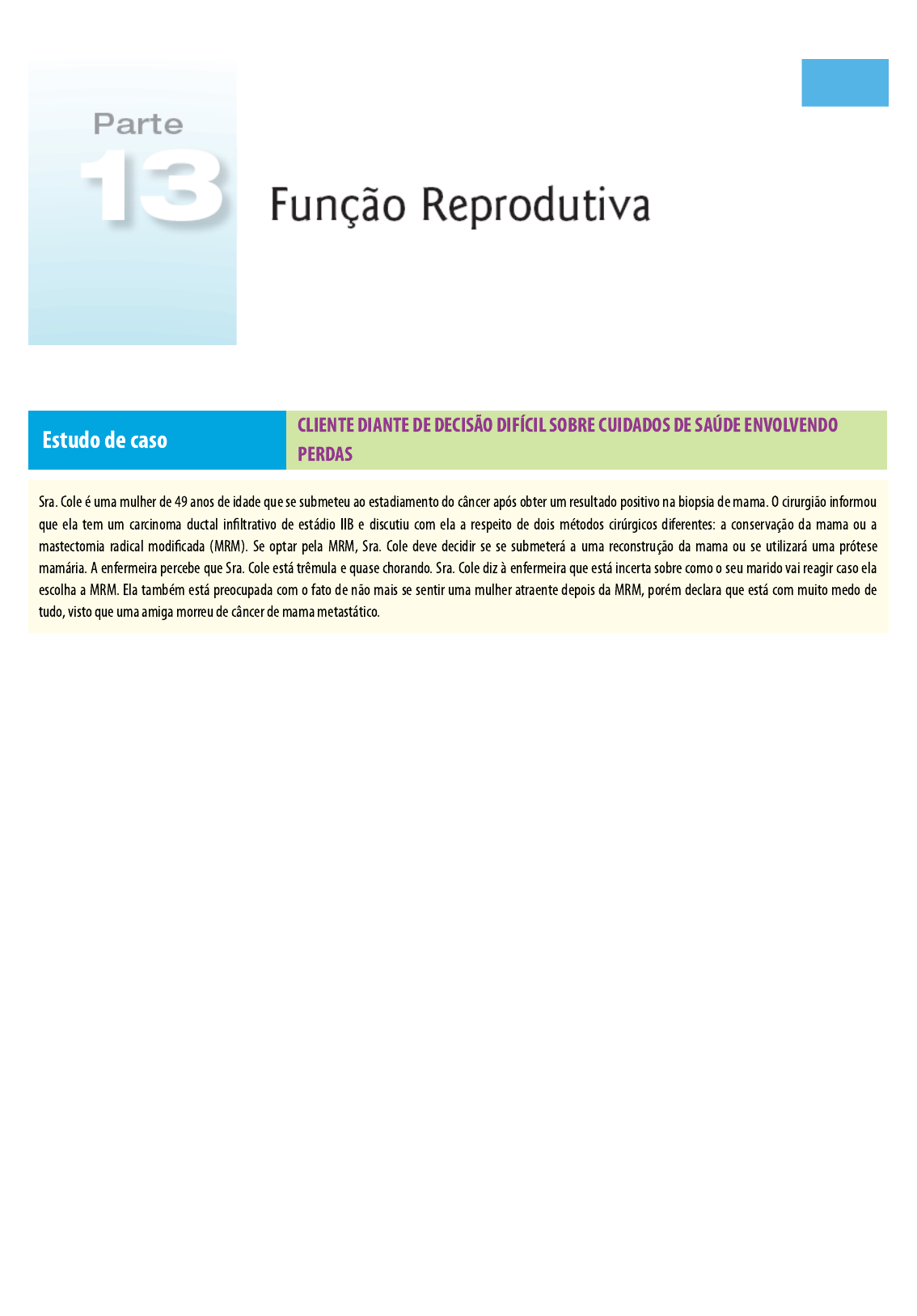 Estudo de caso CLIENTE DIANTE DE DECISÃO DIFÍCIL SOBRE CUIDADOS DE SAÚDE ENVOLVENDO PERDAS Sra. Cole é uma mulher de 49 anos de idade que se submeteu ao estadiamento do câncer após obter um resultado positivo na biopsia de mama. O cirurgião informou que ela tem um carcinoma ductal in〼‾ltrativo de estádio IIB e discutiu com ela a respeito de dois métodos cirúrgicos diferentes: a conservação da mama ou a mastectomia radical modi〼‾cada (MRM). Se optar pela MRM, Sra. Cole deve decidir se se submeterá a uma reconstrução da mama ou se utilizará uma prótese mamária. A enfermeira percebe que Sra. Cole está trêmula e quase chorando. Sra. Cole diz à enfermeira que está incerta sobre como o seu marido vai reagir caso ela escolha a MRM. Ela também está preocupada com o fato de não mais se sentir uma mulher atraente depois da MRM, porém declara que está com muito medo de tudo, visto que uma amiga morreu de câncer de mama metastático. • • • • • • Foco de competência QSEN | Cuidado centrado na cliente As complexidades inerentes ao sistema de saúde desafiam a enfermeira a demonstrar a integração de competências centrais interdisciplinares específicas. Essas competências visam garantir a prestação de cuidados de qualidade e seguros à cliente (Institute of Medicine, 2003). Os conceitos da Orientação de Qualidade e Segurança para Enfermeiras (QSEN, 2012) são uma referência para o Conhecimento, as habilidades e as atitudes (CHAs) necessários à enfermeira, para que demonstre competência nas suas áreas principais: o cuidado centrado na cliente; o trabalho colaborativo em equipe interdisciplinar e interdependência; a prática baseada em evidência; a melhora da qualidade, a segurança; e a informática. Definição de cuidado centrado na cliente: Reconhecer a cliente ou seu representante como fonte de controle e parceiro de pleno direito no fornecimento de cuidados compassivos e coordenados, com base no respeito a preferências, valores e necessidades da cliente. COMPETÉ;NCIAS ESSENCIAIS APLICAÇÃO E REFLEXÃO Conhecimento Integrar o entendimento das múltiplas dimensões do cuidado centrado na cliente: Preferências, valores da cliente/da família/comunidade Coordenação e integração dos cuidados Informações, comunicação e orientação Conforto físico e apoio emocional Participação da família e dos amigos Transição e continuidade Descreva os fatores que têm impacto na decisão de Sra. Cole sobre a abordagem cirúrgica que ela vai escolher, incluindo a percepção dela sobre as preferências do marido, a percepção de sua feminilidade e a experiência de uma amiga que faleceu de câncer de mama metastático. Identi〼‾que os fatores que devem ser incorporados em seu cuidado, de modo que ela seja capacitada a tomar a melhor decisão para ela. Habilidades Comunicar os valores, as preferências e as necessidades expressas da cliente a outros membros da equipe de saúde. Discuta como você defenderia Sra. Cole, de modo que ela possa receber o melhor cuidado para ela. Como você coordenaria seu cuidado com outros pro〼‾ssionais da equipe de saúde, de modo que isso re〰㰊ita os desejos dela? Atitudes Valorizar a percepção de situações de cuidados da saúde “pelos olhos da cliente”. Respeitar e incentivar expressão individual dos valores, preferências e necessidades expressas da cliente. Re〰㰊ita sobre um momento do passado em que teve medo de perder algo importante para você. Como o medo afetou a sua tomada de decisão? Como você demonstraria empatia no caso de Sra. Cole, que está lhe revelando suas preocupações sobre ter de fazer uma escolha que a força a perder algo de sua identidade feminina ou coloca potencialmente sua vida em risco? Como isso pode ter impacto na tomada de decisão de Sra. Cole? Pense como você analisaria suas próprias vantagens e desvantagens, e identi〼‾que o que você pensa sobre a decisão que tomaria se estivesse em uma situação semelhante a essa cliente. Que decisões diferentes você e outras pessoas tomariam, tendo em vista as mesmas circunstâncias? Existe alguma decisão “certa” ou “errada”? Re〰㰊ita como as preferências e os valores individuais afetam as decisões tomadas sobre os cuidados de saúde. Você pode respeitar as decisões de outras pessoas que diferem das decisões que você tomaria em uma situação semelhante? Por que é importante que a enfermeira demonstre respeito diante da tomada de decisão autônoma das clientes? Cronenwett L, Sherwood G, Barnsteiner J et al. (2007) Quality and safety education for nurses. Nursing Outlook, 55(3), 122131. Institute of Medicine (2003). Health professions education: A bridge to quality. Washington, DC: National Academies Press. QSEN Institute. (2012). Competencies: Prelicensure KSAs. Disponível em: qsen.org/competencies/prelicensureksas 1 2 3 4 5 6 7 8 Objetivos do aprendizado Após ler este capítulo, você será capaz de: Descrever a anatomia e a 〼‾siologia do sistema genital feminino. Descrever as abordagens para a avaliação efetiva dos processos 〼‾siológicos femininos. Identi〼‾car os exames complementares e testes utilizados para determinar a presença de alterações na função reprodutiva feminina e descrever o papel da enfermeira antes, no decorrer e depois desses exames e procedimentos. Identi〼‾car os processos 〼‾siológicos femininos comuns e as implicações de enfermagem relacionadas. Descrever os métodos de contracepção e suas implicações para os cuidados e a orientação em saúde. Descrever as causas e o manejo da infertilidade. Usar o processo de enfermagem para planejar o cuidado à cliente com gravidez ectópica. Desenvolver um plano de orientação para mulheres que estão se aproximando da menopausa ou que a concluíram. Glossário ablação endometrial: procedimento realizado por meio de um histeroscópio, em que o revestimento do útero é cauterizado ou 