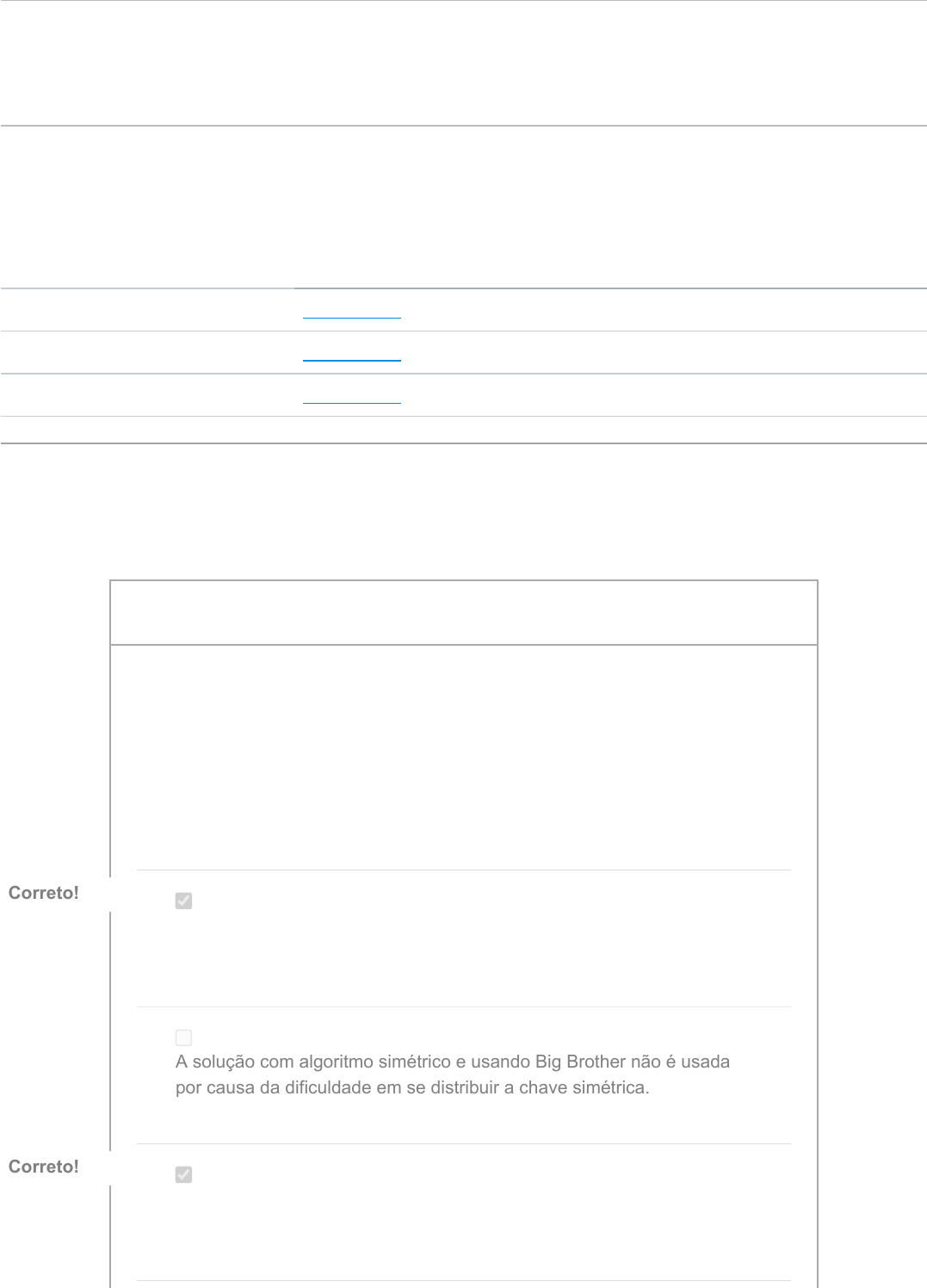 QUIZ 9 Entrega 20 out em 20:40 Pontos 2 Perguntas 2 Disponível 20 out em 20:20 - 20 out em 20:40 20 minutos Limite de tempo 8 Minutos Tentativas permitidas 2 Histórico de tentativas Tentativa Tempo Pontuação MANTIDO Tentativa 2 3 minutos 2 de 2 MAIS RECENTE Tentativa 2 3 minutos 2 de 2 Tentativa 1 3 minutos 0 de 2 Pontuação desta tentativa: 2 de 2 Enviado 20 out em 20:38 Esta tentativa levou 3 minutos. 1 / 1 ptsPergunta 1 Estudamos três soluções de Assinatura Digital, apesar de todas as três funcionarem, cada uma apresenta uma particularidade. Assinale UMA ou MAIS alternativas VERDADEIRAS em relação a particularidades apresentadas pleo serviço de Assinatura Digital.. O uso puro de algoritmos simétricos direto entre Alice e Bob não é uma solução indicada pois fere requisitos definidos no serviço. Correto!Correto! A solução com algoritmo simétrico e usando Big Brother não é usada por causa da dificuldade em se distribuir a chave simétrica. Apesar de funcionar, o uso exclusivo de algortimos simétricos é uma solução lenta. Correto!Correto! https://pucminas.instructure.com/courses/69702/quizzes/223819/history?version=2 https://pucminas.instructure.com/courses/69702/quizzes/223819/history?version=2 https://pucminas.instructure.com/courses/69702/quizzes/223819/history?version=1 A solução que apresenta o melhor desempenho conjuga o uso de sumário de mensagens mais algoritmo assimétrico. Correto!Correto! 1 / 1 ptsPergunta 2 Um Firewall pode ser definido como uma solução que agrega hardware e software para realizar a proteção de um perímetro de rede. Um tipo de Firewall é o filtro de pacotes sem estado, em relação a este tipo de firewall analise a afirmativa abaixo e indique se ela é verdadeira ou falsa. Digamos que dentro de sua rede tenha um servidor WEB que no momento só possui conexões vindas de dentro da sua rede local e chega um pacote no Firewall do tipo ACK da Internet para este Servidor, o Firewall vai bloquear a entrega deste pacote. Verdadeiro Falso Correto!Correto! O Firewall filtro de pacotes sem estado, não avalia a pertinência do pacote dentro da sessão, então mesmo não tendo ocorrido uma conexão antes, o firewall vai deixar passar a confirmação (ACK). Pontuação do teste: 2 de 2