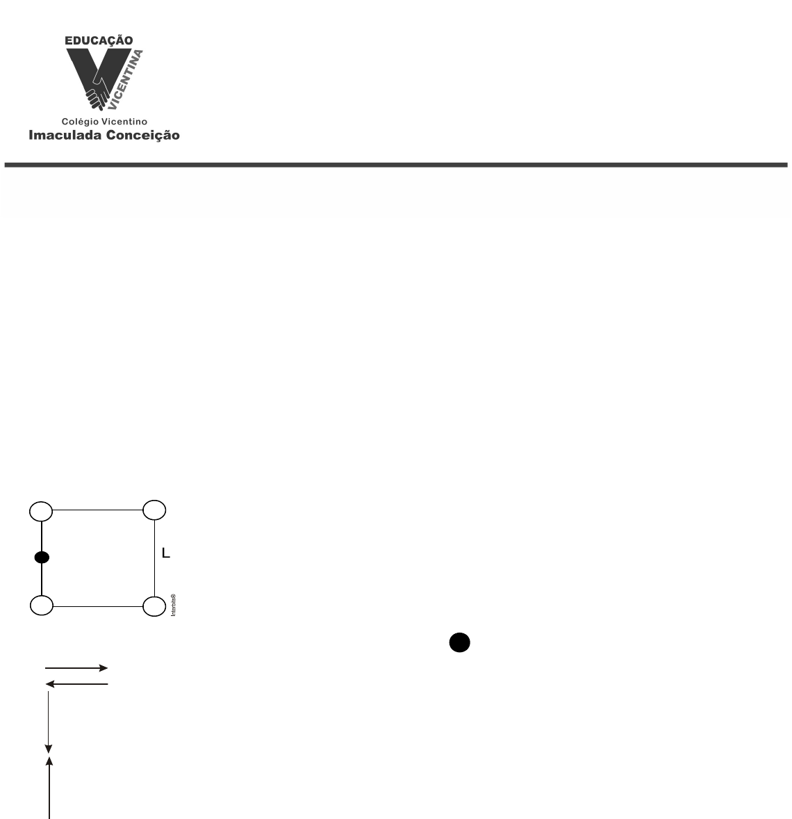 ( Aluno( a):__________________________________________________________nº_____ Data: Turma: 2 º Trimestre: 1º Profes sor( a): Fred Disciplina: Física Nota:_______ ) ( ATIVIDADE DE FÍSICA FFFDF fff FFFFFFFFFFFFFFFFF FFFFFfffffFFFFFDF MATEMÁTICA ) LISTA EXERCÍCIOS : 1. Em um campo elétrico uniforme, uma partícula carregada positivamente com está sujeita a uma forca elétrica de modulo 10 N. Reduzindo pela metade a carga elétrica dessa partícula, a força, em newtons, que atuará sobre ela será igual a a) 2,5. b) 5,0. c) 10. d) 15. 2. Quatro cargas puntiformes de mesmo valor +q são colocadas nos vértices de um quadrado de lado L. O vetor campo elétrico resultante no centro do lado assinalado com é a) b) c) d) 3. (Puc-rio 2009) Dois objetos metálicos esféricos idênticos, contendo cargas elétricas de 1 C e de 5 C, são colocados em contato e depois afastados a uma distância de 3 m. Considerando a Constante de Coulomb k = 9 × 109 N m2/C2, podemos dizer que a força que atua entre as cargas após o contato é: a) atrativa e tem módulo 3 ×109 N. b) atrativa e tem módulo 9 × 109 N. c) repulsiva e tem módulo 3 × 109 N. d) repulsiva e tem módulo 9 × 109 N. e) zero. 4. (Fatec 2007) Analise as afirmações a seguir: I. Todo objeto que tem grande quantidade de elétrons está eletrizado negativamente. II. Eletrizando-se por atrito dois objetos neutros obtêm-se, ao final deste processo de eletrização, dois objetos eletrizados com carga de mesmo sinal. III. Encostando-se um objeto A, eletrizado negativamente, em um pequeno objeto B, neutro, após algum tempo o objeto A ficará neutro. Deve-se concluir, da análise dessas afirmações, que a) apenas I é correta. b) apenas II é correta. c) apenas II e III são corretas. d) I, II e III são corretas. e) não há nenhuma correta. 5. (Pucmg 2006) Em certos dias do ano, frequentemente tomamos pequenos "choques" ao fecharmos a porta do carro ou ao cumprimentarmos um colega com um simples aperto de mãos. Em quais circunstâncias é mais provável que ocorram essas descargas elétricas? a) Em dias muito quentes e úmidos, porque o ar se torna condutor. b) Em dias secos, pois o ar seco é bom isolante e os corpos se eletrizam mais facilmente. c) Em dias frios e chuvosos, pois a água da chuva é ótima condutora de eletricidade. d) A umidade do ar não influi nos fenômenos da eletrostática, logo essas descargas poderão ocorrer a qualquer momento. 6. (Pucpr ) Quatro esferas condutoras idênticas, 1, 2, 3 e 4, estão isoladas umas das outras. Inicialmente, 1 está com carga Q e as outras estão neutras. Em seguida, faz-se o contato entre as esferas 1 e 2; após, realiza-se o contato entre as esferas 1 e 3 e finalmente entre 1 e 4. Após cada contato, as esferas são separadas. Pode-se afirmar que as cargas elétricas das esferas após os contatos são: a) q1 = Q/8, q2 = Q/2, q3 = Q/4, q4 = Q/8 b) q1 = Q/8, q2 = Q/6, q3 = Q/4, q4 = Q/2 c) q1 = Q/2, q2 = Q/4, q3 = Q/6, q4 = Q/8 d) q1 = Q/2, q2 = Q/4, q3 = Q/2, q4 = Q/2 e) q1 = Q/8, q2 = Q/8, q3 = Q/8, q4 = Q/8 7. (Puc-rio) Inicialmente, a força elétrica atuando entre dois corpos A e B, separados por uma distância d, é repulsiva e vale F. Se retirarmos metade da carga do corpo A, qual deve ser a nova separação entre os corpos para que a força entre eles permaneça igual a F? a) d. b) d/2. c) d/ . d) d/ . e) d/3. 8. (Pucrs 2005) Considere a figura a seguir, que representa duas cargas elétricas de mesma intensidade e sinais opostos colocadas nos vértices inferiores do triângulo equilátero. O vetor que representa o campo eletrico resultante no vertice superior do triangulo e a) 1 b) 2 c) 3 d) 4 e) 5 9. (Puc-rio 2004) Uma carga positiva encontra-se numa região do espaço onde há um campo elétrico dirigido verticalmente para cima. Podemos afirmar que a força elétrica sobre ela é: a) para cima. b) para baixo. c) horizontal para a direita. d) horizontal para a esquerda. e) nula. 10 . (Ufmg 2003) Aproximando-se um pente de um pedacinho de papel, observa-se que não há força entre eles. No entanto, ao se passar o pente no cabelo, e em seguida, aproximá-lo do pedacinho de papel, este será atraído pelo pente. Sejam F(pente) e F(papel) os módulos das forças eletrostáticas que atuam, respectivamente, sobre o pente e sobre o papel. Com base nessas informações, é CORRETO afirmar que a) o pente e o papel têm cargas de sinais opostos e F(pente)=F(papel). b) o pente e o papel têm cargas de sinais opostos e F(pente)>F(papel). c) o pente está eletricamente carregado, o papel está eletricamente neutro e F(pente)=F(papel). d) o pente está eletricamente carregado, o papel está eletricamente neutro e F(pente)>F(papel). 2 3 ur E 20 C μ