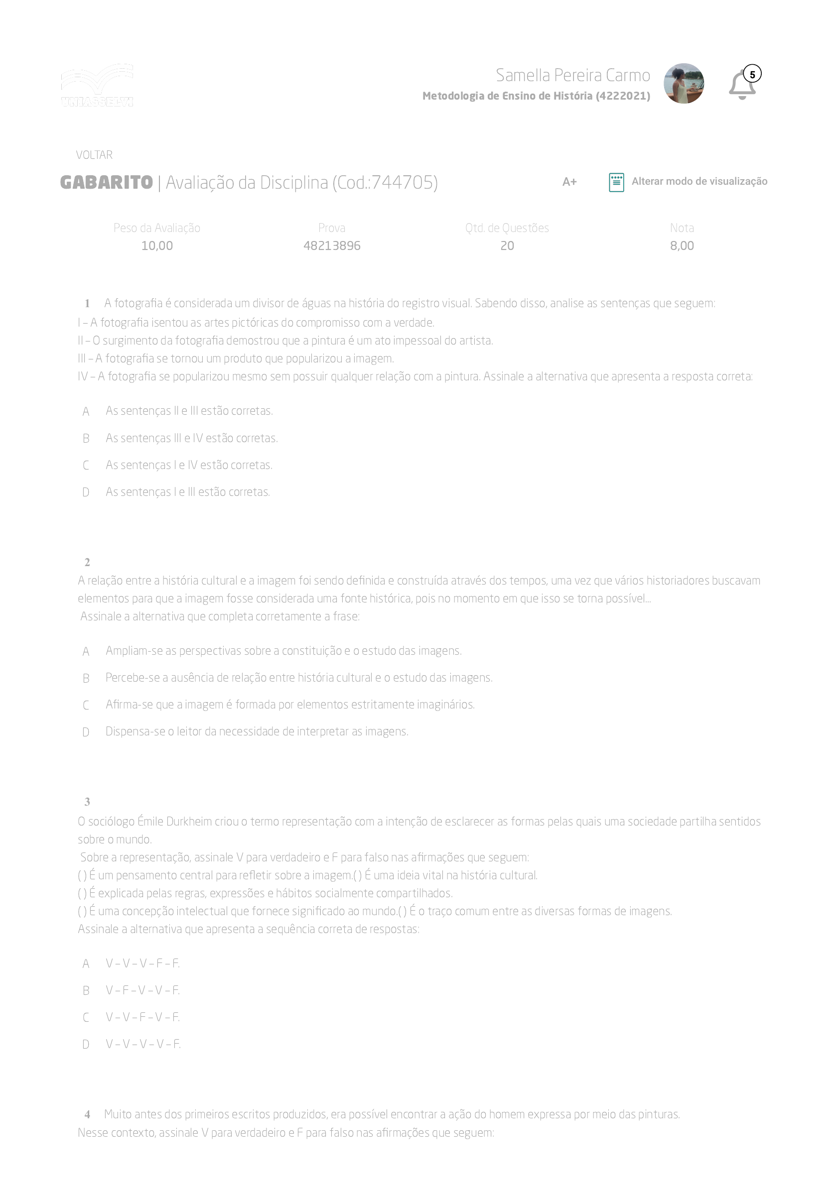 10/05/2022 09:48 AVA https://ava2.uniasselvi.com.br/subject/grades-and-tests/answer-book/eyJ0ZXN0Ijp7InRlc3RDb2RlIjoiNzQ0NzA1IiwiZGVzY3JpcHRpb24iOiJBdmFsaWHDp8OjbyBkYSBEaXNjaXBsaW5hIiwicGFyYW1ldGVyIjpudWxsL… 1/6 GABARITO | Avaliação da Disciplina (Cod.:744705) Peso da Avaliação 10,00 Prova 48213896 Qtd. de Questões 20 Nota 8,00 A fotografia é considerada um divisor de águas na história do registro visual. Sabendo disso, analise as sentenças que seguem: I – A fotografia isentou as artes pictóricas do compromisso com a verdade. II – O surgimento da fotografia demostrou que a pintura é um ato impessoal do artista. III – A fotografia se tornou um produto que popularizou a imagem. IV – A fotografia se popularizou mesmo sem possuir qualquer relação com a pintura. Assinale a alternativa que apresenta a resposta correta: A As sentenças II e III estão corretas. B As sentenças III e IV estão corretas. C As sentenças I e IV estão corretas. D As sentenças I e III estão corretas. A relação entre a história cultural e a imagem foi sendo definida e construída através dos tempos, uma vez que vários historiadores buscavam elementos para que a imagem fosse considerada uma fonte histórica, pois no momento em que isso se torna possível... Assinale a alternativa que completa corretamente a frase: A Ampliam-se as perspectivas sobre a constituição e o estudo das imagens. B Percebe-se a ausência de relação entre história cultural e o estudo das imagens. C Afirma-se que a imagem é formada por elementos estritamente imaginários. D Dispensa-se o leitor da necessidade de interpretar as imagens. O sociólogo Émile Durkheim criou o termo representação com a intenção de esclarecer as formas pelas quais uma sociedade partilha sentidos sobre o mundo. Sobre a representação, assinale V para verdadeiro e F para falso nas afirmações que seguem: ( ) É um pensamento central para refletir sobre a imagem.( ) É uma ideia vital na história cultural. ( ) É explicada pelas regras, expressões e hábitos socialmente compartilhados. ( ) É uma concepção intelectual que fornece significado ao mundo.( ) É o traço comum entre as diversas formas de imagens. Assinale a alternativa que apresenta a sequência correta de respostas: A V – V – V – F – F. B V – F – V – V – F. C V – V – F – V – F. D V – V – V – V – F. Muito antes dos primeiros escritos produzidos, era possível encontrar a ação do homem expressa por meio das pinturas. Nesse contexto, assinale V para verdadeiro e F para falso nas afirmações que seguem: VOLTAR A+ Alterar modo de visualização 1 2 3 4 Samella Pereira Carmo Metodologia de Ensino de História (4222021) 5 10/05/2022 09:48 AVA https://ava2.uniasselvi.com.br/subject/grades-and-tests/answer-book/eyJ0ZXN0Ijp7InRlc3RDb2RlIjoiNzQ0NzA1IiwiZGVzY3JpcHRpb24iOiJBdmFsaWHDp8OjbyBkYSBEaXNjaXBsaW5hIiwicGFyYW1ldGVyIjpudWxsL… 2/6 ( ) As evidências a respeito da existência do homem na terra têm nas imagens os indícios mais primitivos. ( ) As ilustrações humanas primitivas auxiliam no entendimento do modo de vida das sociedades que as criaram. ( ) As sociedades primitivas encontraram na criação da escrita uma forma de expressar seu modo de vida, o que não acontecia com o uso das imagens. ( ) A região onde foram encontradas as primeiras pinturas feitas pelas sociedades primitivas se localiza no sul da África. Assinale a alternativa que apresenta a sequência correta de respostas: A V – V – F – V. B V – V – V – V. C V – V – V – F. D V – F – V – V. A imagem é uma espécie de reprodução ou imitação de uma forma, pessoa ou objeto, presente na origem da escrita, das religiões, da arte e do culto aos mortos. Sobre as teorias de Platão e Aristóteles acerca da imagem representar um núcleo de reflexão filosófica, assinale V para verdadeiro e F para falso nas afirmações que seguem: ( ) A imagem fascina as porções mais frágeis do espírito.( ) A imagem válida é a imagem própria. ( ) A imagem natural pode se tornar um instrumento do raciocínio. Assinale a alternativa que apresenta a sequência correta de respostas: A V – V – F. B V – V – V. C V – F – V. D V – F – F. O século XIX foi o período em que a história passou a ser tratada como uma disciplina científica. Nesse contexto, assinale V para verdadeiro e F para falso nas afirmações que seguem: ( ) Os historiadores desse período consideravam como fontes históricas os registros escritos formais. ( ) Os historiadores desse período acreditavam que os documentos escritos oficiais eram a única fonte que merecia crédito. ( ) Os historiadores desse período confiavam em todos os tipos de fontes históricas. Assinale a alternativa que apresenta a sequência correta de respostas: A V – V – V. B V – V – F. C V – F – V. D V – F – F. Saber formular perguntas pode parecer simples, mas é uma habilidade complexa que exige discernimento e flexibilidade, conforme o conteúdo, a forma e a função da pergunta. Nesse contexto, quanto às formas de perguntas, associe os itens que seguem: I – Abertas.II – Fechadas.III – Difusas.IV – Dirigidas. ( ) São caracterizadas por garantirem a fonte de informação desejada. ( ) São caracterizadas por incentivarem indivíduos com habilidades verbais. ( ) São caracterizadas por produzirem maior quantidade de informações.( ) São caracterizadas por suscitarem respostas objetivas e precisas. Assinale a alternativa que apresenta a sequência correta de respostas: A II – III – I – IV. B IV – III – II – I. C III – II – IV – I. D IV – III – I – II. 5 6 7 Samella Pereira Carmo Metodologia de Ensino de História (4222021) 5 10/05/2022 09:48 AVA https://ava2.uniasselvi.com.br/subject/grades-and-tests/answer-book/eyJ0ZXN0Ijp7InRlc3RDb2RlIjoiNzQ0NzA1IiwiZGVzY3JpcHRpb24iOiJBdmFsaWHDp8OjbyBkYSBEaXNjaXBsaW5hIiwicGFyYW1ldGVyIjpudWxsL… 3/6 O positivismo é uma