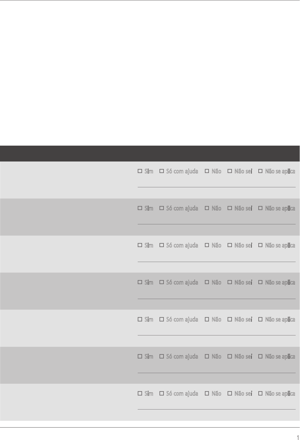 1 Escala de Funcionamento Adaptativo para Deficiência Intelectual (EFA-DI) Abaixo você encontrará frases que descrevem comportamentos e habilidades esperadas de crianças e ado lescentes. Responda pensando nos comportamentos de seu filho ou filha. Se você tiver mais de um filho, fique atento para pensar somente em um deles do início até o fim do questionário. Pedimos que você classifique cada afirmação, considerando as seguintes respostas: Sim para indicar que seu(sua) filho(a) faz o que está escrito sem dificuldade e sem ajuda. Só com ajuda para indicar que seu(sua) filho(a) faz o que está escrito, porém com ajuda. Não para indicar que seu(sua) filho(a) não faz o que está escrito, mesmo que com ajuda. Não sei marque essa opção quando não souber responder a afirmação. Não se aplica marque essa opção quando a afirmação não se aplica. Há um espaço abaixo de cada afirmação para comentários, caso você ache necessário. Domínio Social 1. Entende o que as pessoas falam com ele (ex.: instruções, orientações ou pedidos). � Sim � Só com ajuda � Não � Não sei � Não se aplica 2. Entende quando alguém se comunica com gestos (ex.: entende quando alguém faz um gesto de apontar ou de “certo”). � Sim � Só com ajuda � Não � Não sei � Não se aplica 3. Entende frases/expressões com sentido diferente do que parece (ex.: guardei você dentro do coração). � Sim � Só com ajuda � Não � Não sei � Não se aplica 4. Usa gestos para comunicar suas neces sidades e desejos (ex.: balança o dedo para falar não; aponta para algo que quer)”. � Sim � Só com ajuda � Não � Não sei � Não se aplica 5. Quando fala, é compreendido por pessoas que não são da família. � Sim � Só com ajuda � Não � Não sei � Não se aplica 6. Oferece ajuda para as pessoas (ex.: carregar as compras; em alguma tarefa da casa). � Sim � Só com ajuda � Não � Não sei � Não se aplica 7. Faz favores simples quando pedido (ex.: pegar um copo de água). � Sim � Só com ajuda � Não � Não sei � Não se aplica mirandarspsi@gmail.com Free hand mirandarspsi@gmail.com Free hand mirandarspsi@gmail.com Free hand mirandarspsi@gmail.com Free hand mirandarspsi@gmail.com Free hand mirandarspsi@gmail.com Free hand mirandarspsi@gmail.com Free hand mirandarspsi@gmail.com Free hand mirandarspsi@gmail.com Free hand mirandarspsi@gmail.com Free hand mirandarspsi@gmail.com Free hand mirandarspsi@gmail.com Free hand 2 Domínio Social (continuação) 8. Participa de atividades de interesse com crianças/adolescentes (ex.: brincar ou passear). � Sim � Só com ajuda � Não � Não sei � Não se aplica 9. Convida pessoas de sua idade para fazer atividades de que gosta. � Sim � Só com ajuda � Não � Não sei � Não se aplica 10. Tem melhor(es) amigo(s). � Sim � - � Não � Não sei � Não se aplica 11. Sabe se comportar adequadamente em situações sociais (ex.: cumprimentar; dizer obrigado; agradecer um presente). � Sim � Só com ajuda � Não � Não sei � Não se aplica 12. Age de acordo com o esperado para a idade em momentos de interação (ex.: espera por sua vez em jogos ou brincadeiras; em uma conversa sabe o momento de falar e ouvir). � Sim � Só com ajuda � Não � Não sei � Não se aplica 13. Normalmente segue as regras combinadas na família. � Sim � Só com ajuda � Não � Não sei � Não se aplica 14. Consegue perceber más intenções das pessoas. � Sim � Só com ajuda � Não � Não sei � Não se aplica 15. Interessase pelo que os outros pensam (ex.: pergunta o que o outro está pensando; pede a opinião de alguém). � Sim � Só com ajuda � Não � Não sei � Não se aplica 16. Consegue se controlar quando contrariado (não grita ou bate). � Sim � Só com ajuda � Não � Não sei � Não se aplica Domínio Prático 1. Consegue comprar algo sozinho (faz o pedido, dá o dinheiro e espera pelo objeto e troco). � Sim � Só com ajuda � Não � Não sei � Não se aplica 2. Faz pequenas tarefas em casa, próprias para sua idade, quando pedido (ex.: arrumar a cama; ajuda a lavar ou secar a louça). � Sim � Só com ajuda � Não � Não sei � Não se aplica mirandarspsi@gmail.com Free hand mirandarspsi@gmail.com Free hand mirandarspsi@gmail.com Free hand mirandarspsi@gmail.com Free hand mirandarspsi@gmail.com Free hand mirandarspsi@gmail.com Free hand mirandarspsi@gmail.com Free hand mirandarspsi@gmail.com Free hand mirandarspsi@gmail.com Free hand mirandarspsi@gmail.com Free hand mirandarspsi@gmail.com Free hand mirandarspsi@gmail.com Free hand 3 Domínio Prático (continuação) 3. Guarda as próprias roupas ou objetos no lugar certo, quando pedido. � Sim � Só com ajuda � Não � Não sei � Não se aplica 4. Sabe usar aparelhos elétricos de forma segura (ex.: TV; carregador do celular). � Sim � Só com ajuda � Não � Não sei � Não se aplica 5. Sabe preparar alimentos (ex.: montar um sanduíche; misturar os ingredientes de uma receita). � Sim � Só com ajuda � Não � Não sei � Não se aplica 6. Usa faca para passar manteiga ou geleia no pão. � Sim � Só com ajuda � Não � Não sei � Não se aplica 7. Serve a própria comida durante as refeições (ou seja, tira a comida da panela com colher e coloca no prato). � Sim � Só com ajuda � Não � Não sei � Não se aplica 8. Come com garfo e faca (ou seja, usa a faca para empurrar a comida para o garfo). � Sim � Só com ajuda � Não � Não sei � Não se aplica 9. Corta carnes ou outros alimentos em pedaços pequenos. � Sim � Só com ajuda � Não � Não sei � Não se aplica 10. Coloca o lixo no cesto de lixo. � Sim � Só com ajuda � Não � Não sei � Não se aplica 11. Sabe tomar banho. � Sim � Só com ajuda � Não � Não sei � Não se aplica 12. Sabe lavar o próprio cabelo. � Sim � Só co
