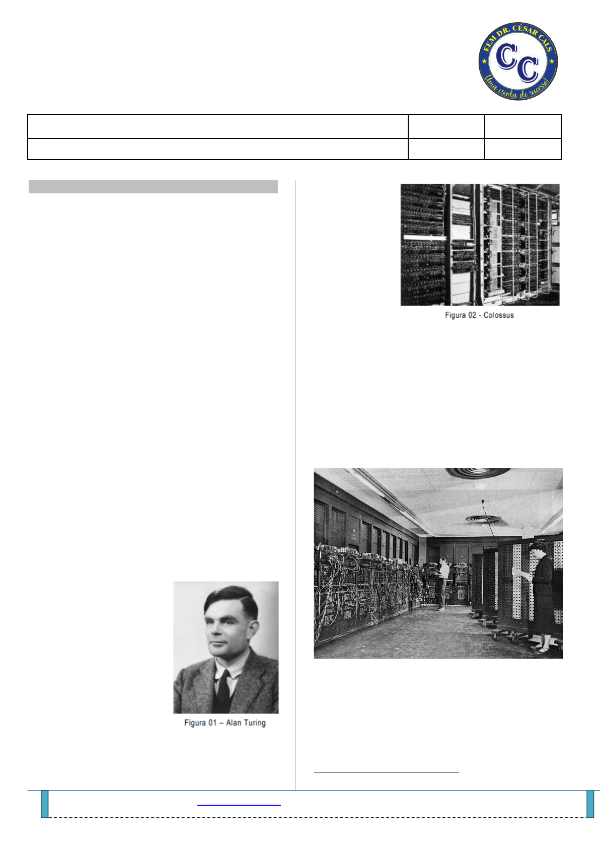E.E.M. DR. CÉSAR CALS TD DE ___________ ÁREA: ______________ PROFESSOR (A):____________________________________________________________ SÉRIE: 3º ANO TURNO: TARDE ALUNO(A): Nº: ________ TURMA:_____ ____________________________________________________________________________ HISTÓRIA E EVOLUÇÃO DO COMPUTADOR Nesse capitulo iremos estudar um pouco da história e da evolução do computador. Veremos que os computadores passaram por grandes modificações tornando eles cada vez mais rápidos e úteis. Hoje o computador está em quase tudo, desde um simples celular a computadores potentes. Tudo começou há 2.000 a.c., quando o homem necessitava de recursos para efetuar cálculos, que estavam cada vez mais complicados. Os chineses, então, inventaram o ábaco, uma máquina simples e rudimentar de processamento de dados. O ábaco serviu de inspiração para a evolução do computador. Em 1822, foi desenvolvido por um cientista inglês chamado Charles Babbage uma máquina diferencial que permitia cálculos como funções trigonométricas e logaritmos, utilizando os cartões de Jacquard. Charles Babbage, considerado por alguns o pai do computador atual, construiu em 1830 o primeiro computador do mundo, cem anos antes de se tornar realidade. O projeto de Babbage apresentava desvantagens: uma delas era o fato de que o seu computador deveria ser mecânico, e a outra era a precariedade da engenharia da época. Apesar desses problemas, Charles Babbage construiu um aparelho que impressionou o governo inglês. A máquina era enorme, demonstrava inúmeros problemas e simplesmente não funcionava. Grande parte da arquitetura lógica e da estrutura dos computadores atuais provém dos projetos de Charles Babbage, que é lembrado como um dos fundadores da computação moderna. Só por volta de 1936, às ideias de Babbage foram comprovadas, quando um jovem matemático chamado Alan Turing, publicou um artigo, pouco conhecido, On computable numbers. O nome de Turing é quase desconhecido para o público, mas sua contribuição foi fundamental para o desenvolvimento de ideias que ocorreriam antes do computador propriamente dito tornar-se realidade. Os cientistas admitiam que a matemática não era uma arte misteriosa, e sim uma ciência inteiramente relacionada com regras lógicas. Se uma máquina recebesse essas regras e o problema a ser solucionado, elaseria capaz de resolvê-lo. No entanto, os esforços dos mais competentes matemáticos foram inúteis para desenvolver tal máquina.Turing decidiu examinar o impasse de outra maneira. Verificou os tipos de problemas que uma máquina poderia resolver seguindo regras lógicas e tentou fazer uma lista de todos eles. Turing liderou uma equipe de pesquisa na Inglaterra e desenvolveu a mais secreta invenção da Segunda Guerra Mundial, o Colossus, o primeiro computador eletromecânico do mundo, que pode decifrar os códigos alemães de mensagens enigmáticas, durante a guerra. Depois da guerra, Turing colaborou no projeto do primeiro computador dos Estados Unidos, o ENIAC (Eletronic Numerical Integrator and Calculator), desenvolvido na Universidade da Pensilvânia em 1946. O desenvolvimento do computador continuou, mas só com a invenção do transistor de silício, em 1947, tornou-se possível aumentar a velocidade das operações na computação. 1 Em meados dos anos 1960, nasceu o "Circuito Integrado", com isso a computação deu um grande passo à frente. Há evolução dos computadores até meados dos anos 60 nas figura abaixo 1 ENIAC Avenida Domingos Olímpio, 1800 – Farias Brito – CEP 60040-081. E-mail: ccals@escola.ce.gov.br / Fones:3281-0320 / 3214-4048 / 3101-2379 mailto:ccals@escola.ce.gov.br A indústria dos computadores pessoais (PC) teve seu início em 1971 com a fabricação do primeiro microprocessador, o Intel 4004. Porém a indústria decolou somente em 1975 com Altair 8800, da MITS.este kit inicial era bastante limitado. O kit tinha como base o microprocessador 8080 da Intel e possuía apenas 250 bytes de memória. A união de Paul Allen, um jovem programador, com um calouro da Universidade de Harvard conhecido como Bill Gates originou uma versão do Basic para o Altair. Mais tarde surgiria a Microsoft. No ano de 1977 ocorreu uma explosão de interesse pelos computadores pessoais e a introdução de uma sucessão de máquinas: Apple II, de Steve Wozniak e Steve Jobs. O Apple II desenvolveu-se rapidamente com uma econômica unidade de disco flexível e a primeira planilha eletrônica, o VisiCalc. O ramo de software começou a crescer com a rápida aparição de uma variedade de linguagens de programação. Em agosto de 1980, engenheiros da IBM fizeram a demonstração de um protótipo do computador pessoal chamado Acorn, com um microprocessador 8088, uma versão do chip com barramento de 8 bits e estrutura interna de 16 bits. A Microsoft assinou contrato com a IBM para o fornecimento do Basic, mais tarde também um sistema operacional chamado PC-DOS. Então, em 12 de agosto de 1981 a IBM apresentou o IBM Personal Computer. Em meados de 1983, a guerra da compatibilidade com o DOS foi sendo resolvida e a partir daí o padrão PC realmente começou a se estabelecer. Em 1982 era formada a Compaq Computer Corp. para criar um verdadeiro portátil compatível com IBM. No início de 1984 é lançado o Apple Macintosh, que oferecia mais que um prompt de DOS, ele apresentava várias janelas, menus suspensos e mouse. Finalmente em 1987 seria lançado o Windows 2.0, que melhorava a interface com o usuário. Porém, um pouco adiante o Windows seria dividido em 286 e 386, sendo que o último adicionava capacidades multitarefa, execução de aplicativos em máquinas virtuais e suporte a até 16 Mb de memória.Os softwares para Windows começavam a surgir, sendo que um processador de textos só chegaria ao final de 1989, com o lançamento do AmiPro, e a primeira versão do Word. O mundo da computação descobriu, enfim, em maio de 1990 seu padrão, o Wi