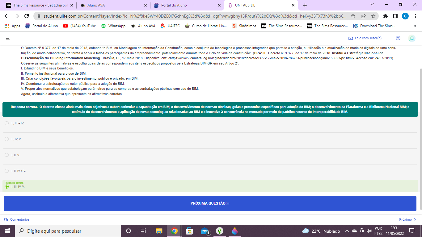 O Decreto N° 9.377, de 17 de maio de 2018, entende "o BIM, ou Modelagem da Informação da Construção, como o conjunto de tecnologias e processos integrados que permite a criação, a utilização e a atualização de modelos digitais de uma construção, de modo colaborativo, de forma a servir a todos os participantes do empreendimento, potencialmente durante todo o ciclo de vida da construção". Observe as seguintes afirmativas e escolha quais delas correspondem aos itens específicos propostos pela Estratégia BIM-BR em seu Artigo 2°. I. Difundir o BIM e seus II. Fomento institucional para o uso de BIM. III. Criar condições favoráveis para o investimento, público e privado, em BIM. IV. Coordenar a estruturação do setor para a adoção do BIM. V. Propor atos normativos que estabeleçam parâmetros para as compras e as contratações com uso do BIM. II, IV. II, III. I, II, III, IV, V. I, III, IV.