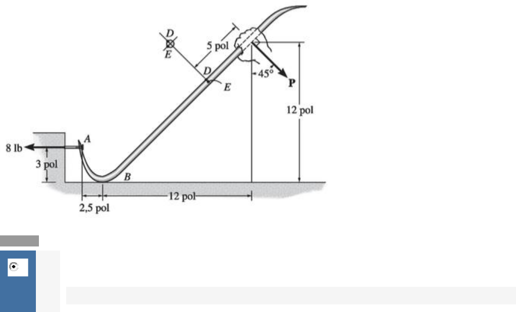 Questão 1/10 - Resistência dos Materiais O pé-de-cabra é usado para retirar o prego em A. Supondo que se aplique uma força de 8 lb, determinar as componentes de tensão nos pontos D e E. Mostrar os resultados em um elemento de volume localizado em cada um desses pontos. O pé-de-cabra tem seção transversal circular de 0,5 pol de diâmetro. Não ocorre deslizamento em B. Sabendo que 1 ksi = 1000 psi. (conteúdo Aula 6 tema 1) Nota: 10.0 A σD=576,2psi; τD=0; σE=0 e τE=9,61psiσD=576,2psi; τD=0; σE=0 e τE=9,61psi Você acertou! B σD=0; τD=576,2psi; σE=9,61psi e τE=0σD=0; τD=576,2psi; σE=9,61psi e τE=0 C σD=576,2psi; τD=0; σE=9,61psi e τE=0σD=576,2psi; τD=0; σE=9,61psi e τE=0 D σD=0; τD=576,2psi; σE=0 e τE=9,61psiσD=0; τD=576,2psi; σE=0 e τE=9,61psi Questão 2/10 - Resistência dos Materiais (conteúdo Aula 4 tema 5) Nota: 10.0 A B C D Você acertou! Questão 3/10 - Resistência dos Materiais O parafuso de aço A-36 com 8mm de diâmetro está parafusado firmemente ao bloco A. determine as forças conjugadas F que devem ser aplicadas à chave de torque, de modo que a tensão de cisalhamento máxima no parafuso seja de 18 MPa. Dado: Gaço = 75 GPa . (conteúdo Aula 4 tema 1) Nota: 10.0 A F=2,90 N B F=6,03 N Você acertou! C F=2,90 kN D F=6,03 kN Questão 4/10 - Resistência dos Materiais O suporte de aço é usado para ligar as extremidades de dois cabos. Se a força P = 2,5 kN for aplicada, determine a tensão normal máxima no suporte. O suporte tem espessura de 12 mm e largura de 18 mm. (conteúdo Aula 6 tema 1) Nota: 10.0 A 175 MPa B 192 MPa C 208MPa D 240 MPa Você acertou! Questão 5/10 - Resistência dos Materiais (conteúdo Aula 6 tema 3) Nota: 10.0 A Você acertou! B C D Questão 6/10 - Resistência dos Materiais As hélices de um navio estão acopladas a um eixo maciço de aço A-36 com 60 m de comprimento, diâmetro externo de 340 mm e interno de 260 mm. Se a potência de saída for 4,5 MW quando o eixo gira a 20 rad/s, determine a tensão de torção máxima no eixo e seu ângulo de torção. Dados Gaço = 75 GPa. (conteúdo Aula 4 temas 1 e 2) Nota: 10.0 A τmáx=44,31MPaτmáx=44,31MPa ϕ=0,2085radϕ=0,2085rad Você acertou! B τmáx=44,31MPaτmáx=44,31MPa ϕ=0,5012radϕ=0,5012rad C τmáx=75MPaτmáx=75MPa ϕ=0,5012radϕ=0,5012rad τmáx=75MPaτmáx=75MPa ϕ=0,2085radϕ=0,2085rad D τmáx=76MPaτmáx=76MPa ϕ=0,0285radϕ=0,0285rad Questão 7/10 - Resistência dos Materiais O estado de tensão em um ponto de um elemento estrutural é mostrado na figura. Determine as componentes de tensão que agem no plano inclinado AB. (conteúdo Aula 6 tema 3) Nota: 10.0 A σσx' = 34,82MPa e ττx'y' = 49,69MPa B σσx' = 49,69MPa e ττx'y' = 34,82MPa C σσx' = 49,69MPa e ττx'y' = -34,82MPa Você acertou! D σσx' = 34,82MPa e ττx'y' = -49,69MPa Questão 8/10 - Resistência dos Materiais A viga tem seção transversal retangular. Se estiver sujeita a um momento fletor M = 3500 N.m, direcionado como mostra a figura, determine a tensão de flexão máxima na viga. (conteúdo Aula 4 tema 5) Nota: 10.0 A 0,208 MPa B 1,012 MPa C 2,105 MPa D 2,903 MPa Você acertou! Questão 9/10 - Resistência dos Materiais Com base em seus conhecimentos sobre flambagem de colunas, assinale a alternativa CORRETA I) Certas cargas de compressão, se suficientemente grandes, podem provocar uma deflexão ou oscilação lateral em elementos compridos e esbeltos; II) A carga axial máxima que uma coluna pode suportar quando está na iminência de sofrer flambagem é denominada carga crítica; III) Quanto maior o comprimento da barra, maior chance ela tem de flambar. (conteúdo Aula 5 tema 3) Nota: 10.0 A As alternativas I e II estão corretas B Apenas a alternativa III está correta C As alternativas I, II e III estão corretas Você acertou! SOLUÇÃO: A solução deste exercício é dado por definição. Ver Hibbeler, Resistência dos Materiais, 7ª ed, 2010, pp. 477-478. SP – Pearson D As alternativas II e III estão corretas Questão 10/10 - Resistência dos Materiais (conteúdo da Aula 6 temas 1) Nota: 10.0 A B Você acertou! C D