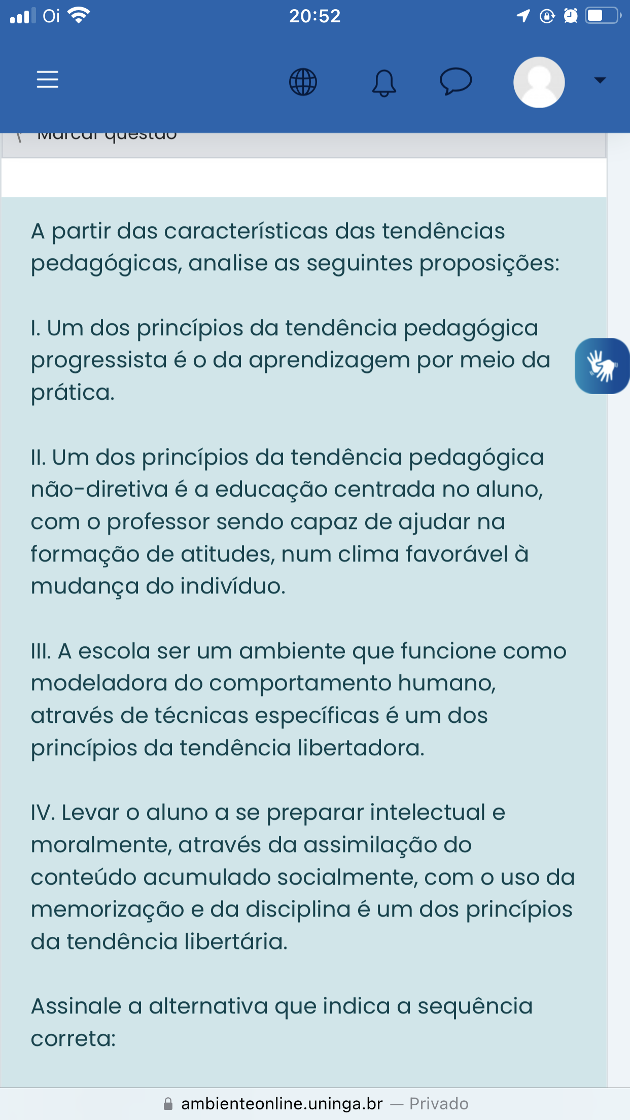 A partir das características das tendências pedagógicas, analise as seguintes proposições: Assinale a alternativa que indica a sequência correta: I. Um dos princípios da tendência pedagógica progressista é O da aprendizagem por meio da prática. II. Um dos princípios da tendência pedagógica não-diretiva é a educação centrada no aluno, com professor sendo capaz de ajudar na formação de atitudes, num clima favorável à mudança do indivíduo. III. A escola ser um ambiente que funcione como modeladora do comportamento humano, através de técnicas específicas é um dos princípios da tendência libertadora. IV. Levar aluno a se preparar intelectual e moralmente, através da assimilação do conteúdo acumulado socialmente, com O uso da memorização e da disciplina é um dos princípios da tendência libertária.