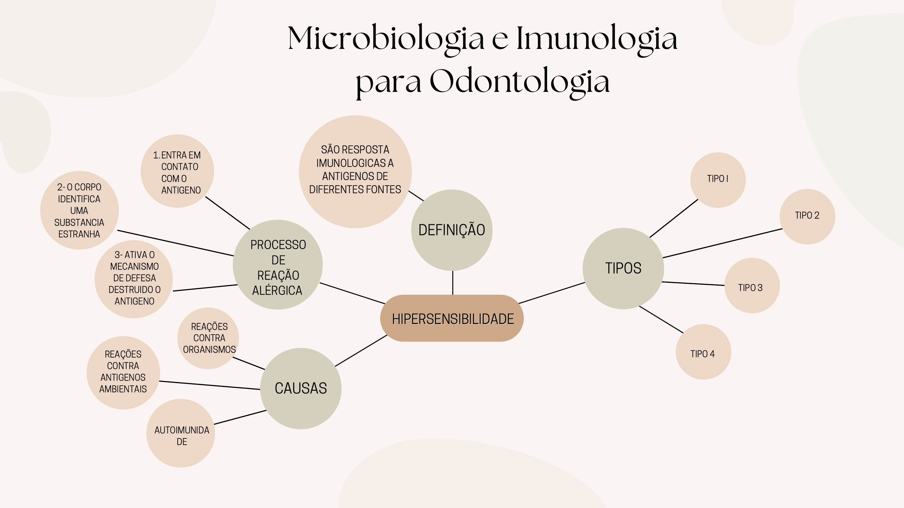 CAUSAS PROCESSO DE REAÇÃO ALÉRGICA HIPERSENSIBILIDADEHIPERSENSIBILIDADE 2- O CORPO IDENTIFICA UMA SUBSTANCIA ESTRANHA ENTRA EM CONTATO COM O ANTIGENO 1. TIPO I TIPO 2 TIPO 3 REAÇÕES CONTRA ORGANISMOS REAÇÕES CONTRA ANTIGENOS AMBIENTAIS AUTOIMUNIDA DE SÃO RESPOSTA IMUNOLOGICAS A ANTIGENOS DE DIFERENTES FONTES Microbiologia e Imunologia para Odontologia 3- ATIVA O MECANISMO DE DEFESA DESTRUIDO O ANTIGENO TIPOS DEFINIÇÃO TIPO 4