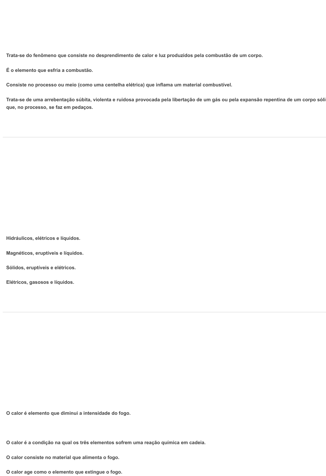 Ocultar opções de resposta Ocultar opções de resposta Ocultar opções de resposta Pergunta 1 -- /1 Assinale a alternativa que apresenta a definição correta para comburente. Trata-se do fenômeno que consiste no desprendimento de calor e luz produzidos pela combustão de um corpo. É o elemento que esfria a combustão. Consiste no processo ou meio (como uma centelha elétrica) que inflama um material combustível. Trata-se de uma arrebentação súbita, violenta e ruidosa provocada pela libertação de um gás ou pela expansão repentina de um corpo sólid que, no processo, se faz em pedaços. Resposta cConsiste no elemento que possibilita vida às chamas e intensifica a combustão. Pergunta 2 -- /1 Dentre as opções abaixo, assinale a alternativa que contém os tipos de combustíveis que compõem o fogo. Hidráulicos, elétricos e líquidos. Magnéticos, eruptíveis e líquidos. Sólidos, eruptíveis e elétricos. Elétricos, gasosos e líquidos. Resposta cSólidos, líquidos e gasosos. Pergunta 3 -- /1 Qual das alternativas abaixo consiste na definição correta para calor? O calor é elemento que diminui a intensidade do fogo. Resposta cO calor é a energia que provoca o início do incêndio. O calor é a condição na qual os três elementos sofrem uma reação química em cadeia. O calor consiste no material que alimenta o fogo. O calor age como o elemento que extingue o fogo. Ocultar opções de resposta Ocultar opções de resposta Ocultar opções de resposta Pergunta 4 -- /1 Assinale a alternativa que representa o ponto de temperatura do combustível, apresentado na definição abaixo: “Ele é caracterizado pela temperatura mínima que um combustível libera vapores que são inflamáveis e que incendeiam em contato com uma chama e por um curto prazo de tempo (fração de segundos). Também é conhecido como Flash Point”. Ponto de erupção. Ponto de fusão. Resposta cPonto de fulgor. Ponto de ebulição. Ponto de ignição. Pergunta 5 -- /1 A evolução, a velocidade e a extinção de um incêndio dependem dos seguintes fatores, exceto: Área e localização dos facilitadores de ventilação. Velocidade e direção do vento. Forma e dimensão da área. Incorreta: Tamanho e condição das fontes de combustão. Resposta cO período do dia. Pergunta 6 -- /1 Dentre as alternativas abaixo, assinale aquela que contém as 04 (quatro) fases em sequência da combustão do fogo. Explosão - Ignição – Propagação - Redução. Inflamação – Expansão – Combustão contínua - Extinção Ocultar opções de resposta Ocultar opções de resposta Eclosão – Combustão Contínua – Redução - Extinção. Resposta cEclosão – Propagação – Combustão Contínua - Redução. Pergunta 7 -- /1 Assinale a alternativa que apresenta os elementos indispensáveis para a eclosão do fogo. Resposta cCalor – Combustível – Comburente – Reação em cadeia. Calor – Água – Comburente – Reação em cadeia. Calor – Combustível – Nitrogênio – Oxigênio Calor – Combustível – Água – Reação em cadeia Água - Combustível – Comburente – Reação em cadeia. Pergunta 8 -- /1 Qual das alternativas abaixo apresenta a correta definição para o termo pirólise? Abertura do que estava preso, contraído ou fechado. Consiste na velocidade de queima de um combustível. Resposta cTrata-se da transformação do combustível para o estado gasoso, o que se dará por aquecimento. Trata-se do elemento que possibilita vida às chamas e intensifica a combustão. Estado de um sólido, líquido ou gás que se consome pelo fogo. Pergunta 9 -- /1 Assinale a alternativa que apresenta um tipo de combustível no estado líquido. Ocultar opções de resposta Tecido. Papel. Propano. Resposta cÉter. Pergunta 10 -- /1 Durante um incêndio, a fase de queima livre é classificada de 02 (dois) momentos. Assinale a alternativa que descreve corretamente a classificação. Forte e fraco. Previsto e imprevisto. Intenso e moderado. Resposta cSuportável e insuportável. Lenta e livre.