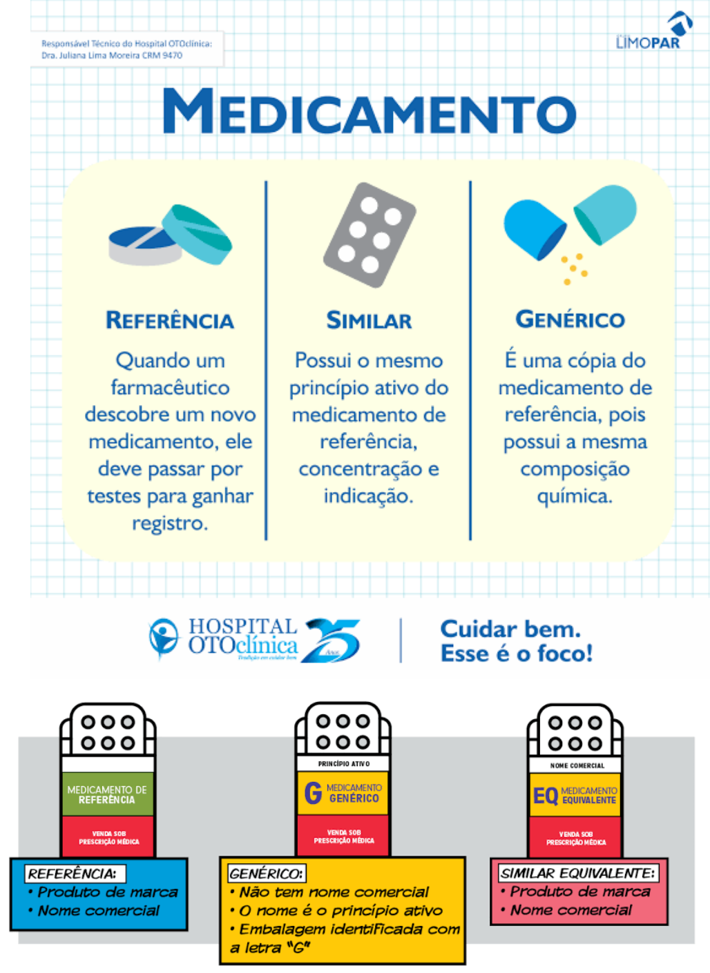 Medicamento Referência - Produto inovador registrado na ANVISA e comercializado no país. Sua eficácia, segurança e qualidade são comprovadas cientificamente o pela ANVISA. Medicamento genérico - Medicamento similar a um produto de referência ou inovador, geralmente produzido após a expiração ou renúncia da proteção patentária ou de outros direitos de exclusividade. Possui o mesmo princípio ativo, na mesma dose e forma farmacêutica, administrado pela mesma via, tem a mesma posologia e indicação terapêutica, tendo sua eficácia, segurança e qualidade comprovadas cientificamente. Ele é intercambiável com o medicamento de referência, ou seja, o substitui de forma segura, pois os testes de equivalência terapêutica, equivalência farmacêutica e bioequivalência são obrigatoriamente realizados. Medicamento Similar - Aquele que contém o mesmo ou os mesmos princípios ativos, apresenta a mesma concentração, forma farmacêutica, via de administração, posologia e indicação do medicamento de referência registrado na ANVISA, podendo diferir somente em características relativas ao tamanho e forma do produto, prazo de validade, embalagem, rotulagem, excipientes e veículos, devendo sempre ser identificado por nome comercial ou marca.