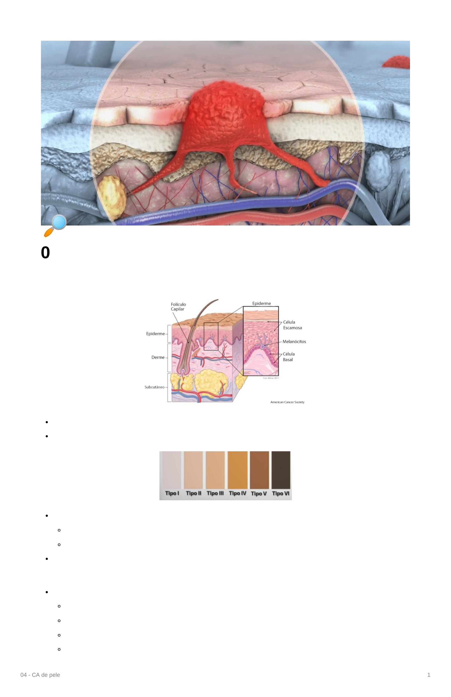 04 - CA de pele 1 🔎 04 - CA de pele Pele Proteção contra a radiação solar (melanina, pele e células de defesa) Fototipos de Fitzpatrick Radiação solar ultravioleta UVA - penetra camadas mais profundas, constante durante o dia e gera o fotoenvelhecimento UVB - presente no horário de pico, atinge camadas supericiais e gera as queimaduras solares Proteção solar Fotodermatoses Exposição a curto prazo Ocorrem em áreas fotoexpostas Efélides (sardas) Queimadura de 1° grau - eritema Queimadura de 2° grau - flictenas (bolhas) 04 - CA de pele 2 Exposição a longo prazo Melanose solar (funcionam como efélides) Elastose solar Leucodermia gutata Lesões pré malignas Queratose actínica Mais comum Radiação UV → queratinócitos aberrantes Áreas fotoexpostas Risco de transformação para CEC Tratamento: cremtes tópicos (5 fluorouracil), criocirurgia, curetagem Corno cutâneo Acúmulo de material queratinizado Tratamento = excisão Câncer de pele Carcinoma basocelular 04 - CA de pele 3 Carcinoma espinocelular Melanoma cutâneo → mais metástase Outros: sarcomas cutâneos, tumores de anexos Fatores de risco Carcinoma basocelular 75 % dos casos Forma-se da epiderme e dos folículos pilosos Restrito a pele contendo unidades pilosebáceas Câncer mais comum Sem lesões precursoras Menos agressivo dos CA de pele → invasão local Deriva as células da camada basal 04 - CA de pele 4 Fatores de risco UVA/UVB Radiação ionizante Arsênico Quadro clínico Malignidade local 2/3 superior da face, tronco e MMSS Não acomete palma, planta e mucosas 6 tipos Diagnóstico: biópsia Tratamento: cirurgia (margens devem ser bem avaliadas) Carcinoma espinocelular 20 % dos casos 2° mais comum Mais comum em transplantados Metástase em 6% (quando sobre cicatrizes 40%) São, algumas vezes, resultados de lesões pré-malignas Deriva dos queratinócitos da camada espinhosa Proliferação atípica - mutação P53 Lesões precursoras: QA, leucoplasia, eritroplasia, radiodermite, úlceras e cicatrizes Fatores de risco UVA/UVB Fumo 04 - CA de pele 5 HPV Doença de Bowen CEC - In Situ CEC in situ → transformação em 5% Tratamento = queratose actínica No pênis → transformação em 33% Papulose Bowenoide (corpo) Eritroplasia de Queyrat (mucosa) Quadro clínico Malignidade local e invasivo Localização: rosto, orelha, lábios, pescoço, dorso da mão, mucosa bucal e genital Pele Pápula ceratósica, nódulo endurado, ulceração de base endurada, lesão úlcero-vegetante Mucosa Lábio inferior Carcinoma verrucoso Variante: Queratoacantoma Nódulo acentuadamente circunscrito, crateriforme, com rolha queratósica central Pode haver resolução espontânea - cicatriz atrófica 1 - Diagnóstico diferencial: candidíase 04 - CA de pele 6 Cabeça e extremidades Solitário, em idosos, em áreas de exposição solar Diagnóstico: biópsia Tratamento: cirurgia (margens devem ser bem avaliadas) CEC de alto risco - 4 a 6 mm d margem Melanoma cutâneo 5% dos casos Altamente invasivo Produz metástases facilmente Alta mortalidade se não diagnosticado precocemente Fatores de risco Quadro clínico Mudanças de lesões pré-existentes Aparecimento de lesão pigmentada irregular Aumento do diâmetro ou espessura da lesão Mudança de cor e/ou variação no padrão de pigmentação Sangramente Prurido Ulceração 04 - CA de pele 7 Tipos Extensivo superficial Mácula pigmentar irregular, crescimento progressivo, mudanças de aspecto Melanoma nodular Nódulo ou pápula enegrecida, azulada ou amelanótica Melanoma Nodular Amelanótico Melanoma - Lentigo maligno Lesões planas pigmentadas e irregulares Bom prognóstico 04 - CA de pele 8 Melanoma Acral Lentiginoso Mácula negra ou acastanhada Rastramento Indicar acompanhamento especializado Exame dermatológico completo anual de todos familiares de primeiro grau Primeiro exame deve ser realizado aos 10 anos (exceção: nevos congênitos) Gravidez e puberdade requerem maior atenção Mapeamento corporal total Fotordermatoscopia seriada Diagnóstico ABCDE - Dermatoscopia Baixa sensibilidade e especificidade Biópsia No melanoma é preciso fazer uma nova abordagem após o estadiamento 04 - CA de pele 9 Estadiamento T: profundidade > Breslow, n° de mitoses, ulceração N: linfonodos: n°, carga tumoral, linfonodo satélite ou em trânsito M: metástases Tratamento Identificação da lesão primária Biópsia e exame anatomopatológico Ampliação de margens Tratamento da base linfonodal Linfonodo sentinela Tratamento adjuvante Outros tratamentos: Quimioterapia sistêmica, quimioterapia por perfusão isolada de membro, imunoterapia, vacina terapêtica, radioterapia Prognóstico Espessura do tumor - pior prognóstico Outros tipos histológicos Carcinoma de Célula de Merkel - CCM Carcinoma neuroendócrino primário de pele Oncovírus Merkel cell polyomavirus Nódulo cutâneo ou subcutâneo solitáro, cupuliforme vermelho-roseo ou violáceo, firme, de rápio crescimento, assintomático 04 - CA de pele 10 Dermatofibrossarcoma protuberante Sarcoma de crescimento lento, assintomático, localmente agressivo, de baixa malignidade que raramente dá metastases Adultos jovens a meia idade Sexo masculino Tronco, extremidades proximais, cabeça e pescoço Placa cor da pele, endurecida nódulo violáceos a vermelho acastanhado, lesão sólida e aderida ao subcutâneo