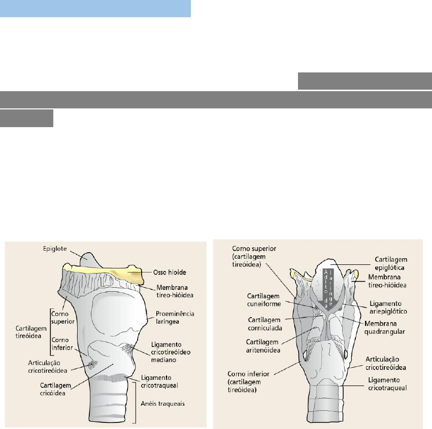 Otorrinolaringologia AC- Maciana Melo AC- Otavio Brasileiro Pereira Anatomia e Fisiologia da Laringe 1. Anatomia A laringe é um importante e complexo órgão musculocartilaginoso que desempenha uma série de atividades fisiológicas. Dentre elas, podem-se destacar a esfincteriana (protetora da via aérea), a respiratória e a fonatória. Esse órgão multifuncional está situado na região infra-hiode, no nível das vértebras C3 a C6. Ou seja, localiza-se a partir da porção laríngea da faringe até a margem inferior da cartilagem cricóide. O esqueleto da laringe é constituído por 9 cartilagens ao todo (3 ímpares e 3 pares) que se articulam através de membranas, ligamentos e pregas. A maior cartilagem chama-se tireóidea. Cartilagem Tireoide (1) - é a maior das cartilagens, mediana e ímpar. Apresenta duas lâminas fundidas na linha média formando a proeminência laríngea. Posteriormente, essa cartilagem projeta, em cada lâmina, o corno superior e o corno inferior. Os limites superiores da tireóidea são fixados ao hioide pela membrana tíreo-hióidea. Inferiormente, os cornos inferiores estão ligados à superfícies laterais da cartilagem cricóidea formando as chamadas articulações cricotireóideas. A cartilagem Cricóidea (1) - é a única cartilagem hialina da via aérea que possui um anel completo. Ela tem formato de um anel com medalhão (anel de sinete), sendo este voltado para trás. Está situada logo abaixo da tireoide, onde se fixa através do ligamento cricotireóideo mediano, e acima do primeiro arco traqueal, através do ligamento cricotraqueal. As Aritenóideas (2) - são pares, hialinas, uma para cada lado, em forma de pirâmide triangular de grande eixo vertical. Elas estão apoiadas sobre a cricóide. A base da cartilagem aritenóidea apresenta o processo vocal, que permite a inserção posterior do ligamento vocal, e o processo muscular, onde se inserem os músculos cricoaritenóideos posterior e lateral. Superiormente, em cada lado, tem-se o ápice, que está fixado à prega ariepiglótica e apoia a cartilagem corniculada (de Santorini). Na região anterossuperior dessa cartilagem, na membrana quadrangular, encontra-se a cartilagem cuneiforme (de Wrisberg), que não se fixa diretamente em nenhuma outra cartilagem. A Epiglote (1) - também chamada de cartilagem epiglótica, é uma cartilagem ímpar, elástica, revestida por mucosa localizada no orifício superior da laringe. Funciona à maneira de opérculo protetor das vias aéreas inferiores durante a deglutição. Está situada atrás da base da língua e do osso hioide, estando ligada anteriormente pelas pregas glossoepiglóticas e pelo ligamento hioepiglótico e, na parte posterior, pelas pregas ariepiglóticas. As Corniculadas e Cuneiformes (4) - se localizam superiormente as cartilagens aritenoides como um prolongamento superior. 2. Segmentação A laringe pode ser dividida, anatomofuncionalmente, em três regiões: supraglótica, glótica e subglótica (ou infraglótica). A glote ou região glótica é a que se encontra no nível das pregas vocais, que formam o aparelho vocal da laringe. Acima dela, tem-se a supraglote ou vestíbulo da laringe, até o ádito da laringe. Abaixo, tem-se a subglote, até a margem inferior da cricóidea. O ádito da laringe é, propriamente, a abertura da cavidade laríngea, compreendida anteriormente pelas margens anterossuperiores da epiglote; posteriormente pelas cartilagens aritenóideas, corniculadas e prega interaritenóidea; e lateralmente pelas pregas ariepiglóticas, inclusive as cartilagens cuneiformes. As pregas vestibulares, também denominadas pregas vocais falsas, são duas pregas espessas, constituídas por fibras do músculo tireoaritenóideo, estandorecobertas por uma mucosa rósea. Localizam-se acima das pregas vocais (verdadeiras), estendendo-se da tireóidea às aritenóideas. Os recessos laterais entre essas pregas vestibulares e as pregas vocais são chamados de ventrículos (de Morgagni). As pregas vocais (pregas vocais verdadeiras) são compostas, essencialmente, do músculo vocal e do ligamento vocal, recobertos por mucosa. A rima da glote, ou fenda glótica, é o espaço entre as pregas vocais, que varia de acordo com a posição delas. A comissura anterior é representada pela união anterior das pregas vocais verdadeiras em suas inserções na cartilagem tireóidea; *a região interaritenóidea representa a parede posterior da glote. 3. Musculatura A musculatura é dividida e intrínseca e extrínseca: A musculatura Intrínseca - Os efeitos da contratura dos músculos intrínsecos da laringe são responsáveis pela sua movimentação, modificando o posicionamento, o nível vertical, o comprimento e a tensão das pregas vocais, além do tamanho e do formato da rima da glote. Os músculos intrínsecos são os seguintes: · Tireoaritenoideo (par): forma a prega vocal e se insere na cartilagem tireoide e no processo vocal da cartilagem aritenoide. Sua porção medial é chamado de musculo vocal. · Aritenoide transversos e oblíquos: unem uma cartilagem aritenoide a seu par contralateral. Faz adução da prega vocal. Os oblíquos são dois músculos cruzados (músculos ariepiglóticos). · Cricoaritenóide Posterior(par): musculo par que liga a face posterior da aritenoide a cartilagem cricóide com o processo muscular da aritenoide. É um adutor das pregas vocais e tensor. Possui dois compartimentos: lateral ou vertical e obliquo. · Cricoaritenoide Lateral(par): da boda superior e lateral da cartilagem cricóide até o processo muscular da aritenoide. Adutor das pregas vocais. · Cricotireóideo(par): da superfície anterolateral da cartilagem cricóide até a borda inferior da cartilagem tireoide. * É considerado o principal musculo tensor da prega vocal. Musculatura extrínseca – composta por músculos provenientes das estruturas não laríngeas que se relacionam com estruturas externas da laringe, inferindo de modo direto na fonaçã
