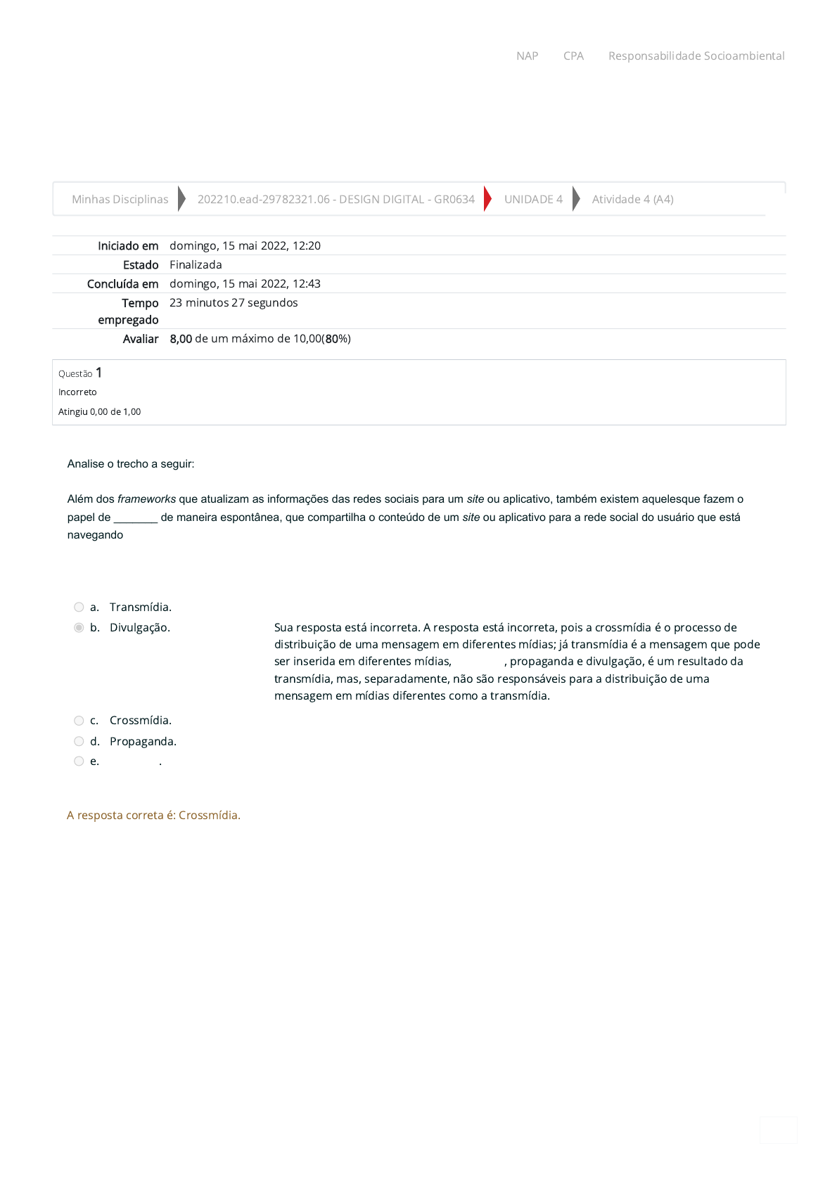 15/05/2022 12:44 Atividade 4 (A4): Revisão da tentativa https://ambienteacademico.com.br/mod/quiz/review.php?attempt=437889&cmid=160297#question-453411-6 1/8 Minhas Disciplinas 202210.ead-29782321.06 - DESIGN DIGITAL - GR0634 UNIDADE 4 Atividade 4 (A4) Iniciado em domingo, 15 mai 2022, 12:20 Estado Finalizada Concluída em domingo, 15 mai 2022, 12:43 Tempo empregado 23 minutos 27 segundos Avaliar 8,00 de um máximo de 10,00(80%) Questão 1 Incorreto Atingiu 0,00 de 1,00 Analise o trecho a seguir: Além dos frameworks que atualizam as informações das redes sociais para um site ou aplicativo, também existem aquelesque fazem o papel de _______ de maneira espontânea, que compartilha o conteúdo de um site ou aplicativo para a rede social do usuário que está navegando no site. Assinale a alternativa que preenche corretamente a lacuna. a. Transmídia. b. Divulgação. Sua resposta está incorreta. A resposta está incorreta, pois a crossmídia é o processo de distribuição de uma mensagem em diferentes mídias; já transmídia é a mensagem que pode ser inserida em diferentes mídias, marketing, propaganda e divulgação, é um resultado da transmídia, mas, separadamente, não são responsáveis para a distribuição de uma mensagem em mídias diferentes como a transmídia. c. Crossmídia. d. Propaganda. e. Marketing. A resposta correta é: Crossmídia. NAP CPA Responsabilidade Socioambiental https://ambienteacademico.com.br/my/ https://ambienteacademico.com.br/course/view.php?id=6166 https://ambienteacademico.com.br/course/view.php?id=6166§ion=6 https://ambienteacademico.com.br/mod/quiz/view.php?id=160297 https://codely-fmu-content.s3.amazonaws.com/Moodle/NAP/inicial/nap/fmu/index.html https://codely-fmu-content.s3.amazonaws.com/Moodle/CPA/landing_CPA/index.html https://portal.fmu.br/sustentabilidade 15/05/2022 12:44 Atividade 4 (A4): Revisão da tentativa https://ambienteacademico.com.br/mod/quiz/review.php?attempt=437889&cmid=160297#question-453411-6 2/8 Questão 2 Correto Atingiu 1,00 de 1,00 No momento do desenvolvimento da codificação de framework, é importante que o designer digital observe se as equipes de programação de códigos e arquitetura de informação estão se preocupando com as nomenclaturas dos códigos que fazem parte da programação. Sobre o desenvolvimento de codificação de framework, analise as asserções a seguir e a relação proposta entre elas. I. As nomenclaturas no desenvolvimento de um framework são importantes, pois um de seus objetivos é que ele possa ser utilizado em outros projetos. Porque: II. A codificação de um framework precisa ser de fácil entendimento para outros profissionais. Assinale a alternativa correta. a. As asserções I e II são proposições verdadeiras, e a II é uma justi�cativa correta da I. Resposta correta. A alternativa está correta, pois a asserção I é verdadeira, uma vez que as nomenclaturas no desenvolvimento de um framework são importantes para padronizar e facilitar o seu uso em outros projetos. A asserção II também é verdadeira, pois as nomenclaturas padronizadas da codi�cação de um framework facilitam a compreensão de outros pro�ssionais, que possam utilizar o mesmo framework em outro projeto, facilitando a sua manipulação, edição e adaptação para cada projeto. Assim, a asserção II é uma justi�cativa correta da I. b. A asserção I é uma proposição falsa, e a II é uma proposição verdadeira. c. A asserção I é uma proposição verdadeira, e a asserção II é uma proposição falsa. d. As asserções I e II são proposições falsas. e. As asserções I e II são proposições verdadeiras, mas a II não é uma justi�cativa correta da I. A resposta correta é: As asserções I e II são proposições verdadeiras, e a II é uma justi�cativa correta da I. NAP CPA Responsabilidade Socioambiental https://codely-fmu-content.s3.amazonaws.com/Moodle/NAP/inicial/nap/fmu/index.html https://codely-fmu-content.s3.amazonaws.com/Moodle/CPA/landing_CPA/index.html https://portal.fmu.br/sustentabilidade 15/05/2022 12:44 Atividade 4 (A4): Revisão da tentativa https://ambienteacademico.com.br/mod/quiz/review.php?attempt=437889&cmid=160297#question-453411-6 3/8 Questão 3 Correto Atingiu 1,00 de 1,00 No processo de criação de um framework que pode ser para o uso específico em dispositivos mobile, desktop ou ser utilizados em ambos, a padronização é importante em todos os sentidos, desde nas nomenclaturas como em tudo que envolve a estrutura da codificação. Também existem alguns componentes que existem praticamente na maioria de todos os frameworks. É importante que no momento do desenvolvimento de um framework, tenham alguns componentes que são utilizados na maioria dos frameworks. A partir do exposto, associe tais componentes a algumas de suas características. I. Grid. II. Tipografia. III. Formulários. ( ) Está relacionado ao layout, ele pode ser flutuante com colunas com tamanho fixo em pixels ou flexíveis. ( ) Está relacionado a elementos como os links, títulos, listas, parágrafos, textos e números inseridos na página. ( ) Está relacionado a elementos que compõem os dados, e que podem ser preenchidos com textos e números. Assinale a alternativa que apresenta a sequência correta. a. II, I, III. b. II, III, I. c. III, II, I. d. III, I, II. e. I, II, III. Resposta correta. A alternativa selecionada está correta, pois está relacionada ao layout que pode ser �utuante e com colunas com tamanho �xo em pixels ou �exíveis = Grid. Está relacionado a elementos como os links, títulos, listas, parágrafos, textos e números inseridos na página = Tipogra�a. Está relacionado a elementos que compõe os dados que podem ser preenchidos com textos e número = Formulários. A resposta correta é: I, II, III. NAP CPA Responsabilidade Socioambiental https://codely-fmu-content.s3.amazonaws.com/Moodle/NAP/inicial/nap/fmu/index.html https://codely-fmu-content.s3.amazon