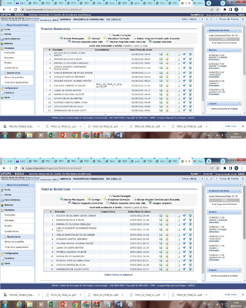 Segue os alunos que enviaram o trabalho pelo SIGA A, outros coletei do meu email. Trabalhos 01 enviados pelo SIGA A Trabalhos 02 enviados pelo SIGA A Amigos, por gentileza, verifique na planilha abaixo, se está tudo certo com os trabalhos enviados e se não estiver, envie no privado no whatsap o print do seu email indicando que você enviou os trabalhos na data combinada, até segunda-feira 09/05/22 as 9h (a não justificativa da ausência do trabalho o mesmo será considerado como nulo), dos alunos que estão como FALTOU. Alunos/TRABALHO III NOTA Trab 01 Trab 02 1 ADILTON DE OLIVEIRA LEITAO JUNIOR 1 1 2 ALINE GAMBOA DA COSTA SANTANA FALTOU FALTOU 3 AMANDA DA SILVA E SILVA 1 1 4 ANA AMELIA CARDOSO MONTEIRO FALTOU FALTOU 5 ANA CASSIA SOUSA CIPRIANO FALTOU FALTOU 6 ANDREZA ARAGAO DE SOUSA FALTOU FALTOU 7 BRENDA DE OLIVEIRA REBOUÇAS 1 1 8 CARLOS AUGUSTO GUIMARAES FARIAS FILHO 1 1 9 CARLOS BARBOSA DE SOUZA JUNIOR 1 1 10 DARLISON SANTOS JERONIMO 1 1 11 DEUZINA HELENA TEIXEIRA FRAZÃO 1 1 12 EVA ALICE CAMPOS DE SOUSA 1 FALTOU 13 HASSIMA THAYNA SIMOES RODRIGUES 1 1 14 JADMA SIQUEIRA JOSINO 1 FALTOU 15 JOCICLEI SILVA DE SOUSA 1 FALTOU 16 LOUISE PICANÇO MONTE FALTOU FALTOU 17 LUANA DA COSTA SANTOS 1 1 18 MATHEUS OLIVEIRA VALENTE 1 1 19 NAYARA DE SOUSA BENTES 1 1 20 RAILANE DOS SANTOS SILVA FALTOU FALTOU 21 RAIMUNDO SINVAL DE SOUSA TAVEIRA JUNIOR 1 1 22 RODRIGO JOSE OLIVEIRA VIANA 1 1 23 TAIANE GOMES DE JESUS FALTOU FALTOU 24 THALITA HELLEN GARCIA DOS SANTOS FALTOU FALTOU 25 VALDIANE MONTEIRO RODRIGUES FALTOU FALTOU 26 VINICIUS SANTOS DA SILVA 1 1 27 WANDESSON DE SOUSA COSTA 1 1 28 WEYDER ROBERTO MOREIRA DE SOUSA FALTOU FALTOU