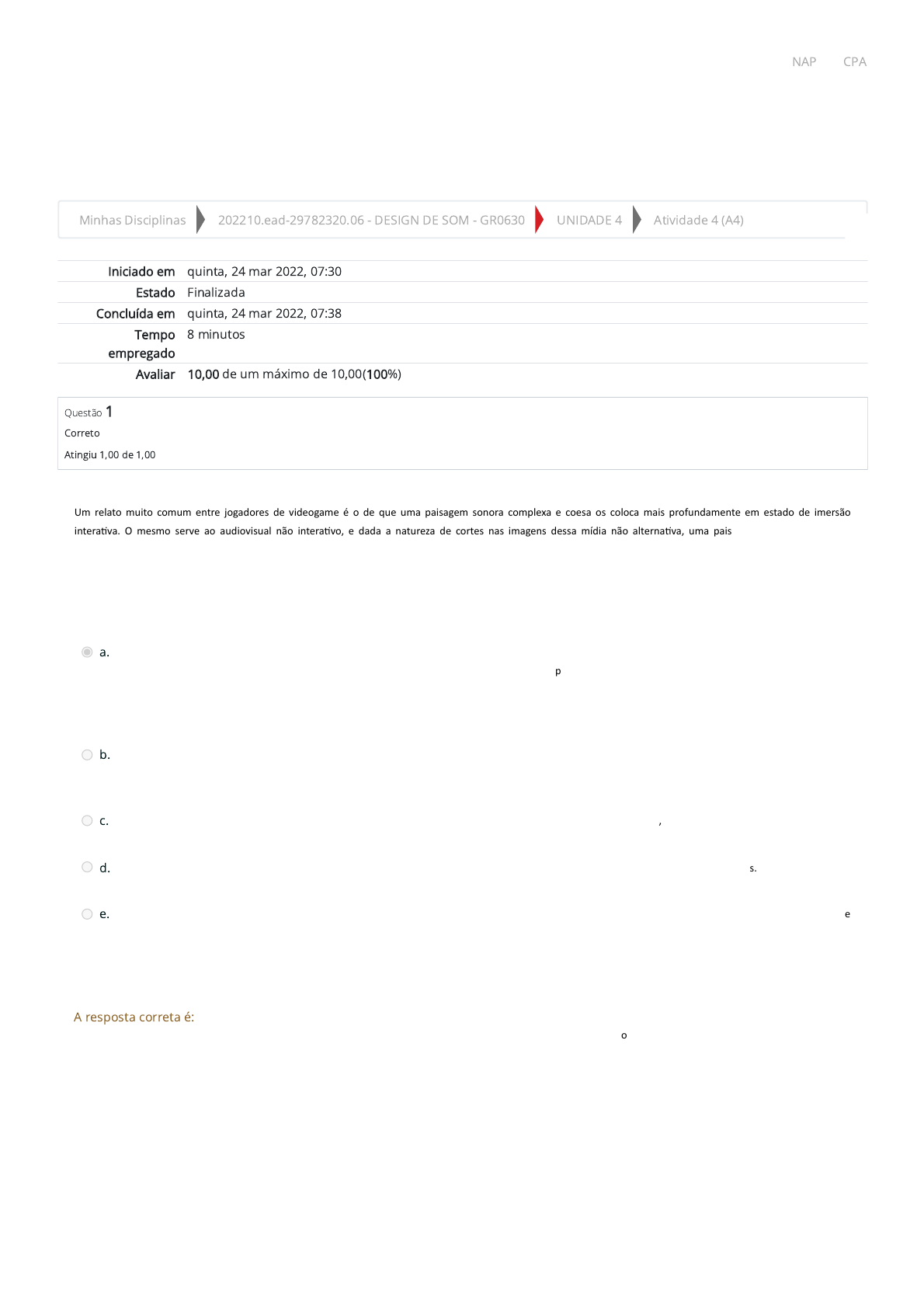 24/03/2022 07:38 Atividade 4 (A4): Revisão da tentativa https://ambienteacademico.com.br/mod/quiz/review.php?attempt=128346&cmid=167547 1/8 Minhas Disciplinas 202210.ead-29782320.06 - DESIGN DE SOM - GR0630 UNIDADE 4 Atividade 4 (A4) Iniciado em quinta, 24 mar 2022, 07:30 Estado Finalizada Concluída em quinta, 24 mar 2022, 07:38 Tempo empregado 8 minutos Avaliar 10,00 de um máximo de 10,00(100%) Questão 1 Correto Atingiu 1,00 de 1,00 Um relato muito comum entre jogadores de videogame é o de que uma paisagem sonora complexa e coesa os coloca mais profundamente em estado de imersão intera�va. O mesmo serve ao audiovisual não intera�vo, e dada a natureza de cortes nas imagens dessa mídia não alterna�va, uma paisagem sonora complexa e convincente é primordial para que se perceba este universo visual descon�nuo de forma fluente. Escolha a alterna�va que não oferece afirmações válidas sobre a atuação da edição de som no processo de imersão do espectador: a. A aplicação de fades não é necessária em cenas em que há muitos elementos sonoros simultâneos, pois não se percebe o início e final de arquivos sonoros. Por mais que em sistemas de som menos responsivos e em situações mais ruidosas os fades sejam mais discretos, uma sala de cinema pode trazer descon�nuidades sonoras até a ouvidos menos treinados e os fades são parte essencial da construção da imersividade junto com o sincronismo e a coesão com a realidade. b. A paisagem sonora, algo que experienciamos todos os dias de maneira caó�ca, pode ser manipulada na etapa de edição de acordo com as mo�vações cria�vas do designer de som. c. Descon�nuidades lógicas na paisagem sonora construída, como trânsito intenso na madrugada ou corujas ao meio dia, atrapalham a imersão do espectador. d. Devem-se atenuar os cortes sonoros das tonalidades de sala (room tones) através de fades e aplicação de trilhas de ambiente convincentes. e. A atenção a detalhes não técnicos como aves �picas, idioma de burburinhos, presença de elementos sonoros marcantes constrói coesão para a percepção de realidade inconsciente. A resposta correta é: A aplicação de fades não é necessária em cenas em que há muitos elementos sonoros simultâneos, pois não se percebe o início e final de arquivos sonoros. NAP CPA https://ambienteacademico.com.br/my/ https://ambienteacademico.com.br/course/view.php?id=6284 https://ambienteacademico.com.br/course/view.php?id=6284§ion=6 https://ambienteacademico.com.br/mod/quiz/view.php?id=167547 https://outlook.office365.com/owa/calendar/NAPFMU@unifmubr.onmicrosoft.com/bookings/ https://codely-fmu-content.s3.amazonaws.com/Moodle/CPA/landing_CPA/index.html 24/03/2022 07:38 Atividade 4 (A4): Revisão da tentativa https://ambienteacademico.com.br/mod/quiz/review.php?attempt=128346&cmid=167547 2/8 Questão 2 Correto Atingiu 1,00 de 1,00 Em uma situação de gravação de som direto para um projeto audiovisual, um ator improvisou para fora do roteiro e trouxe intensidade vocal inesperada para a cena, de modo que o TSD (técnico de som direto) não conseguiu se adaptar e aquela fala estourou. Ao enfrentar essa situação, o TSD imaginou as seguintes coisas: I. Vou pedir para o ator não gritar na cena. II. Não vou contar a ninguém que o som estourou. III. Vou me adaptar ao improviso no próximo take. IV. Ou vou gravar tudo mais baixo para que o grito não seja clipado. V. Vou anotar o problema no bole�m Qual (is) desses pensamentos o TSD deve seguir? a. Pensamentos III e V O TSD deve se adaptar a movimentos emocionais (premeditados ou improvisados) das peças e cenas que é responsável por gravar, assim como deve anotar detalhes posi�vos e nega�vos técnicos e situacionais de suas gravações em um bole�m de som para auxiliar a montagem de imagem e som. b. Todos os pensamentos c. Pensamentos II e IV d. Pensamentos I, II, III e e. Nenhum dos pensamentos A resposta correta é: Pensamentos III e V NAP CPA https://outlook.office365.com/owa/calendar/NAPFMU@unifmubr.onmicrosoft.com/bookings/ https://codely-fmu-content.s3.amazonaws.com/Moodle/CPA/landing_CPA/index.html 24/03/2022 07:38 Atividade 4 (A4): Revisão da tentativa https://ambienteacademico.com.br/mod/quiz/review.php?attempt=128346&cmid=167547 3/8 Questão 3 Correto Atingiu 1,00 de 1,00 Questão 4 Correto Atingiu 1,00 de 1,00 Os avanços tecnológicos na área do som permi�ram captações, edições e mixagens muito mais refinadas, com endereçamento tridimensional do som para as caixas 5.1, ambientes minimalistas com elementos su�lmente manipulados, etc. Este preenchimento maior e mais premeditado de uma sala de cinema (e uma obra cinematográfica), por irônico que possa parecer, torna momentos de silêncio mais impactantes justamente pelo contraste. Sobre este efeito de suspensão sonora, pode-se afirmar que a. implica que uma equipe de menor dimensão pode ser u�lizada já que há momentos sem som. b. gera desconforto no espectador, que fica sem entender por que as falas não estão mais sendo ouvidas. c. faz com que o momento dramá�co retratado pareça menos carregado de emoção e importância. d. gera suspensão de parte da realidade diegé�ca, desaceleração do tempo e destaque dramá�co. A saturação sonoro-espacial de uma sala com som em 5.1 canais e o detalhamento de paisagem sonora advindo dessa possibilidade faz com que os momentos de suspensão sonora, por contraste, amplifiquem o significado e o impacto de seus vazios. e. exclui a possibilidade de par�cipação em grandes premiações mundiais pela pobreza esté�ca intrínseca. A resposta correta é: gera suspensão de parte da realidade diegé�ca, desaceleração do tempo e destaque dramá�co. Um é pouco, dois é bom, três é demais? Depende. Quando busca-se dimensionar uma equipe de som para uma produção fonográfica ou audiovisual não existe resposta única. Três podem ser poucos assim como dois podem ser demais
