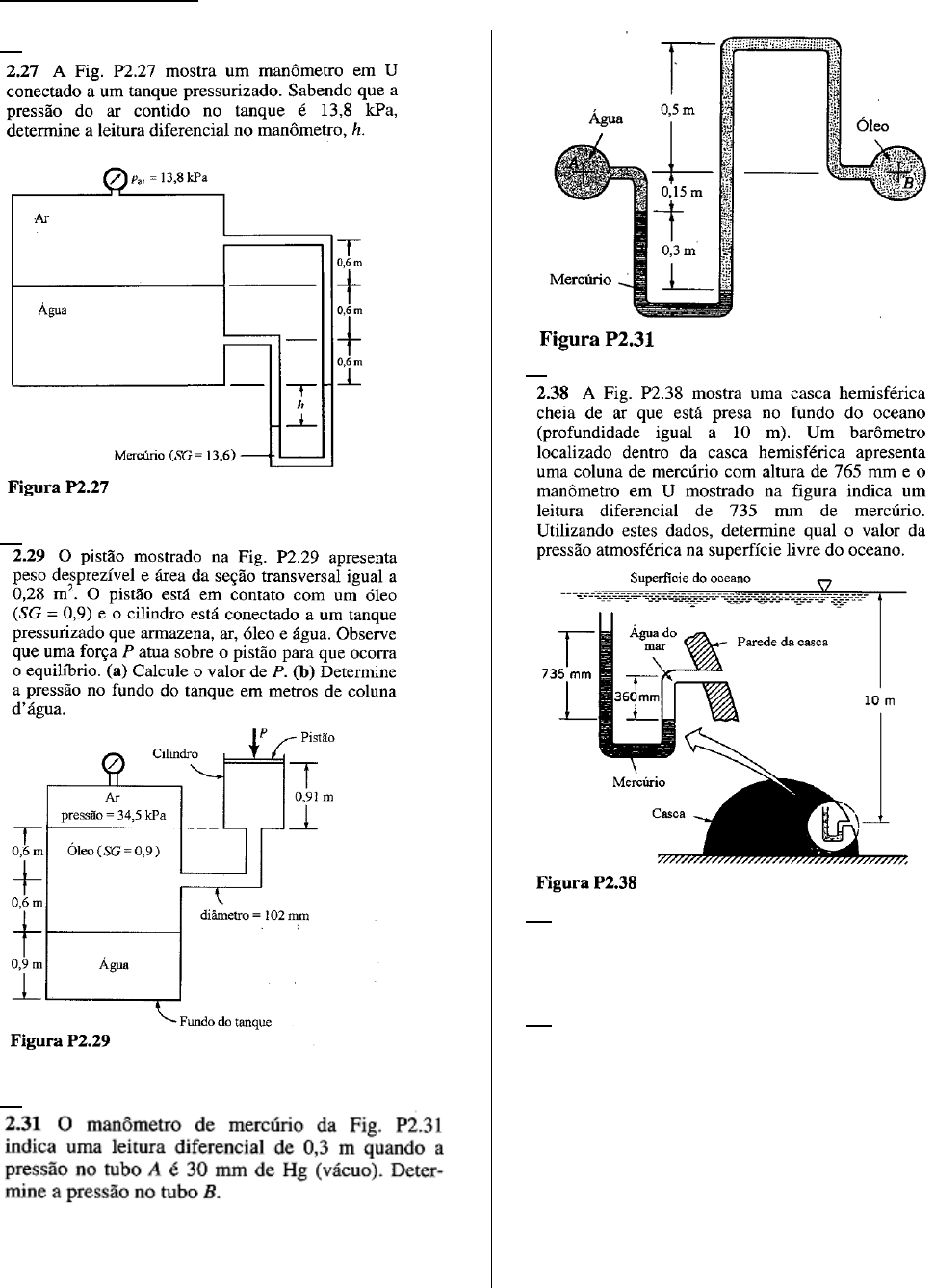 UNIVERSIDADE ESTADUAL DO NORTE FLUMINENSE DARCY RIBEIRO Curso: Engenharia de Produção Disciplina: Fenômenos de Transporte 2/2015 Lista de Exercícios 01 01 02 03 04 05 Uma pressão de 62,1 kPa (abs) corresponde a que pressão relativa se a pressão atmosférica local vale 101,3 kPa. 06 A altitude do pico de uma montanha é 4300 m. (a) Determine a pressão neste local considerando a variação de temperatura. (b) Se for admitido que o peso específico do ar é constante e igual a 1,2 N/m3, qual o valor da pressão nesta altitude? (c) Se for admitido que a temperatura é uniforme e igual a 15°C, qual é o valor da pressão nesta altitude? Admita que nas três situações a atmosfera ao nível do mar se comporta como a padrão. 07 08 A figura mostrada a seguir esboça um tanque cilíndrico, com tampa hemisférica, que contém água e está conectado a uma tubulação invertida. A densidade do líquido aprisionado na parte superior da tubulação é 0,8 e o resto da tubulação está repleto com água. Sabendo que a pressão indicada no manômetro montado em A é 60 kPa, determine: (a) a pressão em B, e (b) a pressão no ponto C. 09 10 11 Qual é o valor da pressão barométrica, em mm de Hg, para uma elevação de 4 Km na atmosfera padrão americana? (Use a tabela do apêndice C do livro indicado para estudo) 12 13 Um certo volume de água é colocado num tubo em U, aberto nas extremidades. Num dos ramos do tubo, adiciona-se um líquido de densidade menor do que a da água, o qual não se mistura com ela. Após o equilíbrio, a posição dos dois líquidos no tubo está corretamente representada pela figura: (justifique sua escolha) 14 Determine a força necessária para manter em equilíbrio um carro de 1000 Kg em uma prensa hidráulica cujos pistões têm área de seção transversal de 0,10 m2 e 0,01m2. 15 Um consumidor, desconfiado da qualidade da gasolina que comprou em um posto, resolveu testar a sua densidade. Em um sistema de vasos comunicantes, contendo inicialmente água de densidade igual a 1, despejou certa quantidade da gasolina. Após o equilíbrio, o sistema adquiriu a aparência abaixo representada. a) Determine a densidade da gasolina comprada. b) Considerando a altura da coluna de água (h=8cm) no vaso comunicante igual a 30 cm calcule a pressão relativa e absoluta em cada um dos lados dos tubos do vaso. 16 Um mergulhador que trabalhe à profundidade de 20 m no lago sofre, em relação à superfície, uma variação de pressão, em N/m2, devida ao líquido, estimada no SI em a) 20 ; b) 2,0 . 102; c) 2,0 . 103; d) 2,0 . 104; e) 2,0 . 105 17 O organismo humano pode ser submetido, sem consequências danosas, a pressão de, no máximo, 4,0·105 N/m2. Nestas condições qual a máxima profundidade recomendada a um mergulhador? Adote pressão atmosférica igual a 1,0·105 N/m2. 18 A Figura seguinte mostra uma comporta rígida (OAB), articulada em O, e que repousa sobre um suporte (B). Qual é o módulo da mínima força P horizontal necessária para manter a comporta fechada. Admita que a largura da comporta é igual a 3 m e despreze tanto o peso da comporta quando o atrito na articulação. Observe que a superfície externa da comporta está exposta a atmosfera. 14 - A barragem mostrada na Figura seguinte é construída com concreto (=23,6 kN/m3) e está simplesmente apoiada numa fundação rígida. Determine qual é o mínimo coeficiente de atrito entre a barragem e a fundação para que a barragem não escorregue. Admita que a água não provoca qualquer efeito na superfície interior da barragem e analise o problema por unidade de comprimento da barragem.