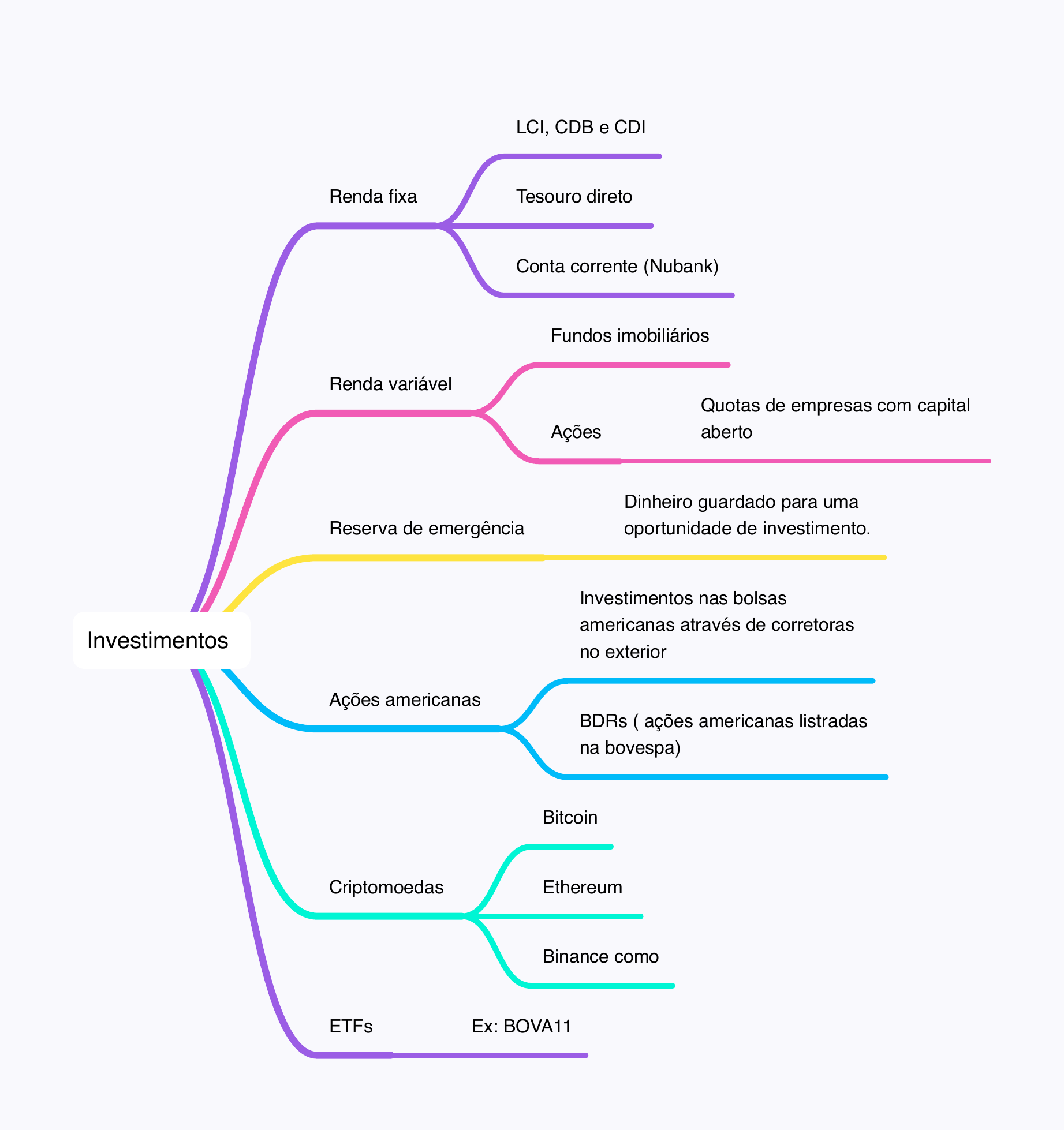 Renda fixa LCI, CDB e CDI Tesouro direto Conta corrente (Nubank) Renda variável Fundos imobiliários Ações Quotas de empresas com capital aberto Reserva de emergência Dinheiro guardado para uma oportunidade de investimento. Ações americanas Investimentos nas bolsas americanas através de corretoras no exterior BDRs ( ações americanas listradas na bovespa) Criptomoedas Bitcoin Ethereum Binance como ETFs Ex: BOVA11 Investimentos
